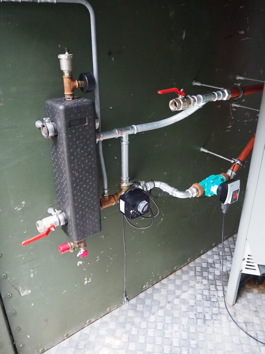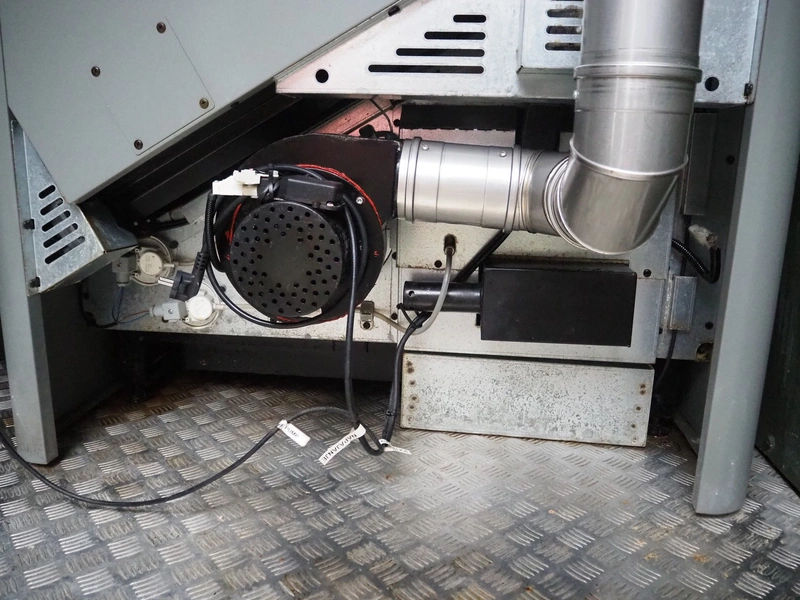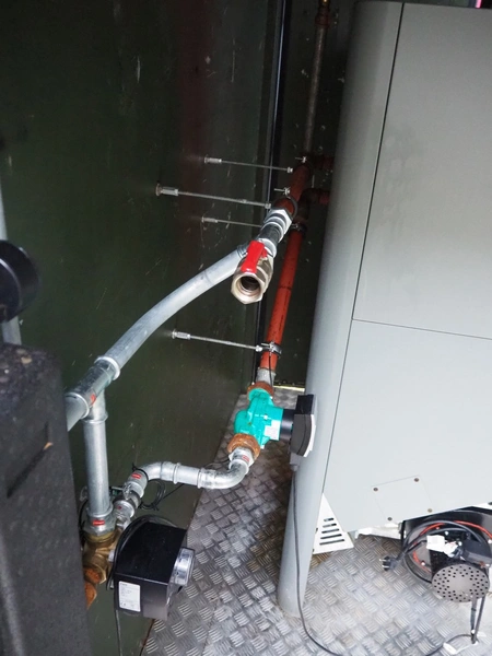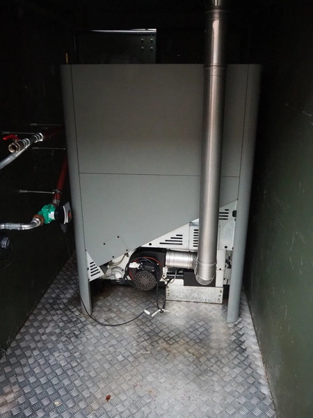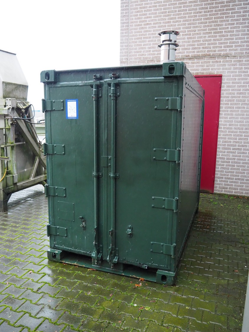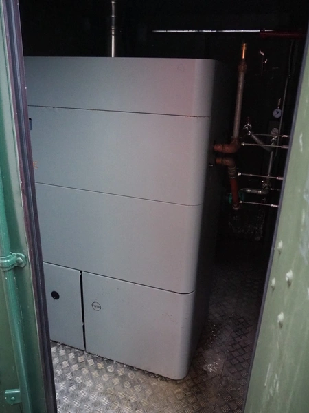 Container with Petric boiler, boiler type: K11 (pp 27 A), serial number: 5-16-007, year of construction: 2016, boiler power: 33 kW, fuel type: C1, wooden pallets, normal heat output: 32,97 kW, minimal heat output: 9,15 kW, power supply: 230 V, 50 Hz, 1,5 A, wattage: 341 W, water content: 85 L, maximum operating water temperature: 80 degrees Celsius, maximum allowable operating pressure: 2 bar, mass of boiler: 315 kg, total dimensions: 2450 mm x 1450 mm x 2650 mm.