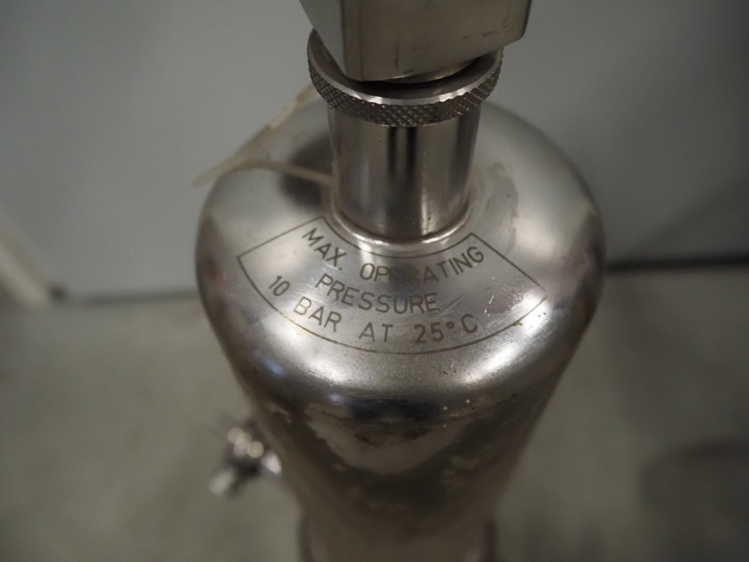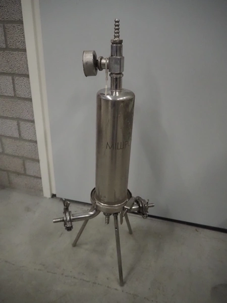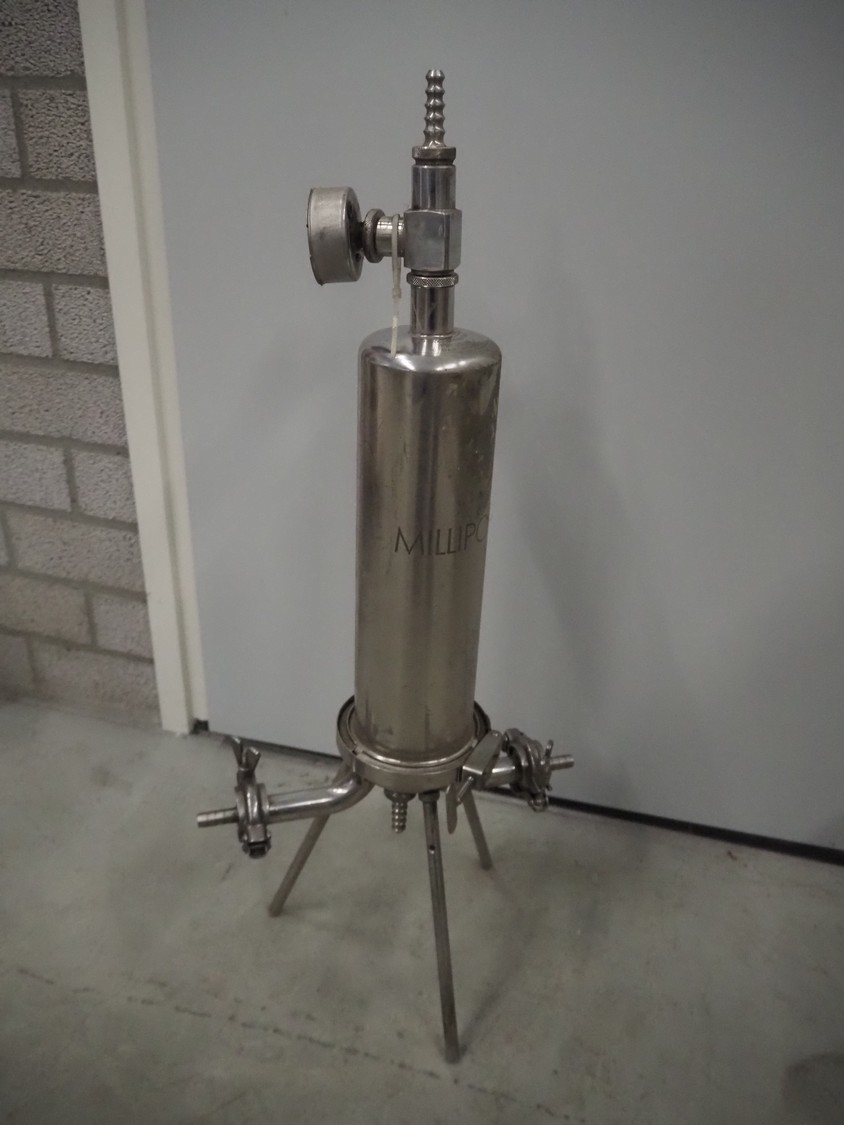 Millipore pressure filter housing, maximum pressure 10 bar at 25°C, dimensions: 350 mm x 200 mm x 800 mm.