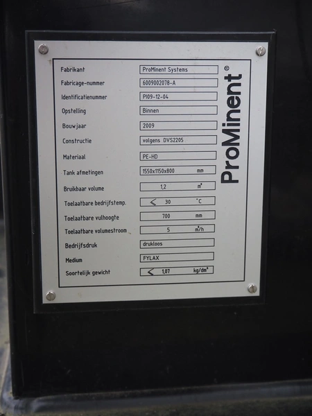 Prominet plastic tank, fabrication number: 6009002078-A, year of construction: 2009, filling height: 700 mm, total dimensions: 1800 mm x 1400 mm x 1250 mm.