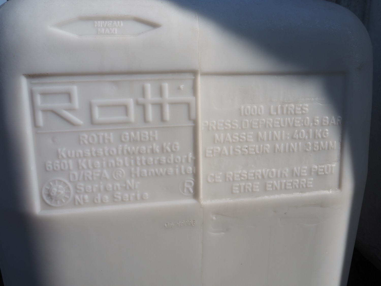 Roth Werke GmbH plastic tub, serial number: 10-10008, weight: 40.1 kg, volume: 1000 liter, dimensions: 1300 mm x 700 mm x 1350 mm.