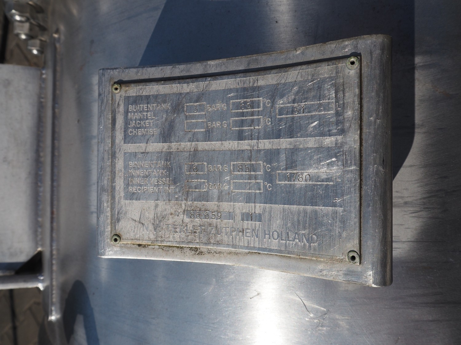 N.V. Terlet-Zutphen Holland double jacketed pressure tank, number: 86659, max pressure tank: 6 bar, max pressure jacket: 3 bar, dimensions: Ø 1150 mm x 3500 mm.