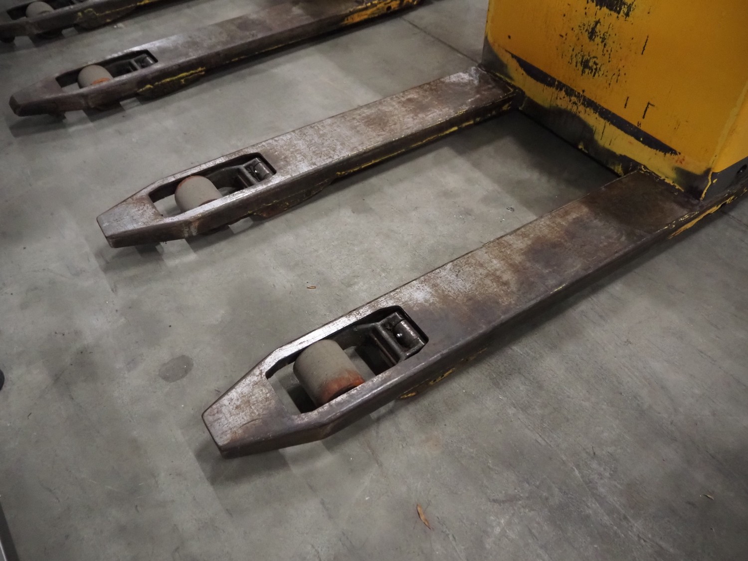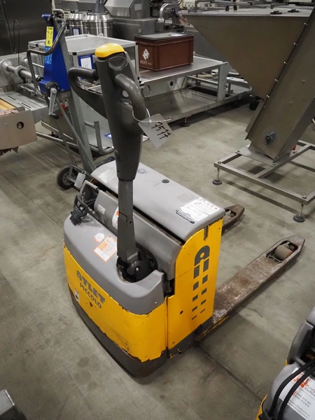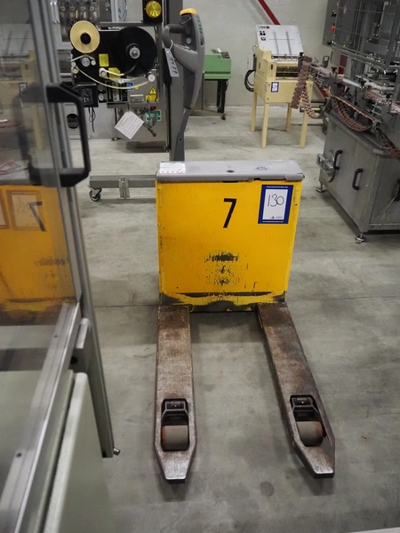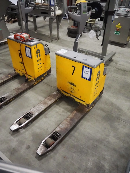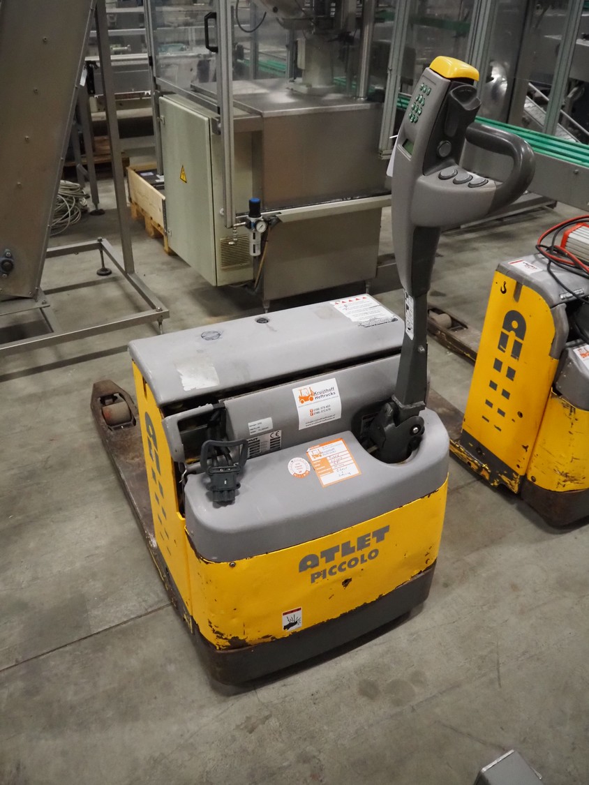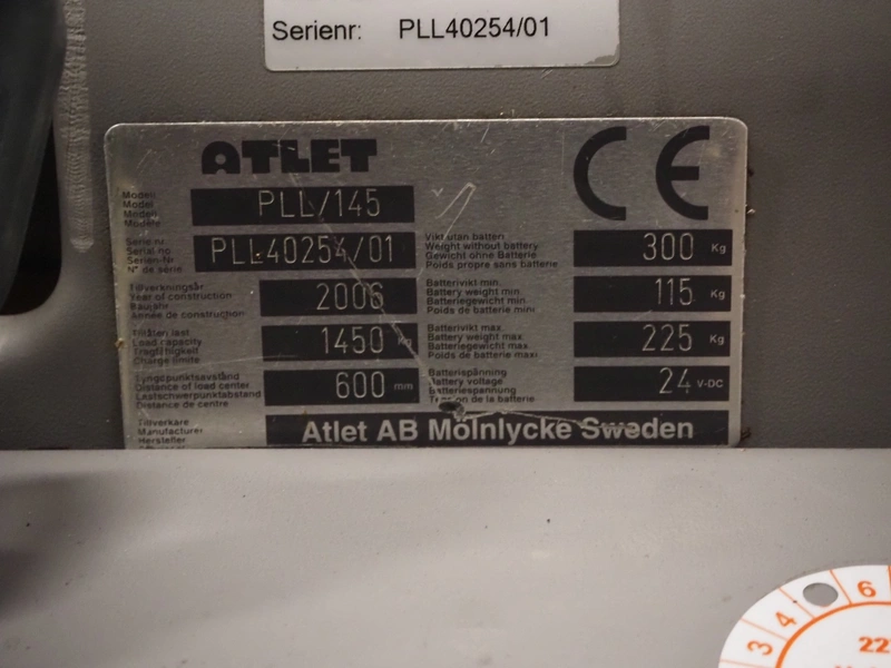 Atlet AB electric pallet lifter, model: PLL/145, serial number: PLL40254/01, year of construction: 2006, 24 V, loading capacity: 1450 kg, distance between forks: 600 mm, fork length: 1000 mm, total dimensions: 1460 mm x 680 mm x 1430 mm. Missing loading station.