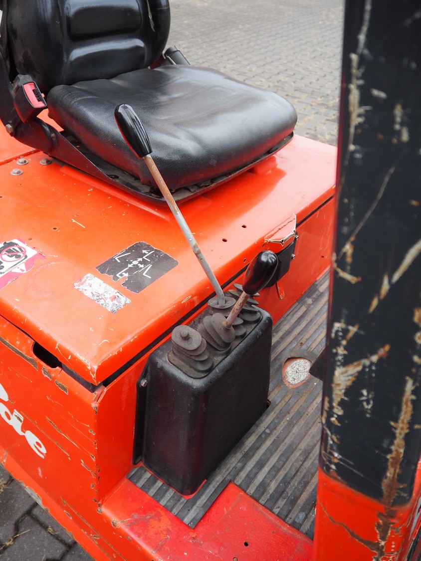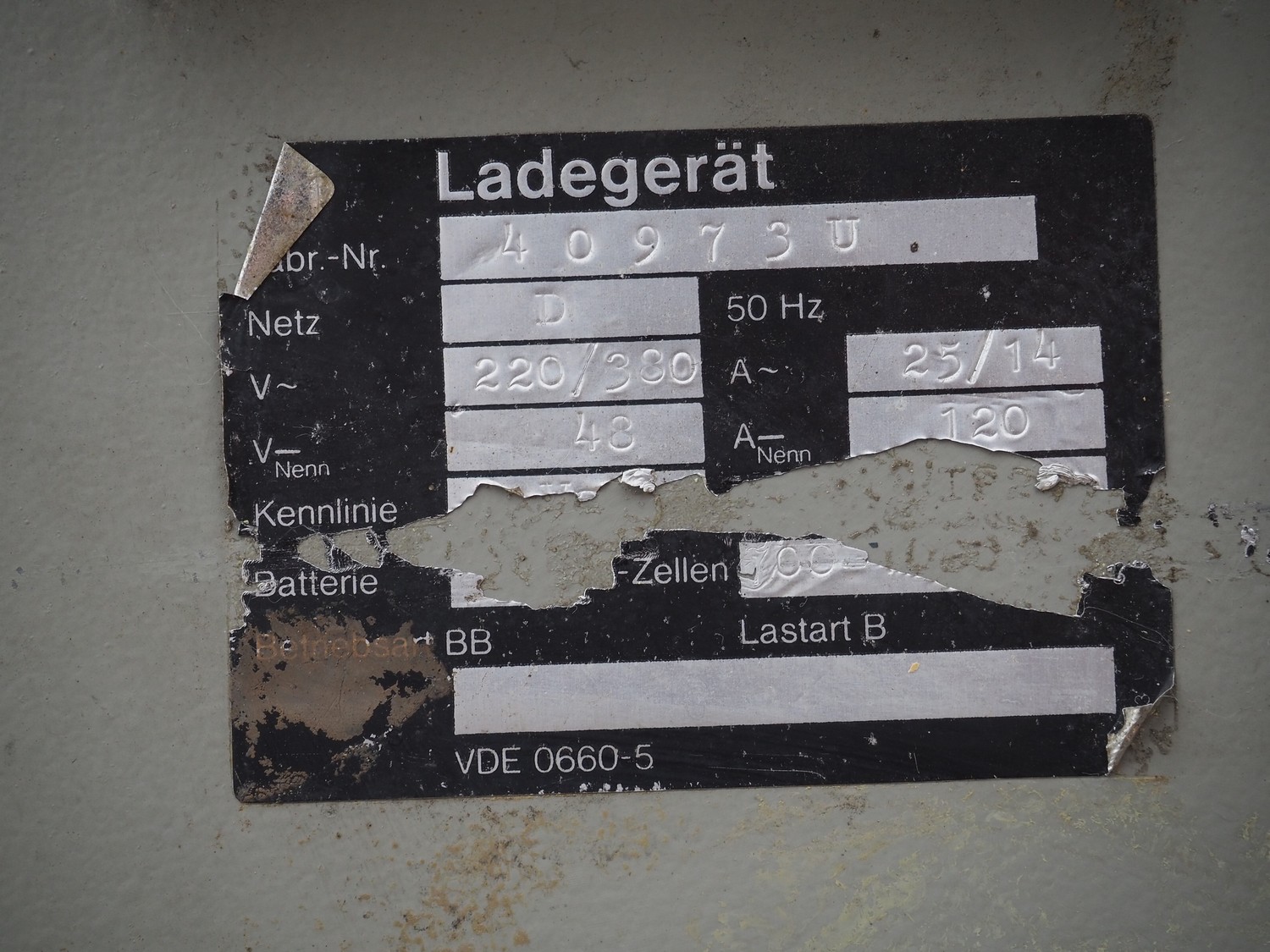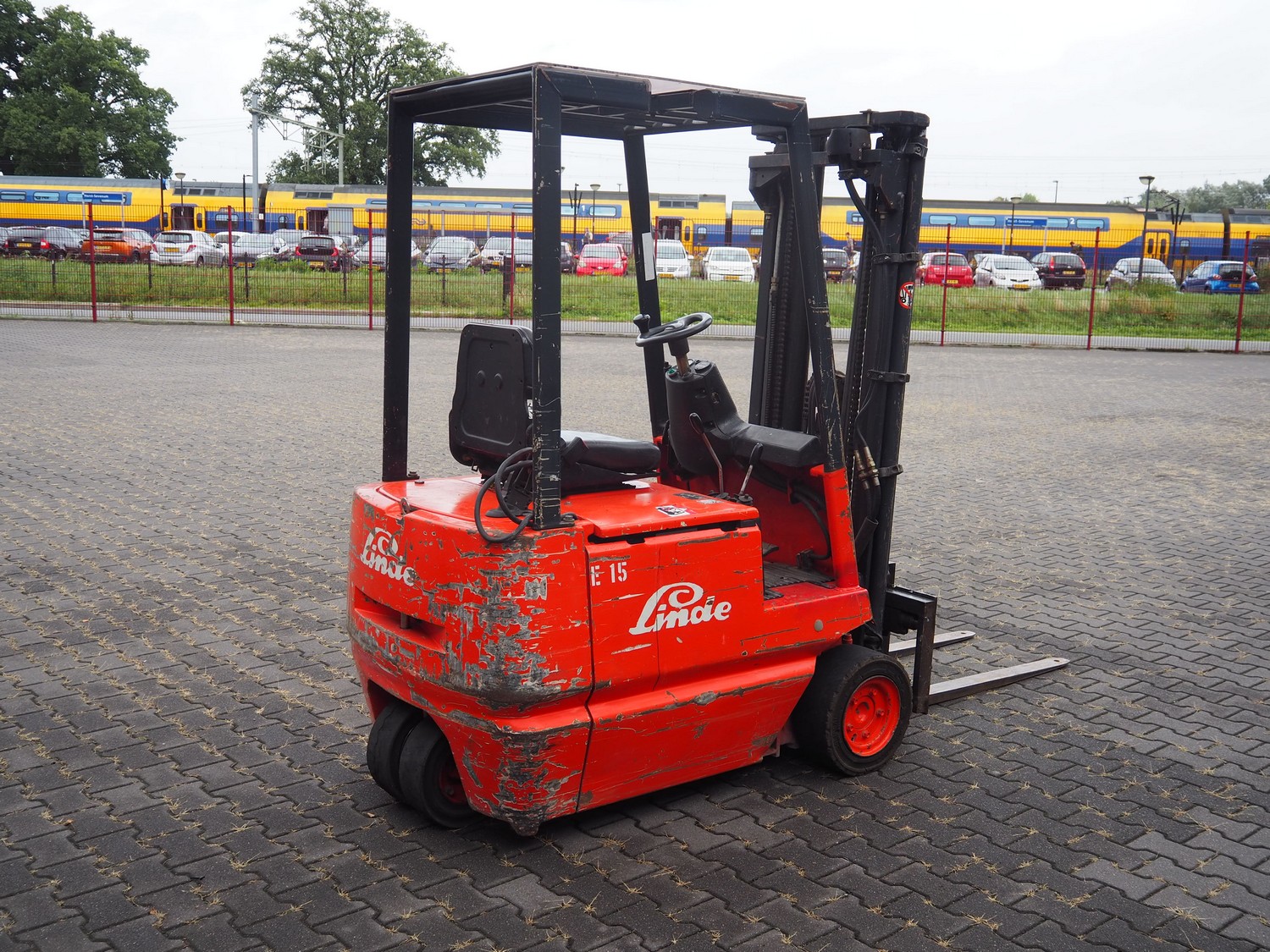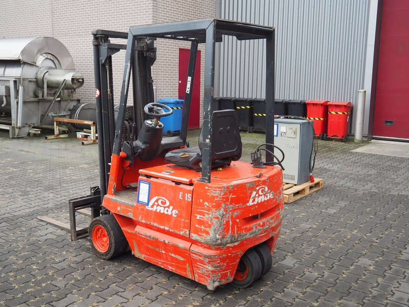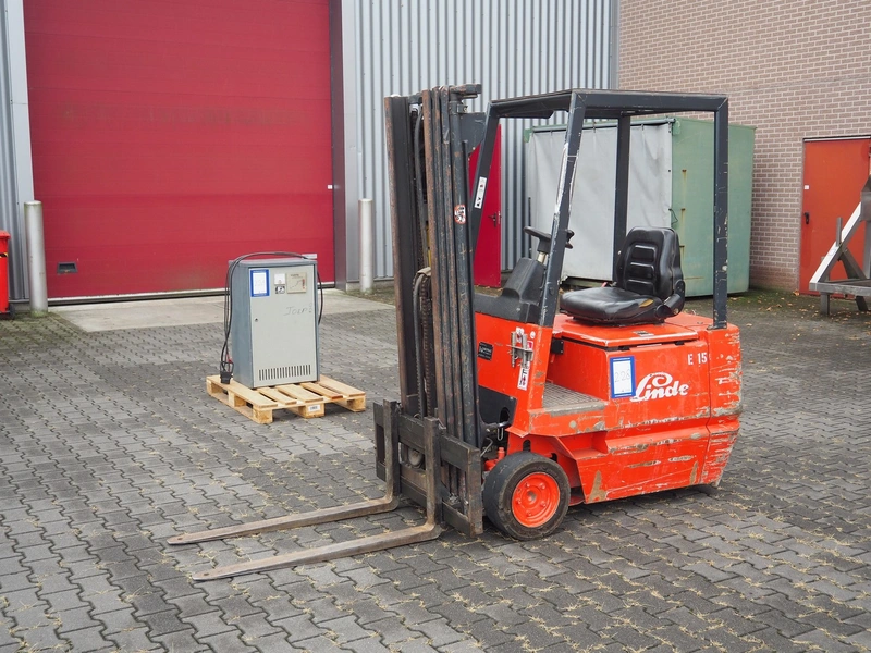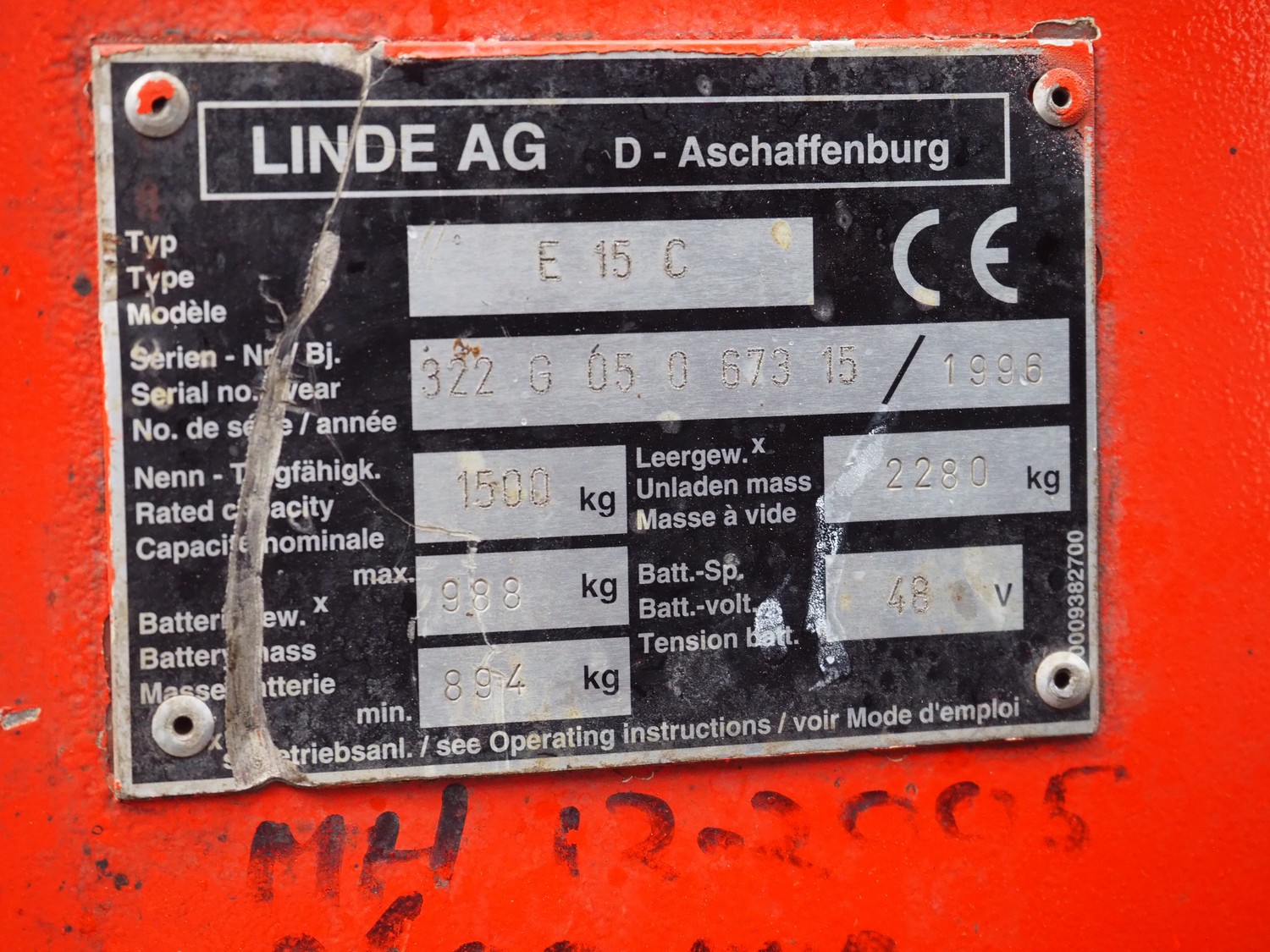 Linde AG electrical forklift, type: E 15 C, serial number: 322 G 05 0 673 15, year of construction: 1996, capacity: 1500 kg, unladen mass: 2280 kg, weight battery: 988/894 kg, fork length: 1090 mm, total dimensions: 2930 mm x 1060 mm x 2050 mm. Including Varta battery charger, dimensions charger: 550 mm x 440 mm x 910 mm.