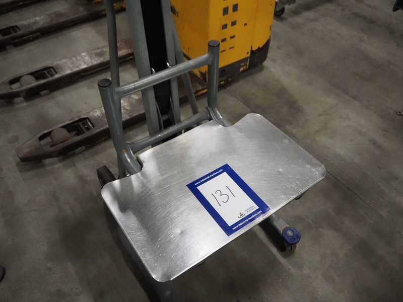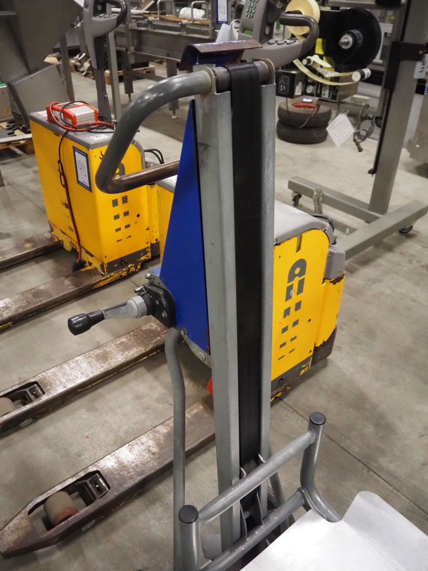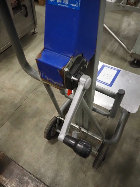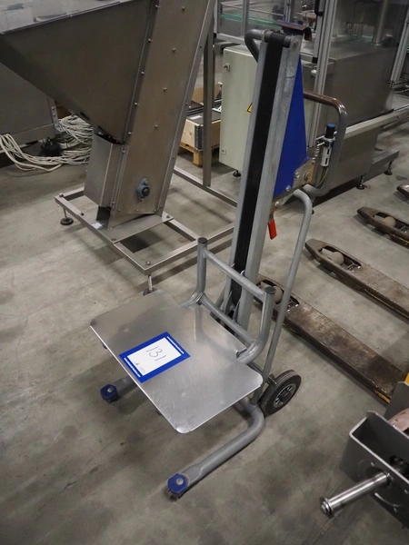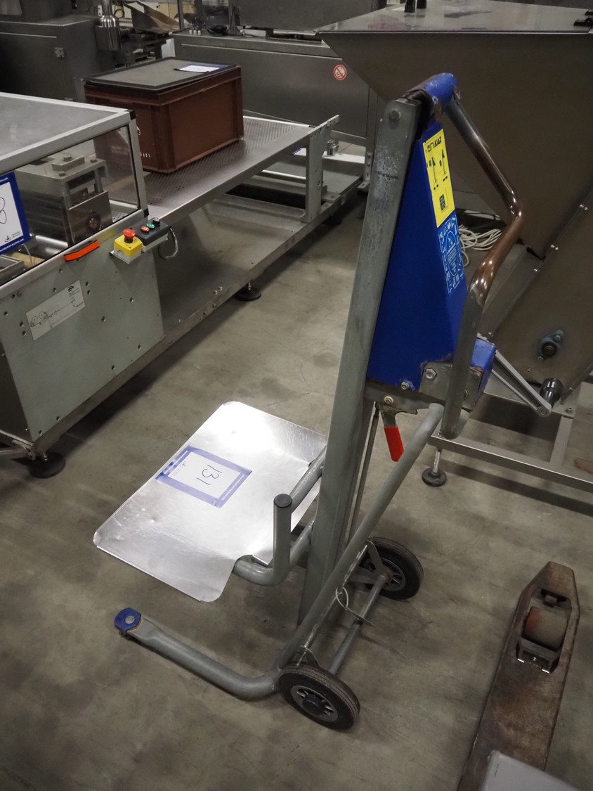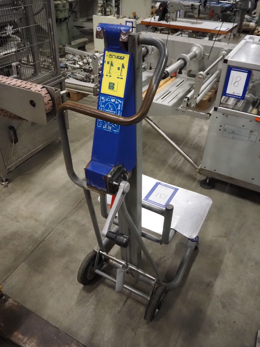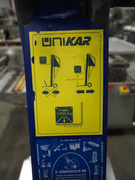 Unikar mobile lifter for boxes, capacity: 170 kg, lifting height: 600 mm, total dimensions: 720 mm x 580 mm x 1380 mm.