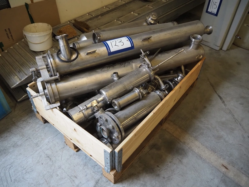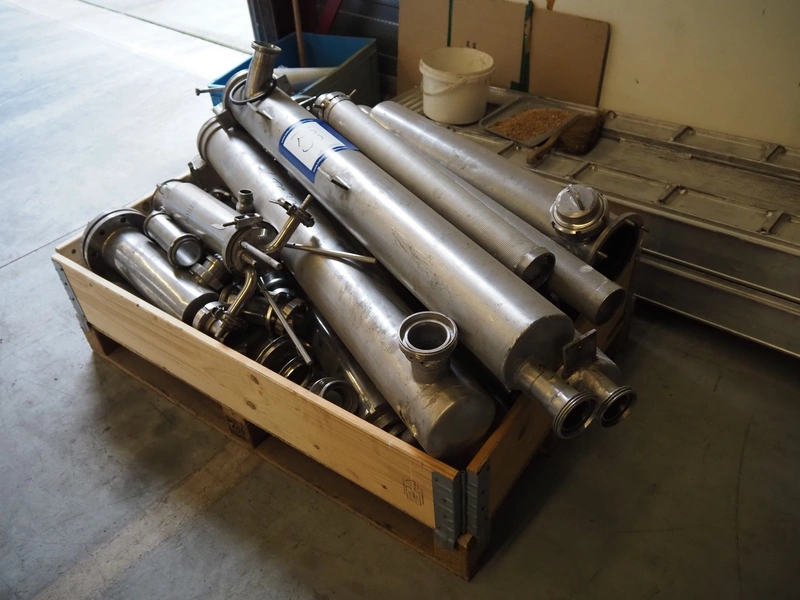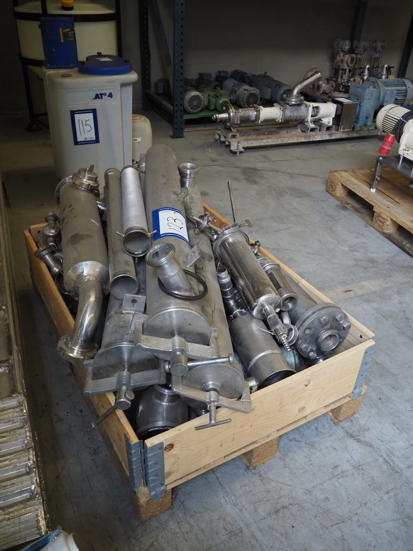 Pallet with various s/s filter casings, dimensions: 1300 mm x 800 mm x 750 mm.