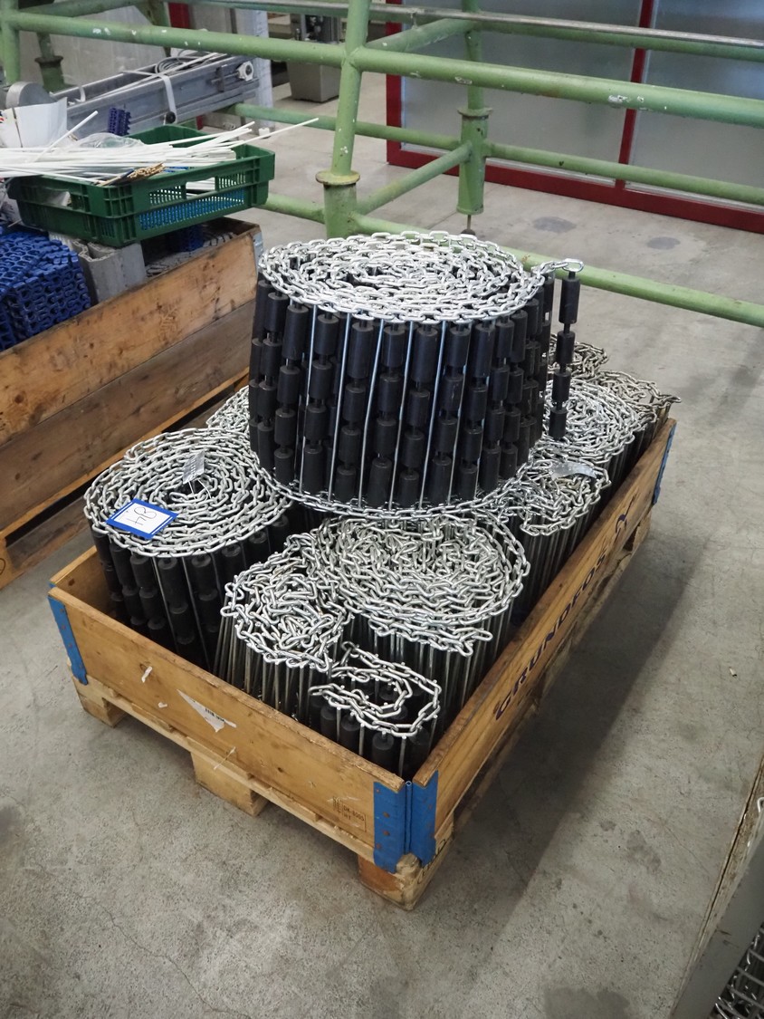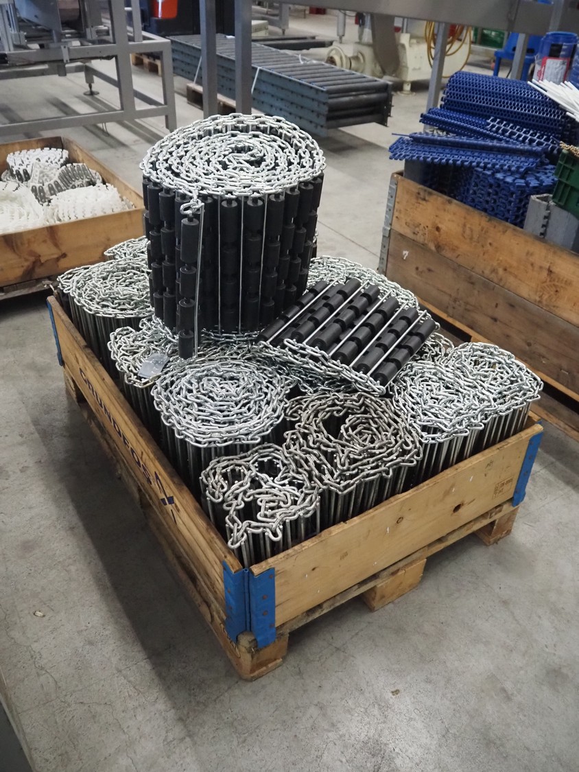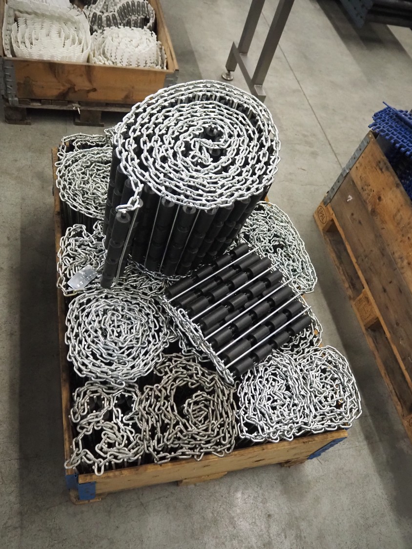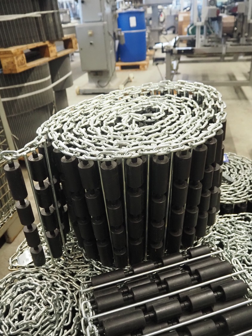 Steel chain belts with plastic rollers, belt width: 370 mm, total dimensions: 1200 mm x 800 mm x 910 mm.