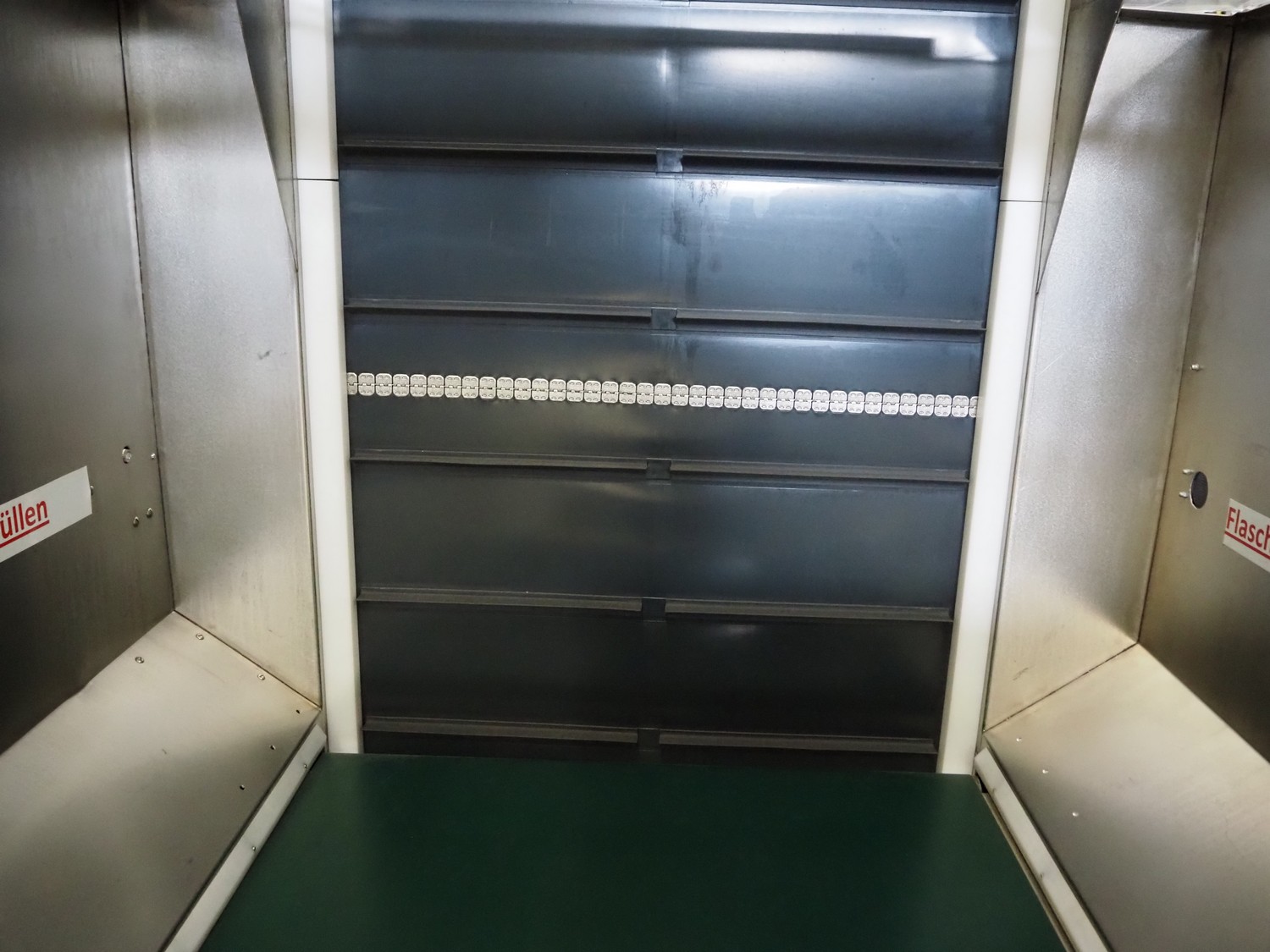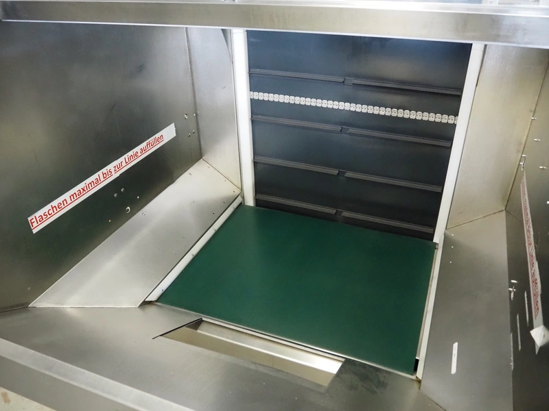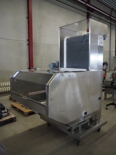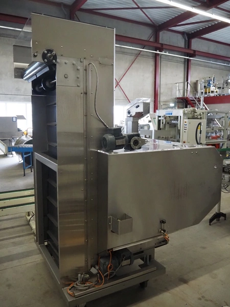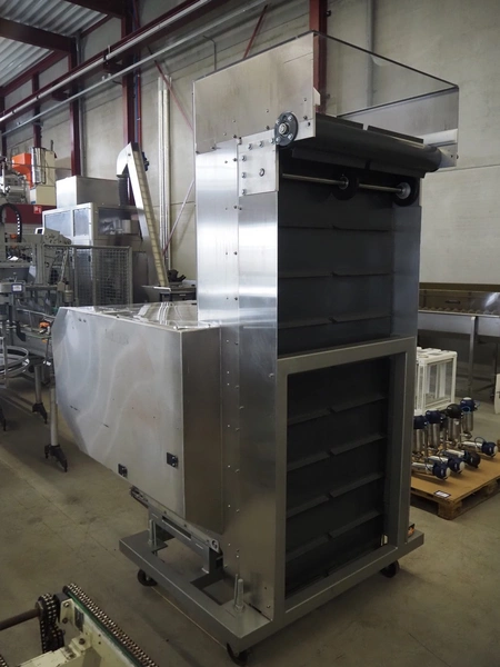 Mobile elevating belt, plastic infeed belt, belt width: 910 mm, plastic elevating belt with dividers, belt width: 920 mm, distance between dividers: 200 mm, divider height: (2x) 30 mm, elevating height: 2250 mm, total dimensions: 1800 mm x 1520 mm x 2500 mm.