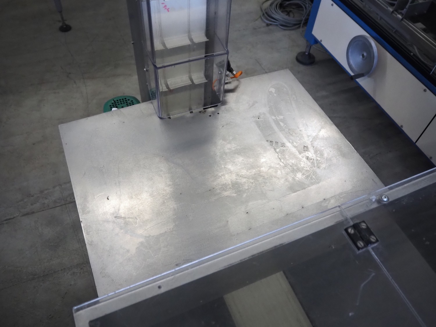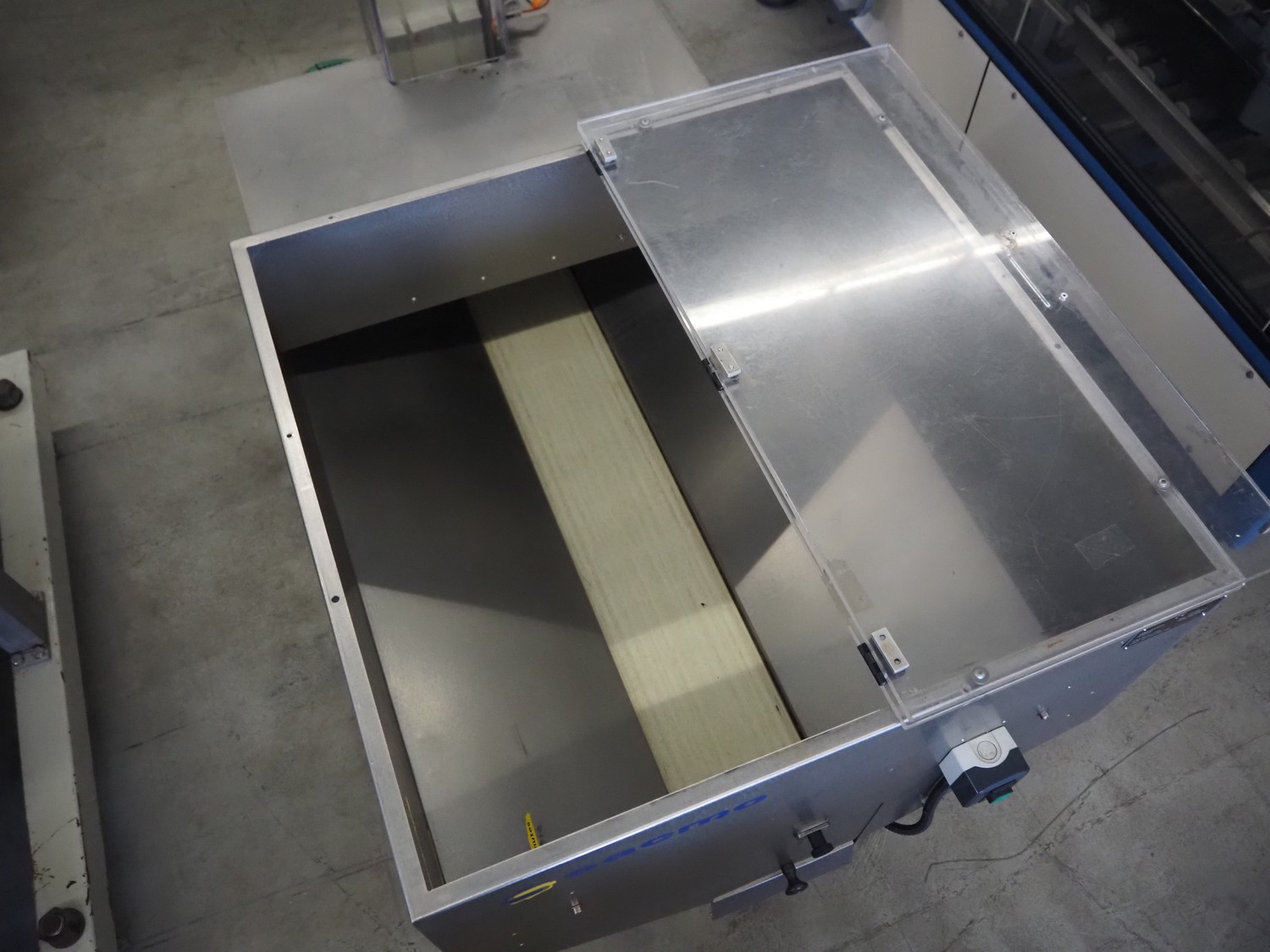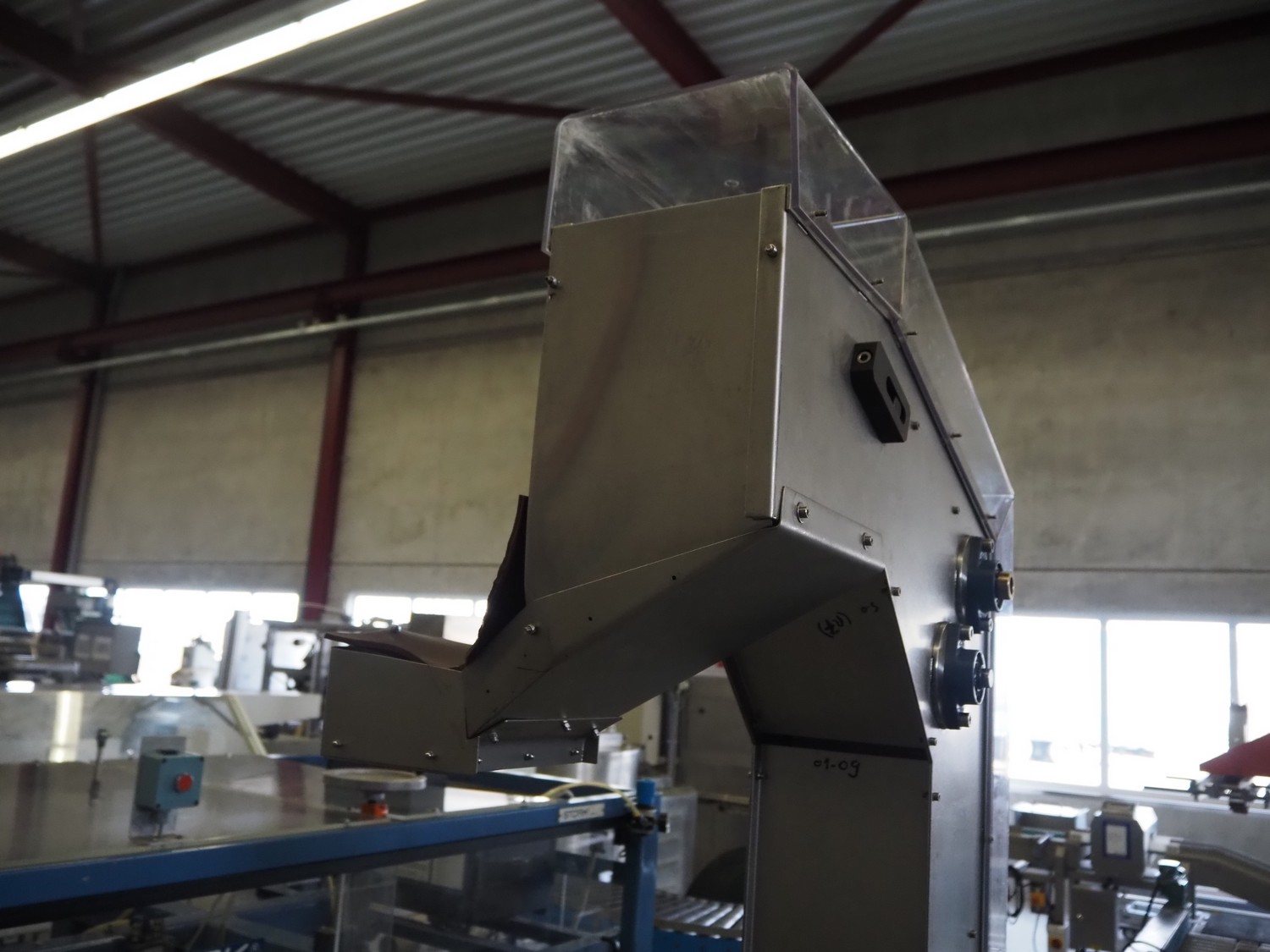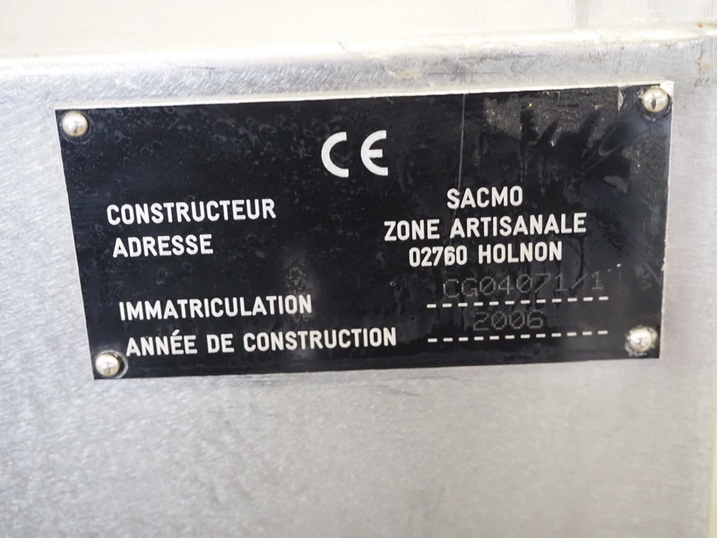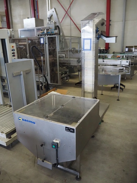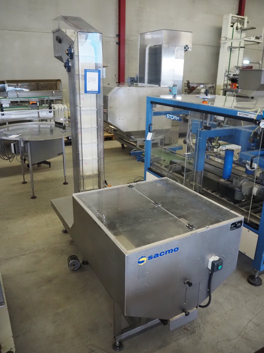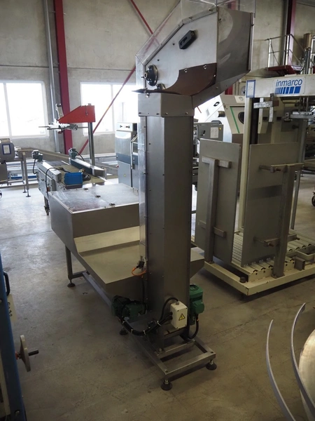 Sacmo elevating belt with infeed bunker, serial number: CG04071/1, year of construction: 2006, dimensions infeed: 760 mm x 760 mm, plastic belt with dividers, belt width: 200 mm, divider width: (2x) 45 mm and (1x) 70 mm, divider height: 45 mm, distance between dividers: 150 mm, total dimensions: 1900 mm x 800 mm x 2200 mm.