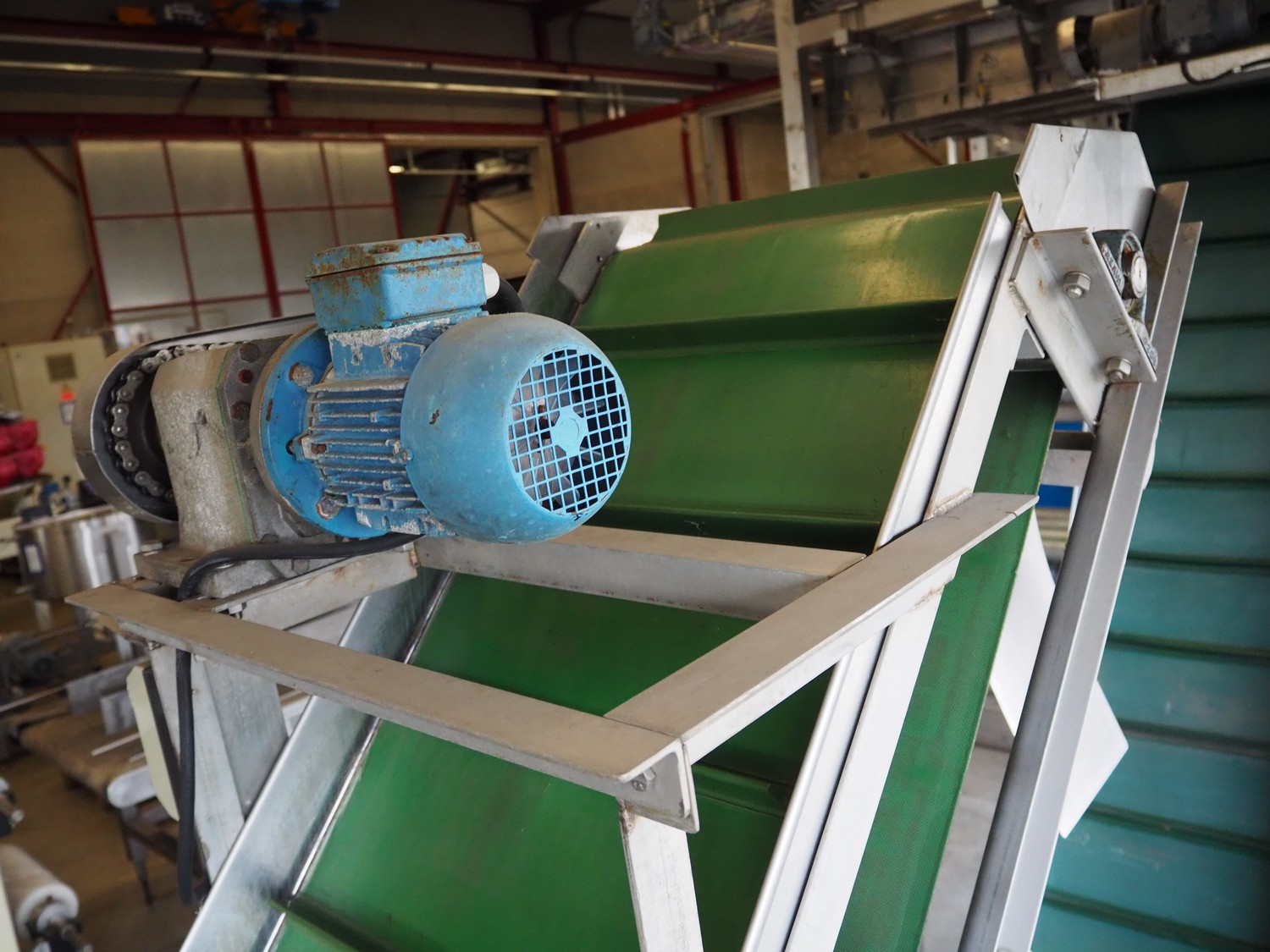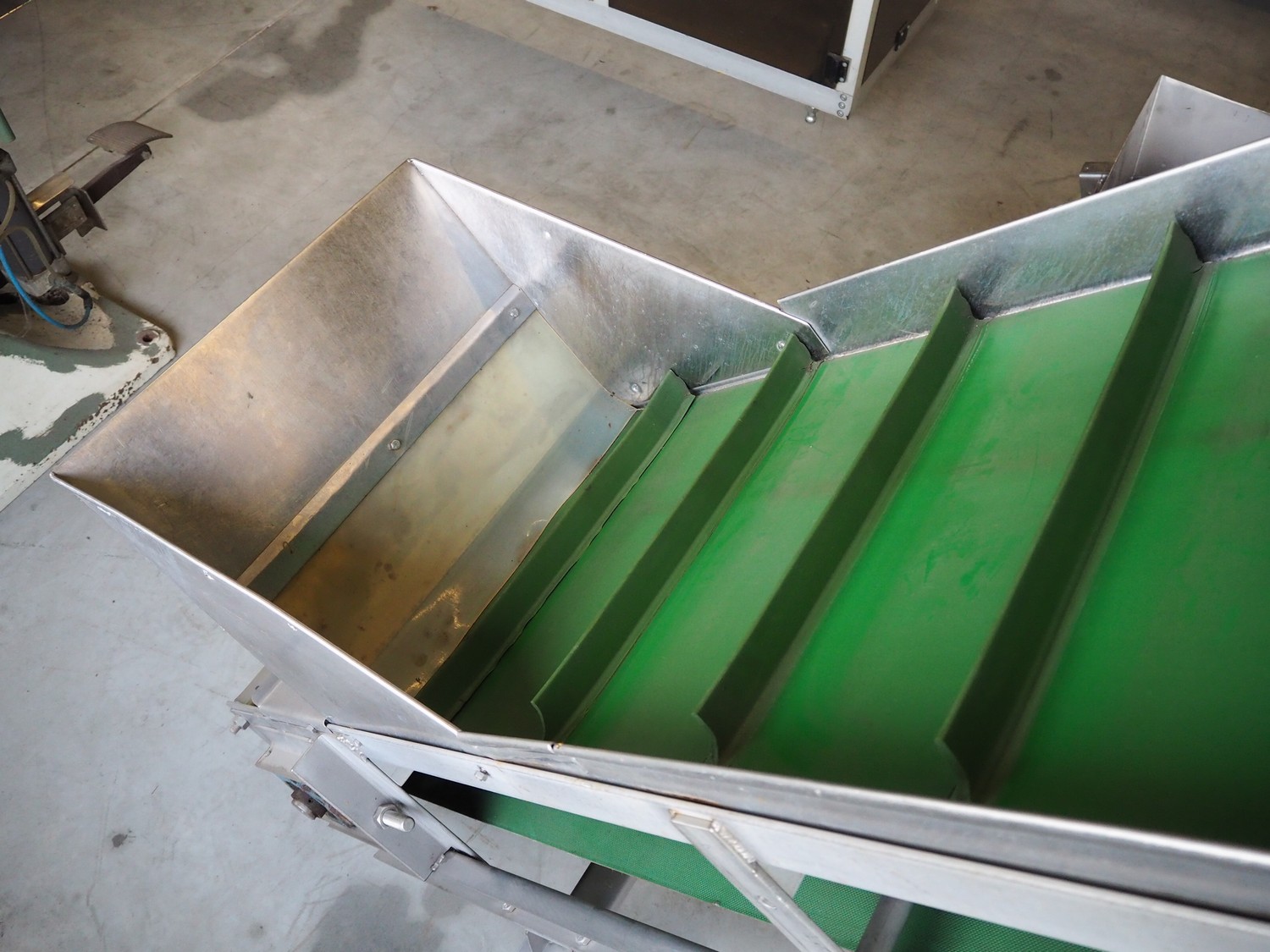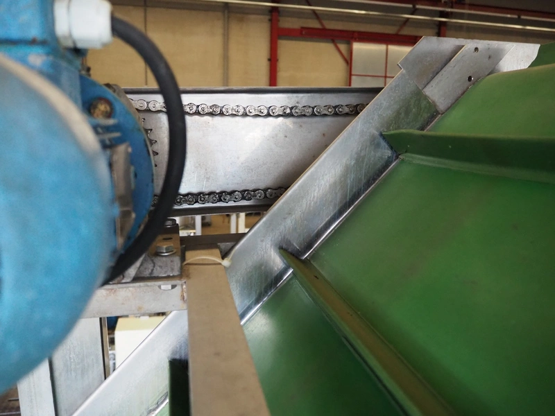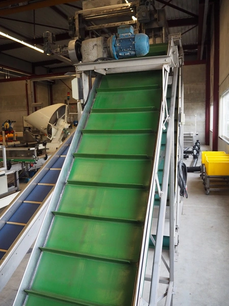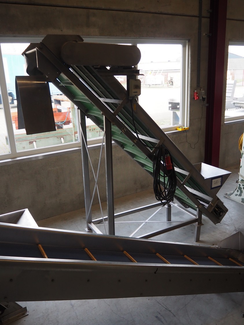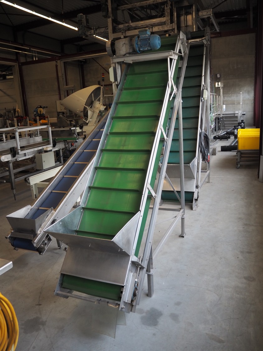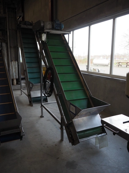 Elevating belt with dividers, s/s frame, plastic belt, belt width: 480 mm, distance between dividers: 185 mm, divider height: 40 mm, elevating height: 2200, total dimensions: 2500 mm x 750 mm x 2300 mm.