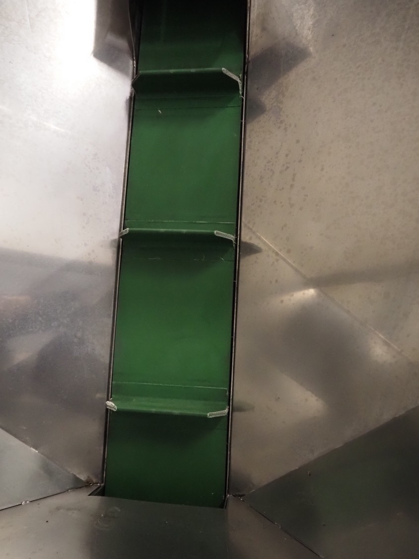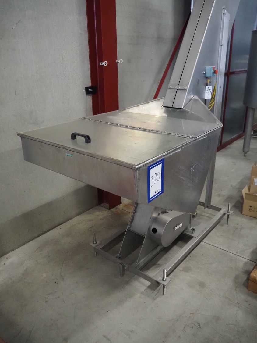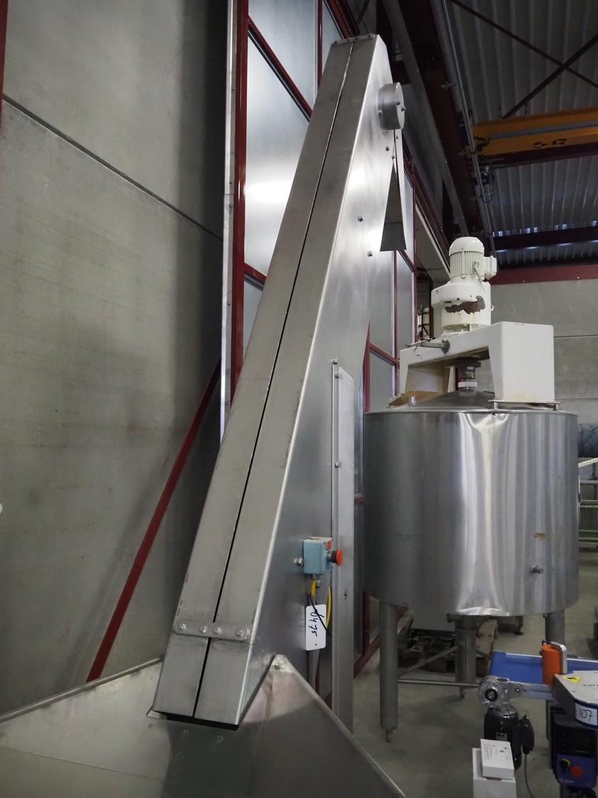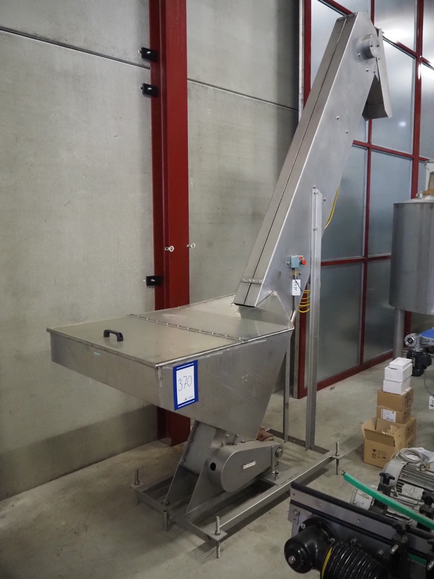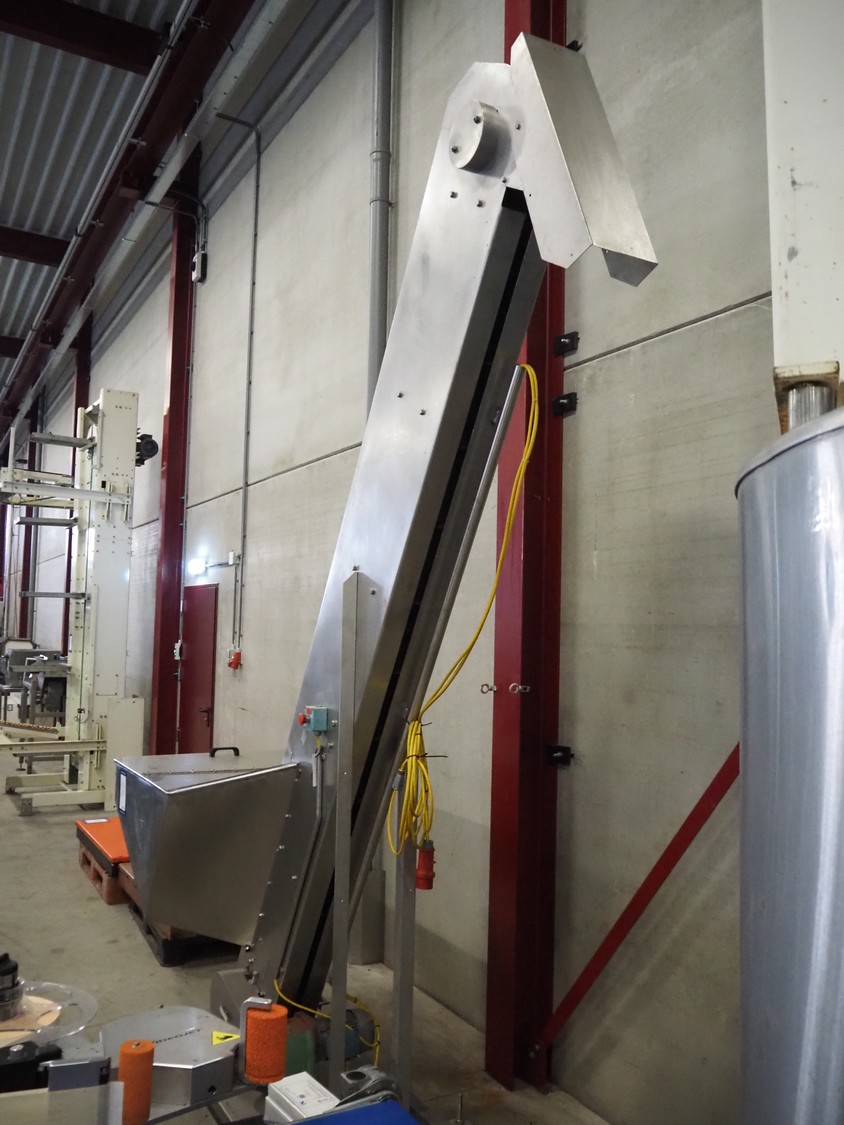 S/s mobile elevating belt, plastic belt with dividers, belt width: 180 mm, dividers height: 60 mm, distance between dividers: 250 mm, elevating height: 2900 mm, infeed clearance: 930 mm x 510 mm, total dimensions: 2900 mm x 960 mm x 3370 mm.