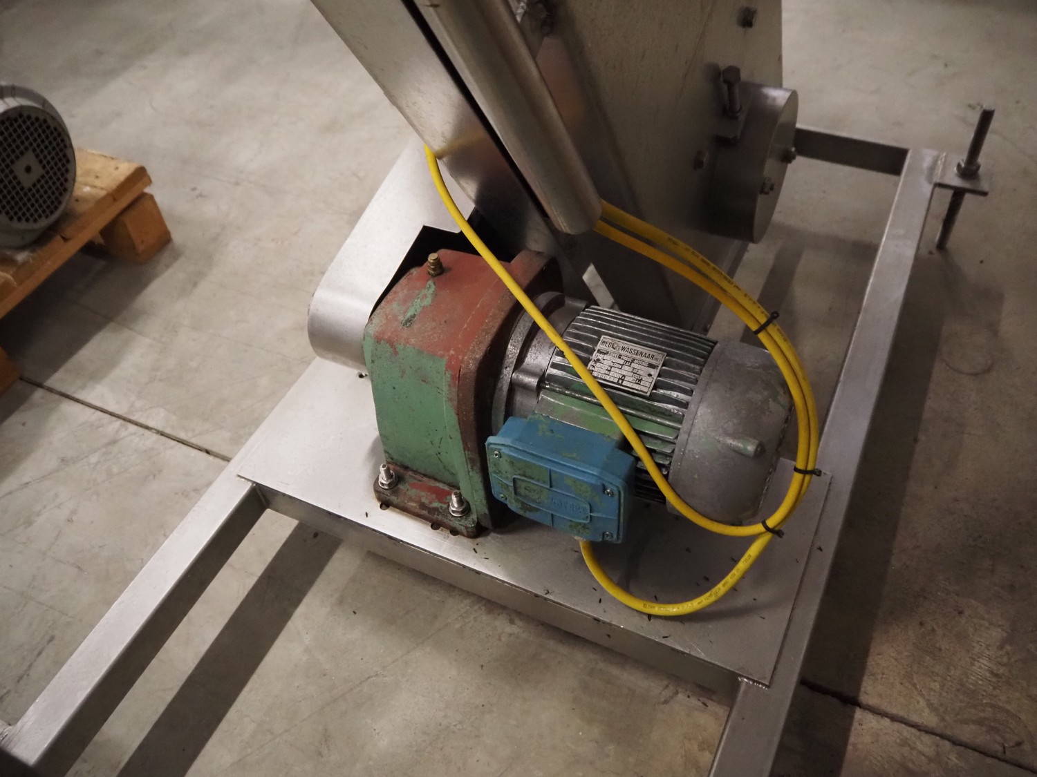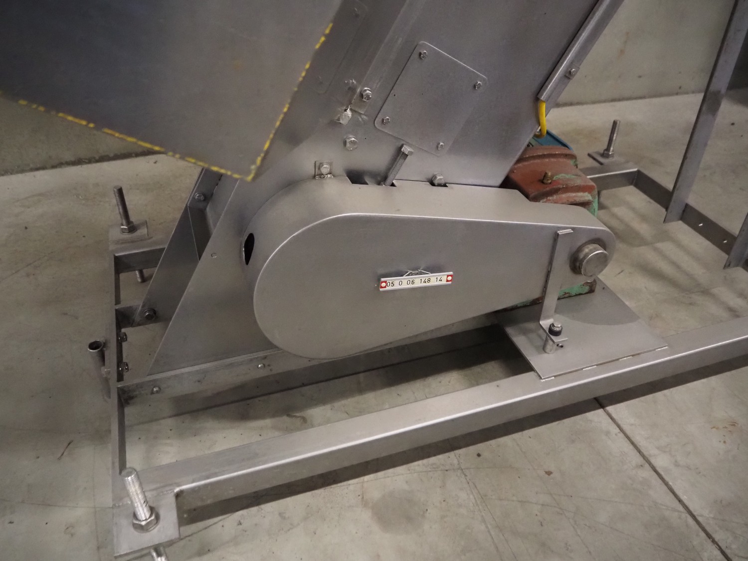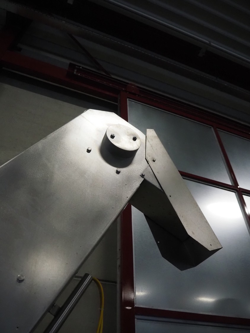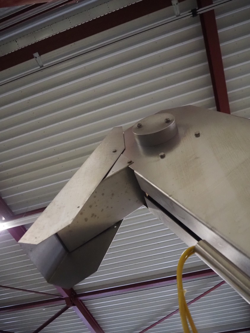 S/s mobile elevating belt, plastic belt with dividers, belt width: 180 mm, dividers height: 60 mm, distance between dividers: 250 mm, elevating height: 2900 mm, infeed clearance: 930 mm x 510 mm, total dimensions: 2900 mm x 960 mm x 3370 mm.