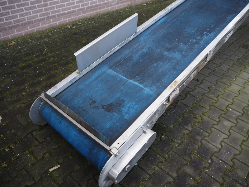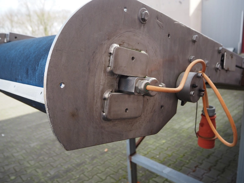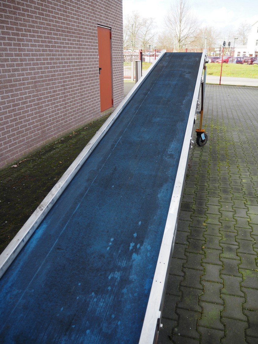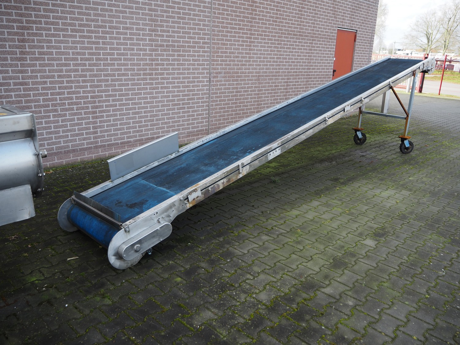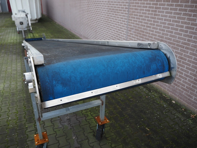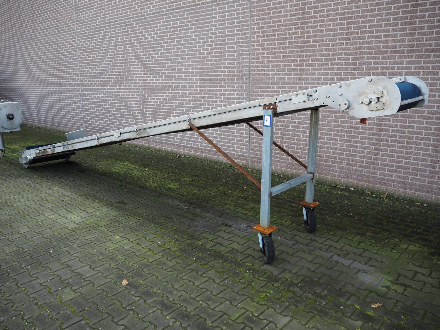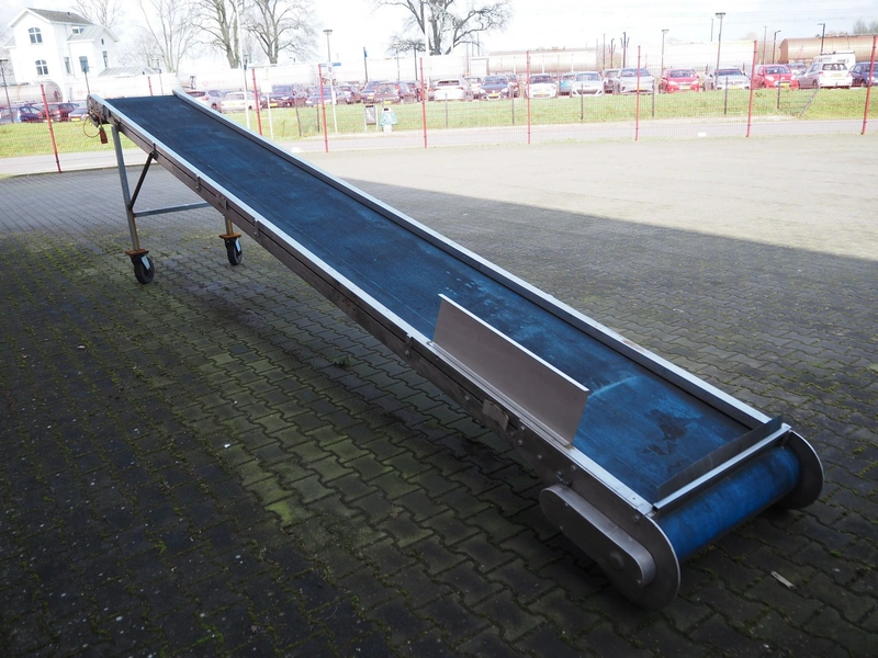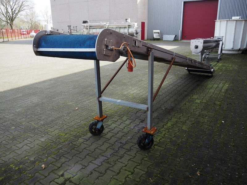 Mobile elevating belt, plastic belt, belt width: 800 mm, elevating height: 1580 mm, total dimensions: 770 mm x 1020 mm x 1670 mm.