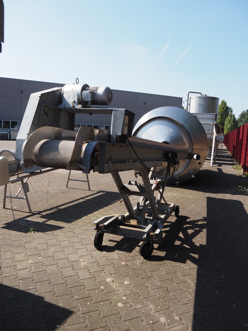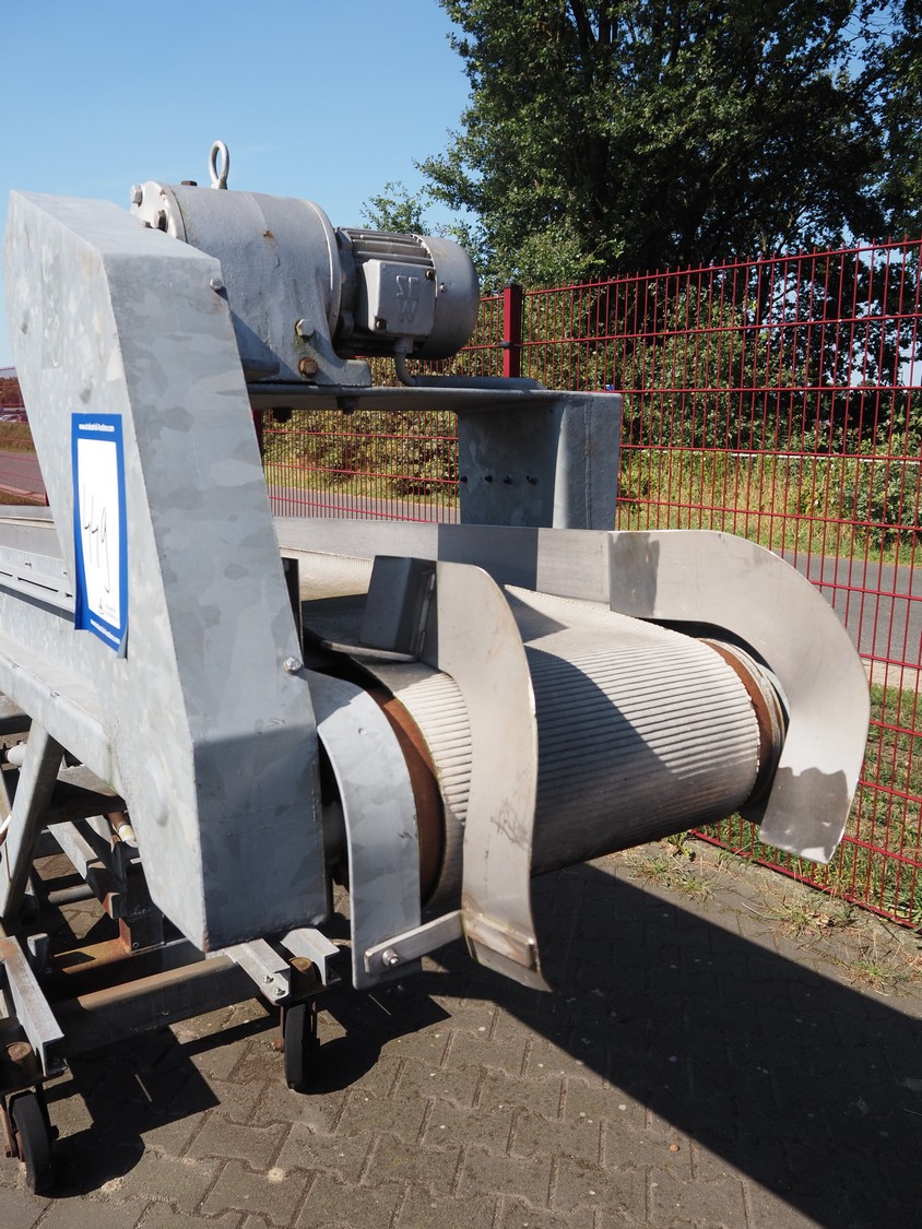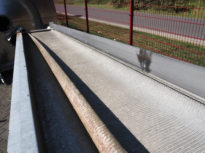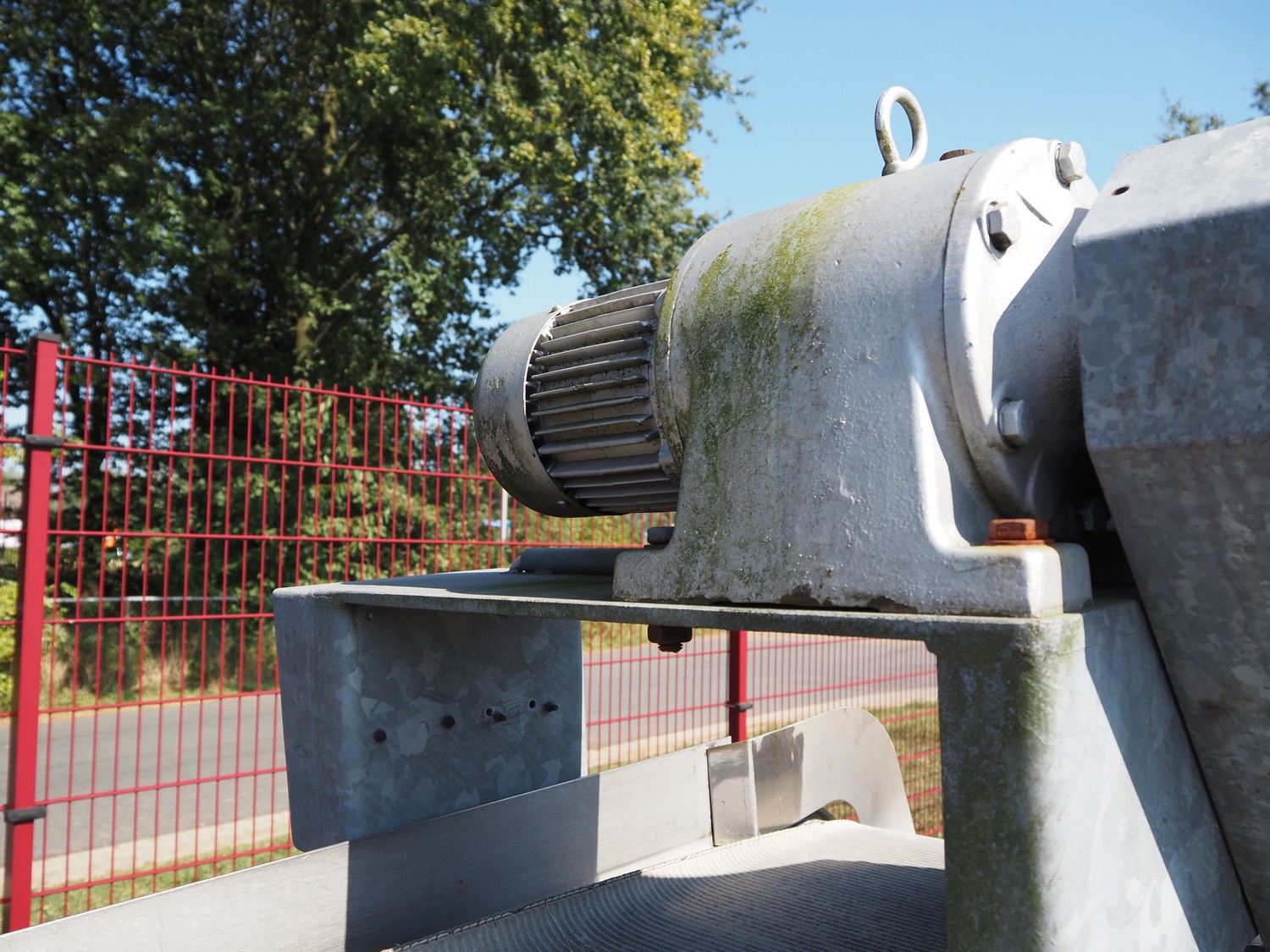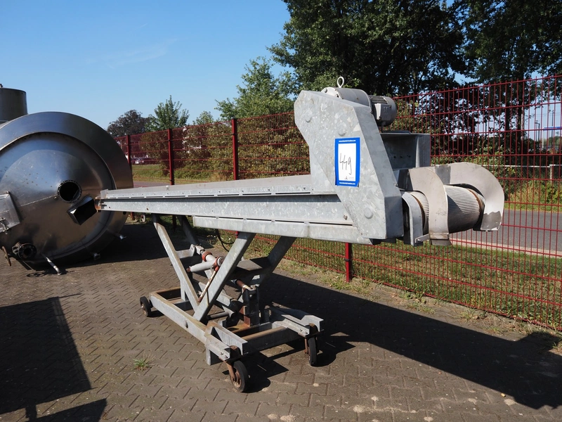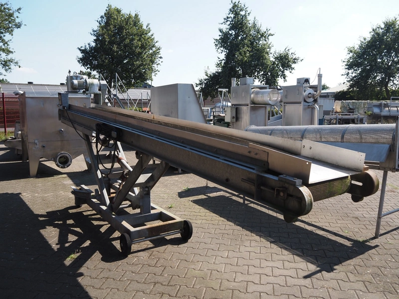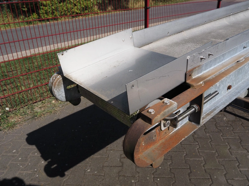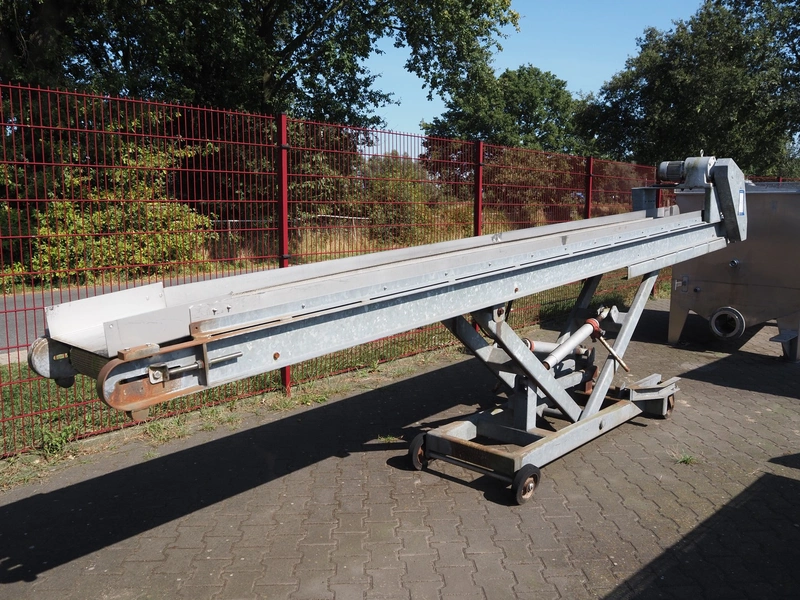 Steel mobile elevating belt, plastic belt, belt width: 360 mm, elevating height: 1300 mm, total dimensions: 5500 mm x 850 mm x 1900 mm.