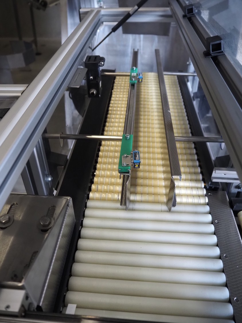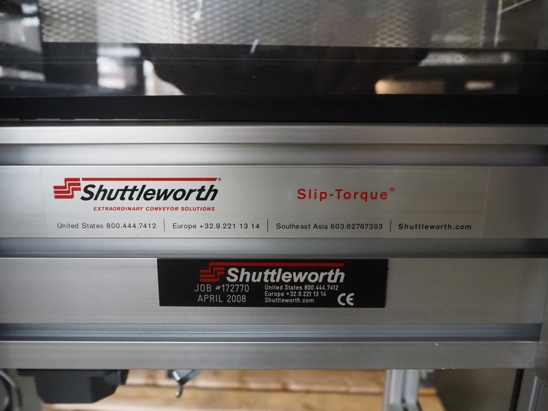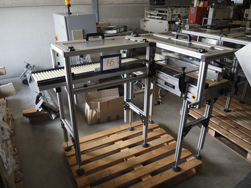 Shuttleworth slip-torque roller conveyor with 90˚ angle, roller width: 230 mm, total dimensions: 1600 mm x 1050 mm x 1100 mm.