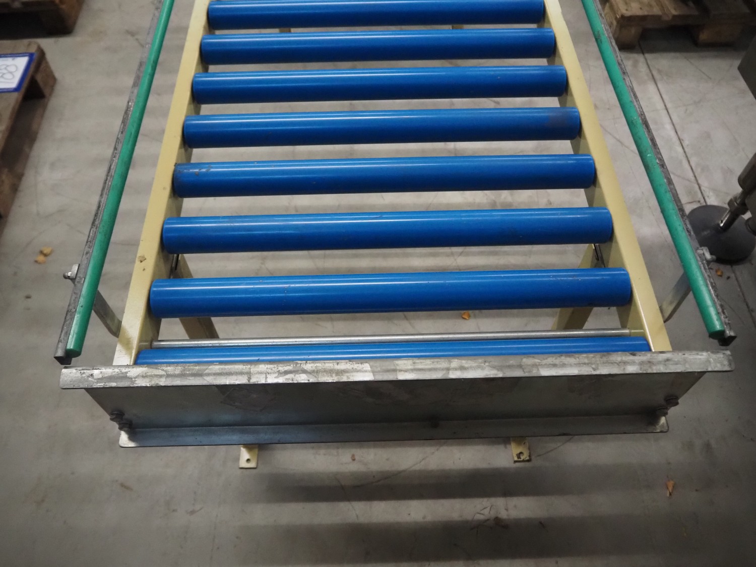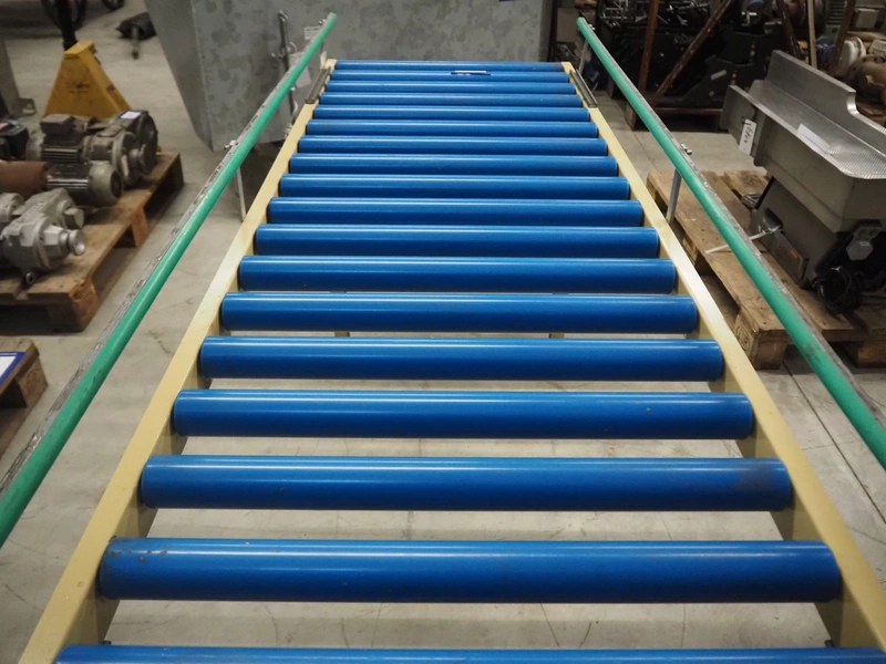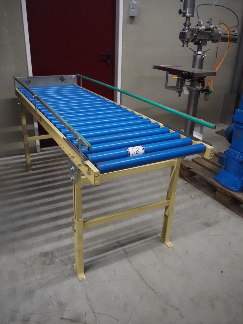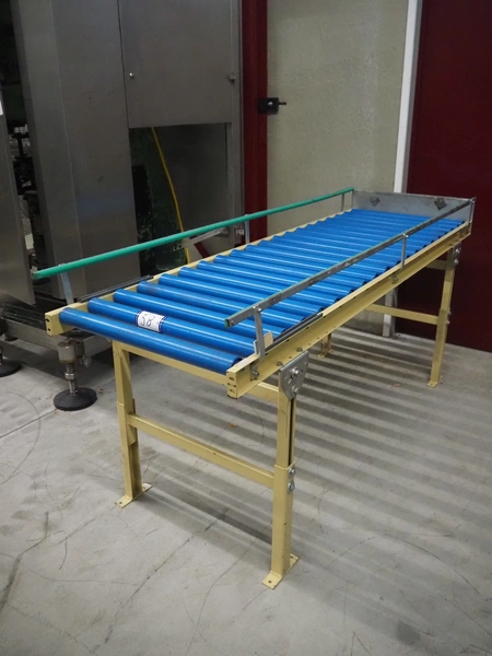Roller conveyor, steel frame, plastic rollers, roller width: 600 mm, total dimensions: 2000 mm x 670 mm x 900 mm.