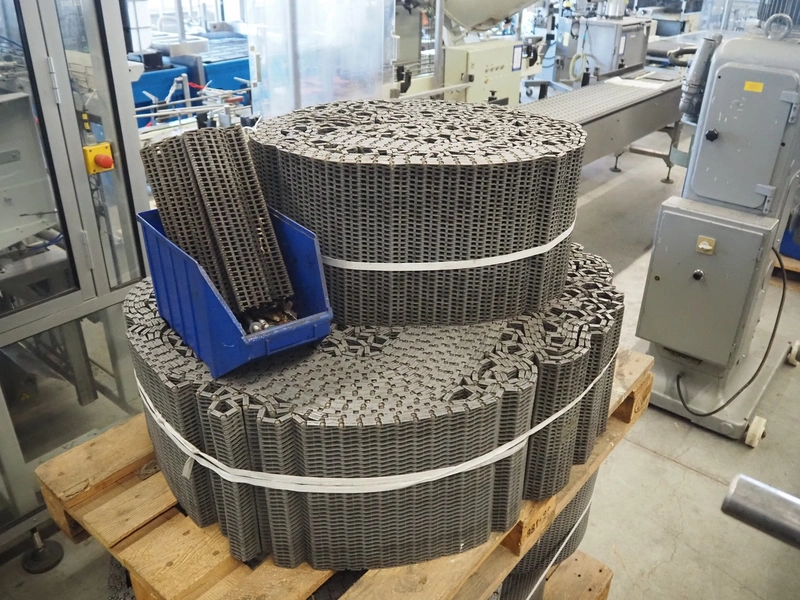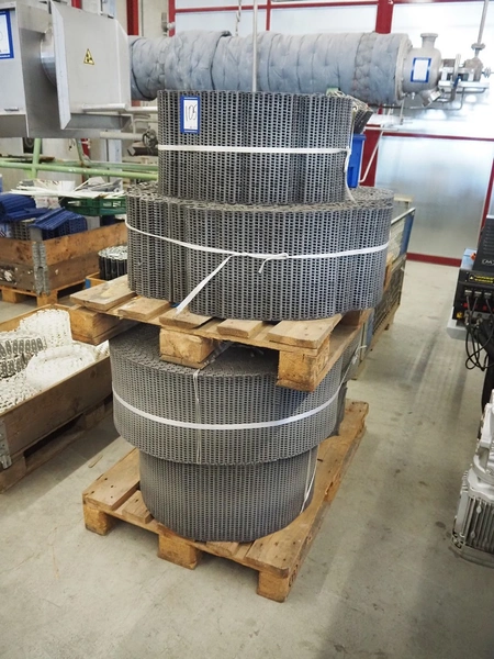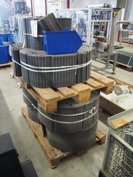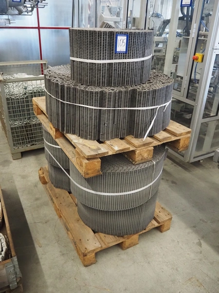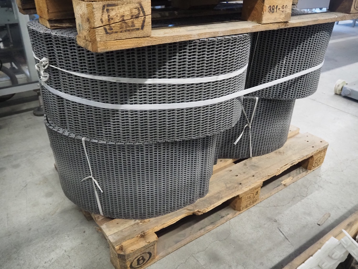 2 pallets with plastic mesh belts, belt width: 303 mm, total dimensions: 1200 mm x 800 mm x 1510 mm.