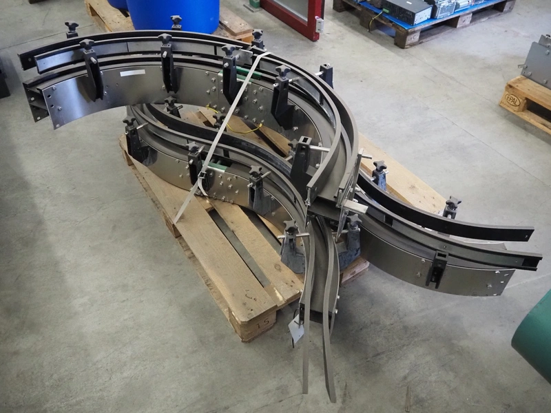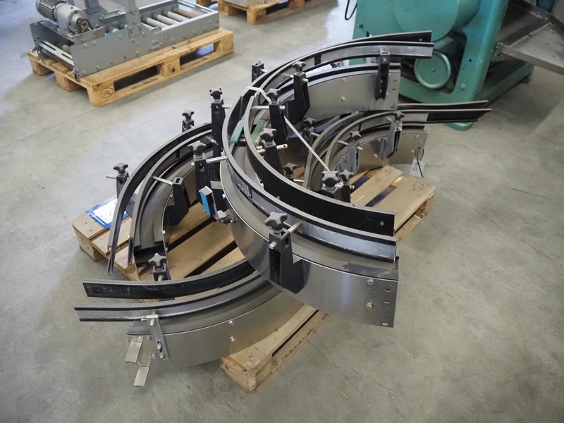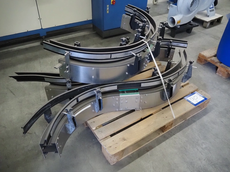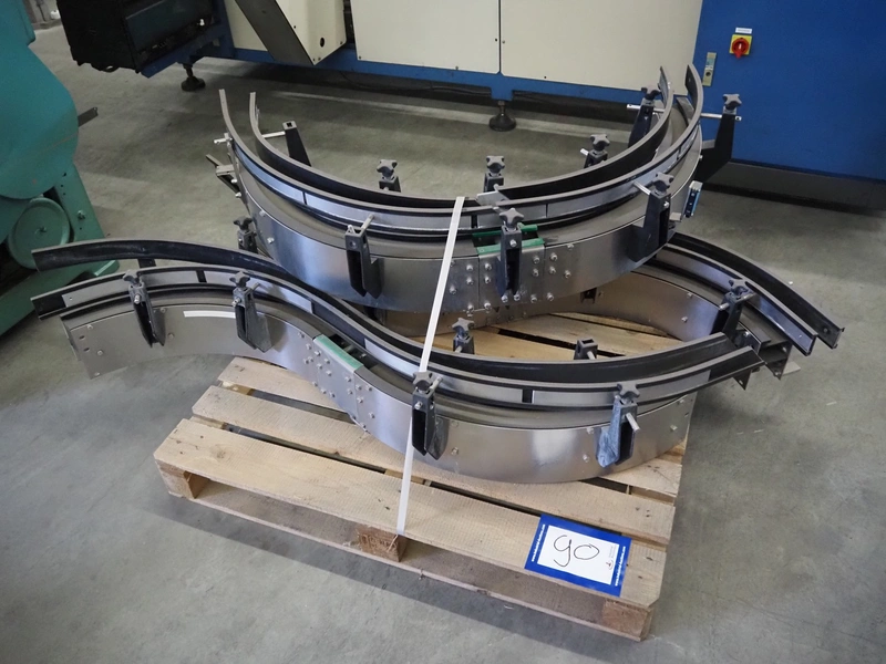 3 s/s frames for transport belt, (1x) 90° curve conveyor, dimensions: 1400 mm x 700 mm x 350 mm, (2x) S-shaped conveyor, dimensions: 2000 mm x 600 mm x 350 mm.
