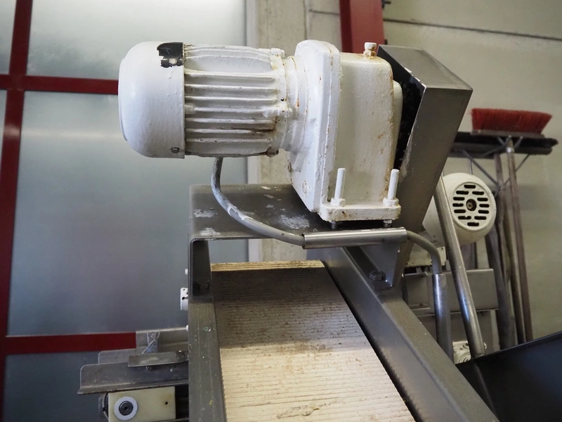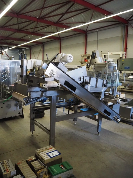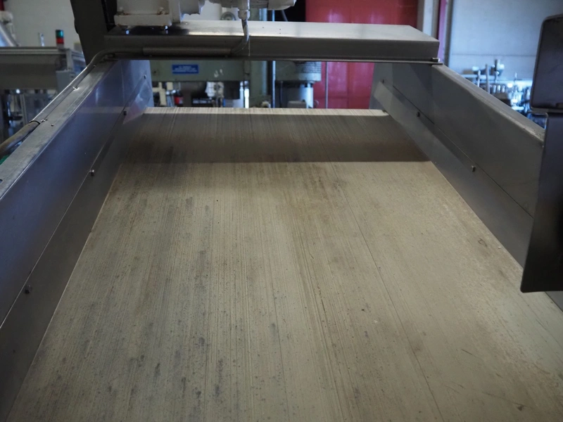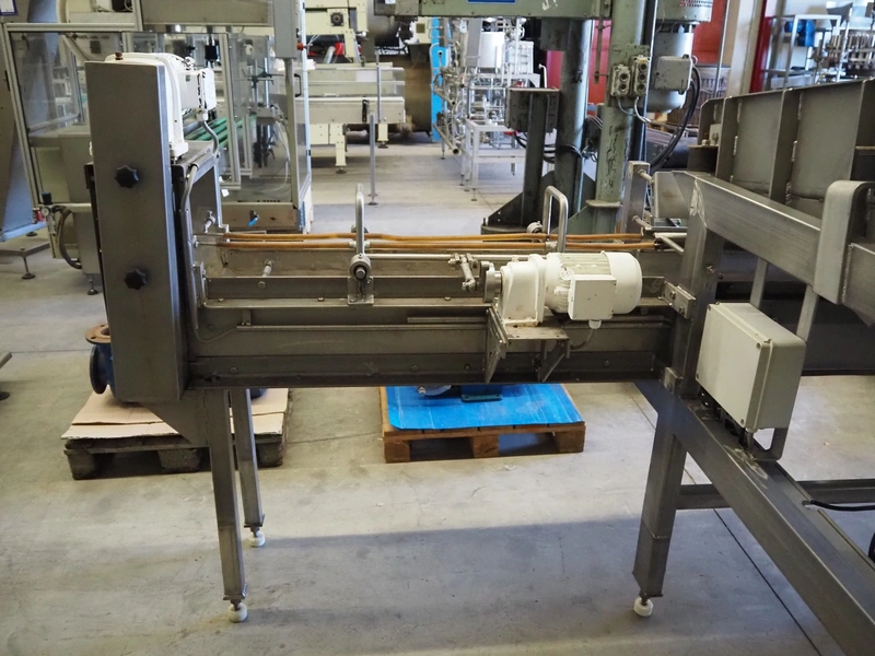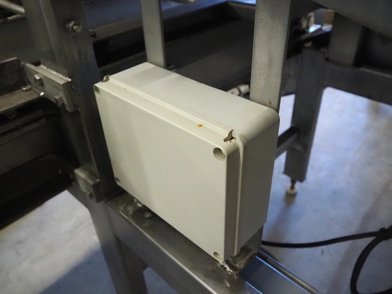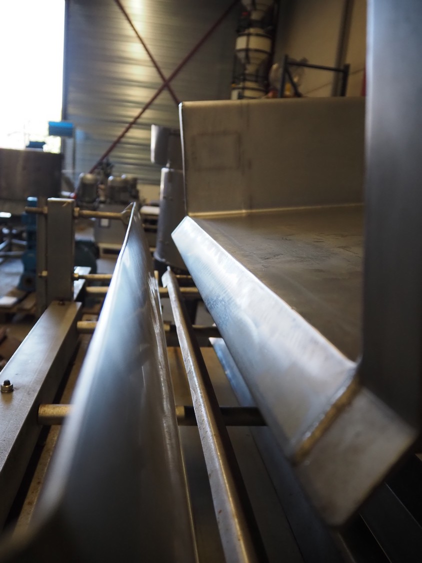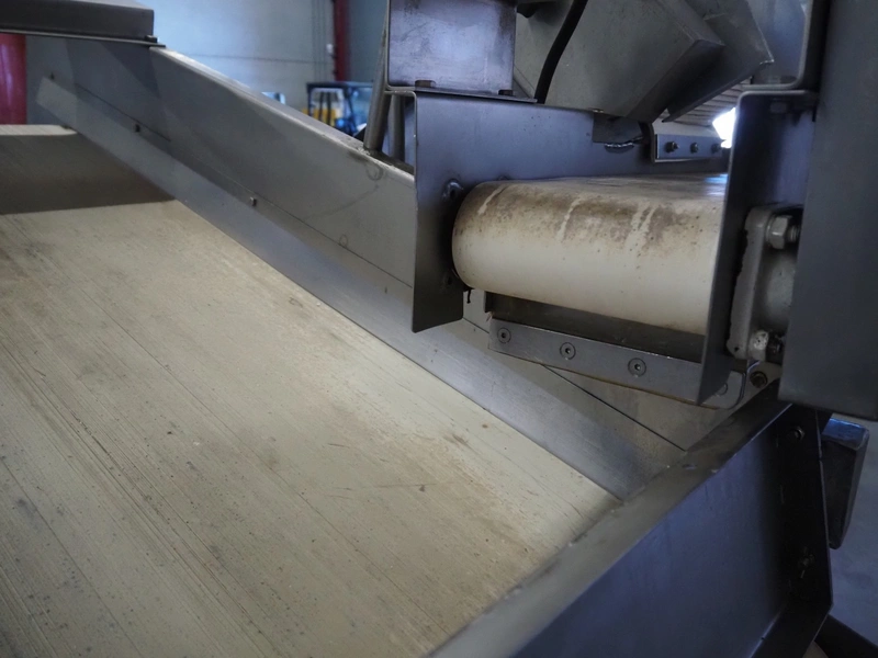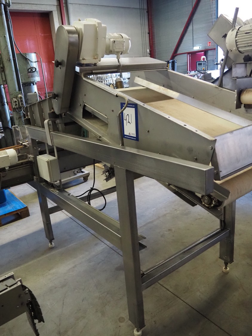 S/s vibrating gutter with sorting belt, gutter width: 850 mm, plastic belts, belt width: (2x) 200 mm, (1x) 700 mm, (1x) 300 mm, total dimensions: 2820 mm x 2400 mm x 1900 mm.