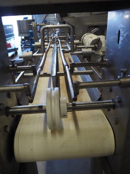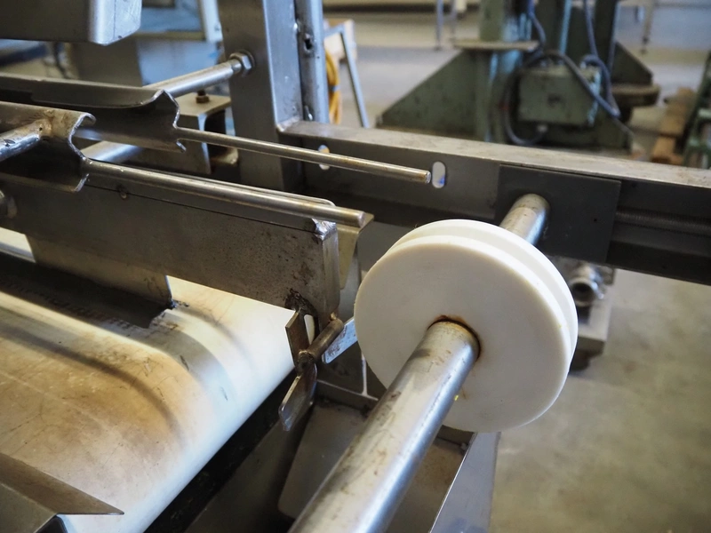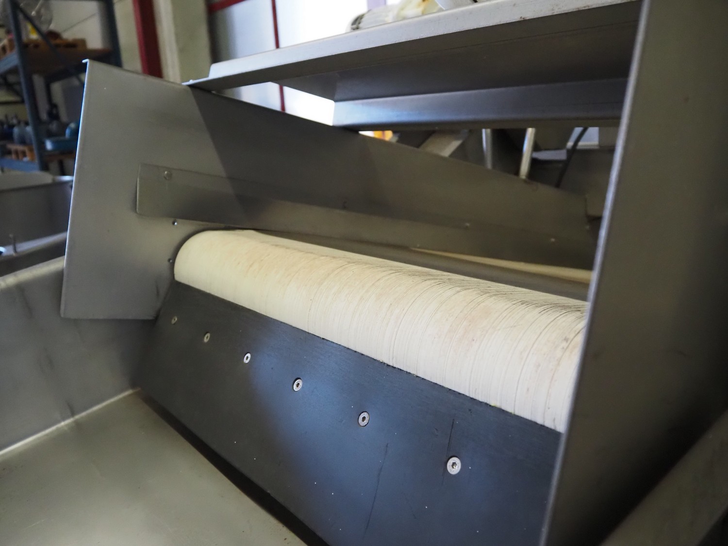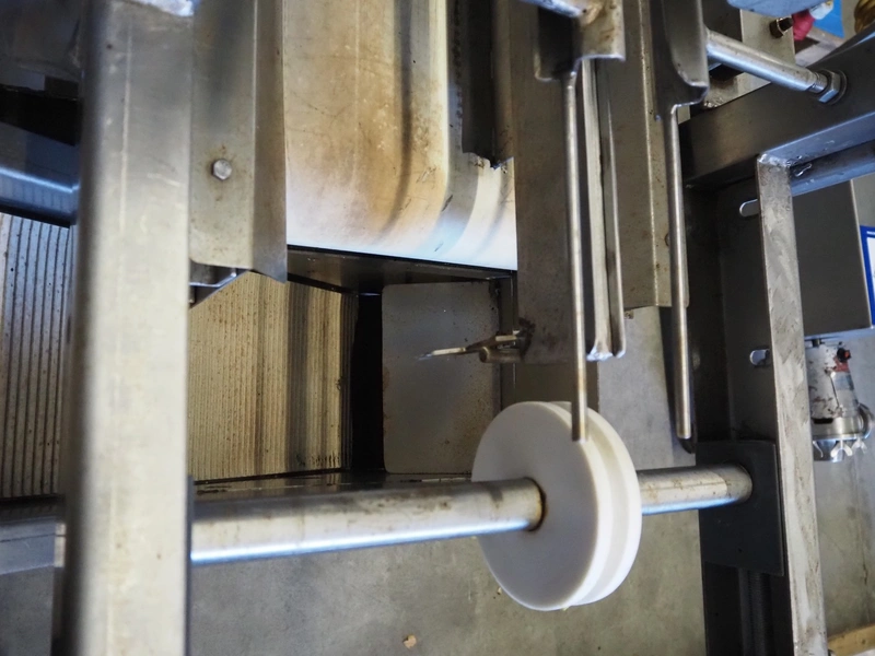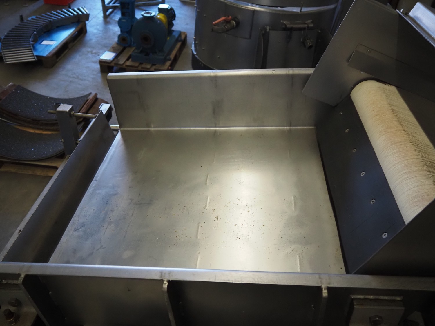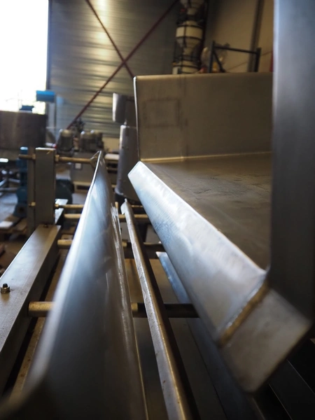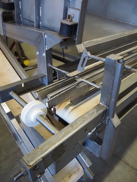 S/s vibrating gutter with sorting belt, gutter width: 850 mm, plastic belts, belt width: (2x) 200 mm, (1x) 700 mm, (1x) 300 mm, total dimensions: 2820 mm x 2400 mm x 1900 mm.