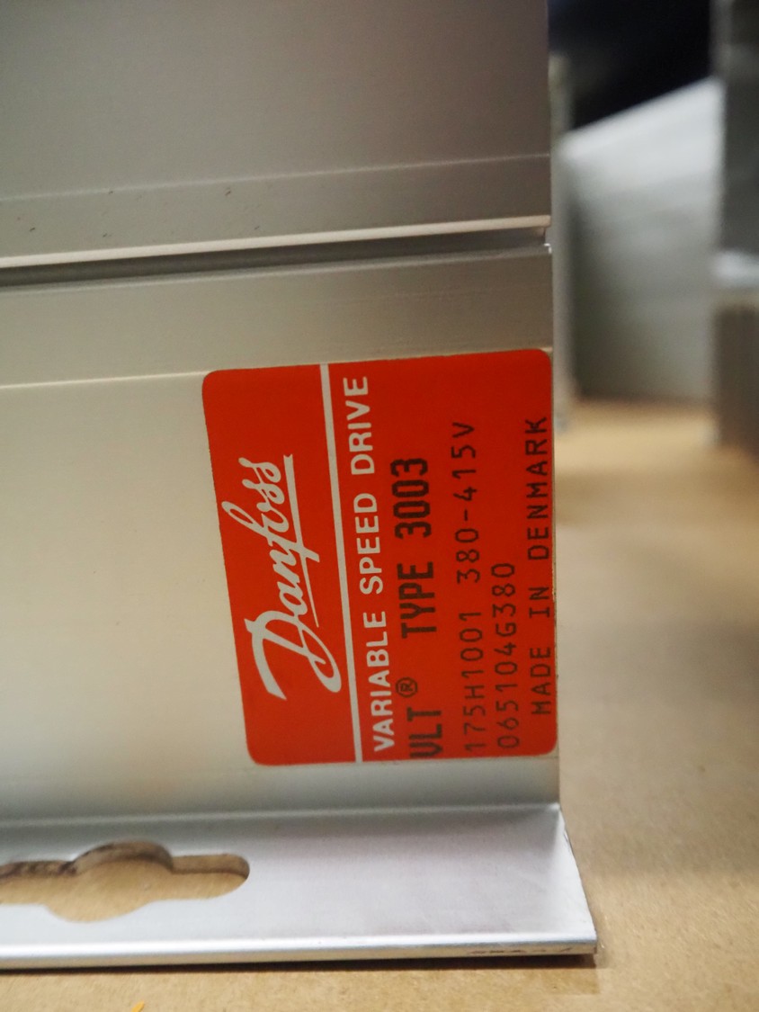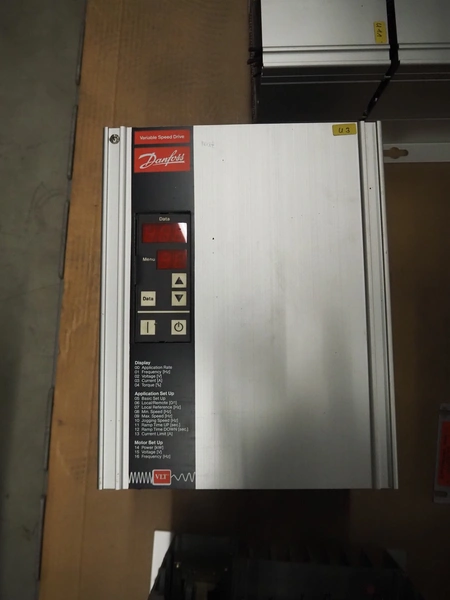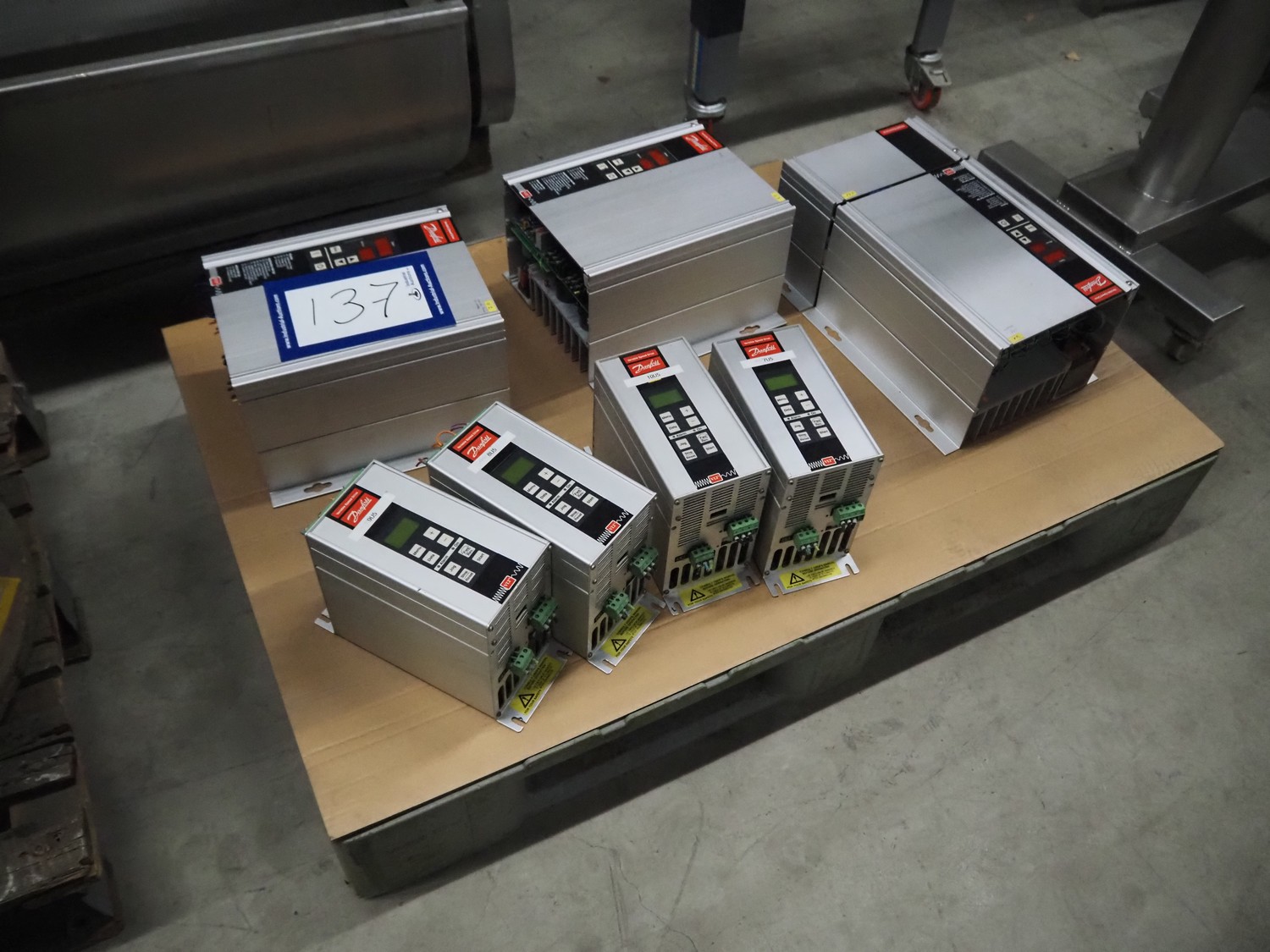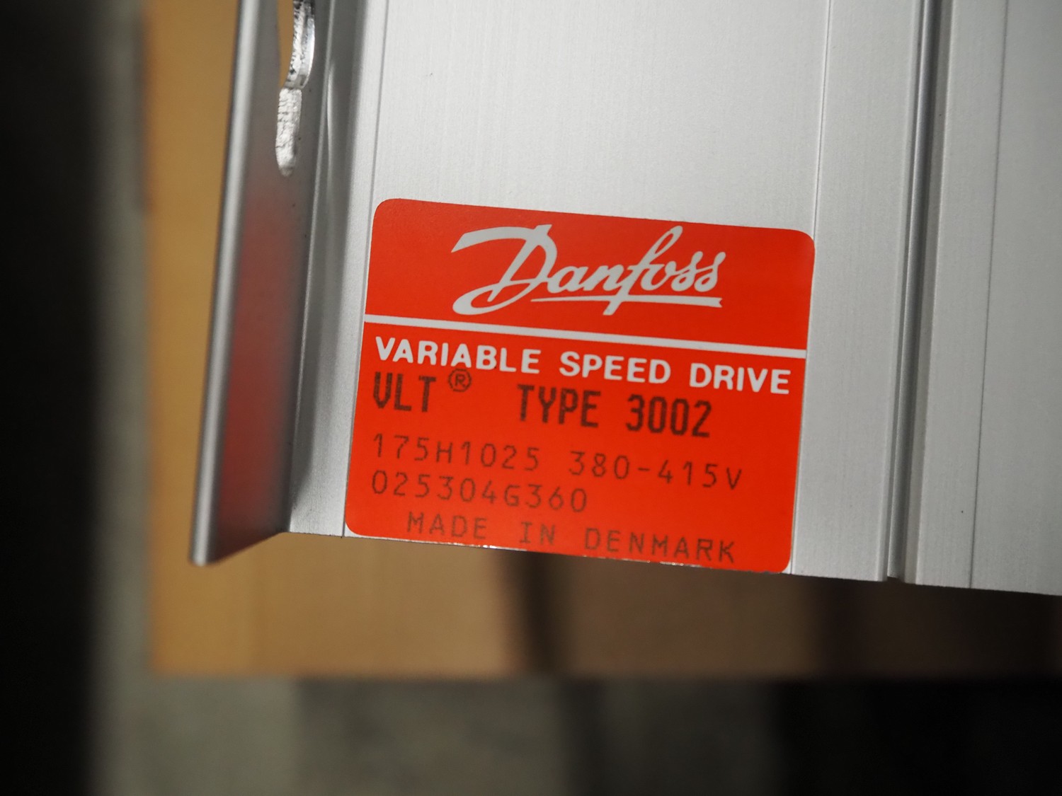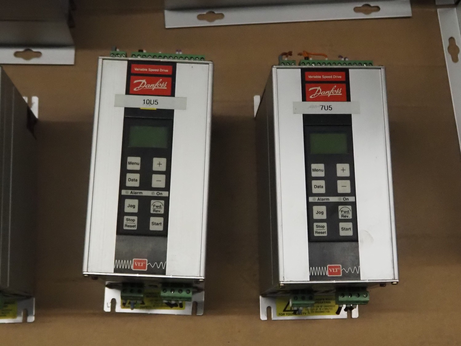 7 Danfoss frequency converters, (1x) type: 3002, 380-415 V, dimensions: 280 mm x 300 mm x 180 mm, (1x) type: 3003, 380-415 V, 280 mm x 300 mm x 180 mm, (1x) type: 3003, 380-415 V, dimensions: 280 mm x 420 mm x 180 mm,(4x) type: 2020, 220/230/240 V, 50/60 Hz, 10 A, dimensions: (4x) 110 mm x 260 mm x 180 mm.
