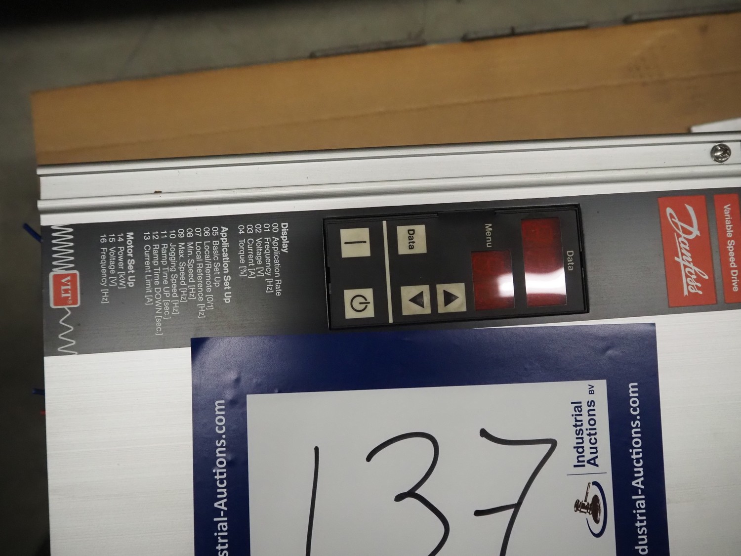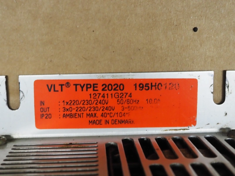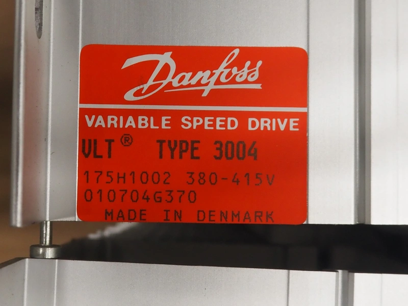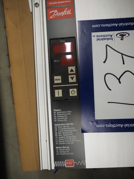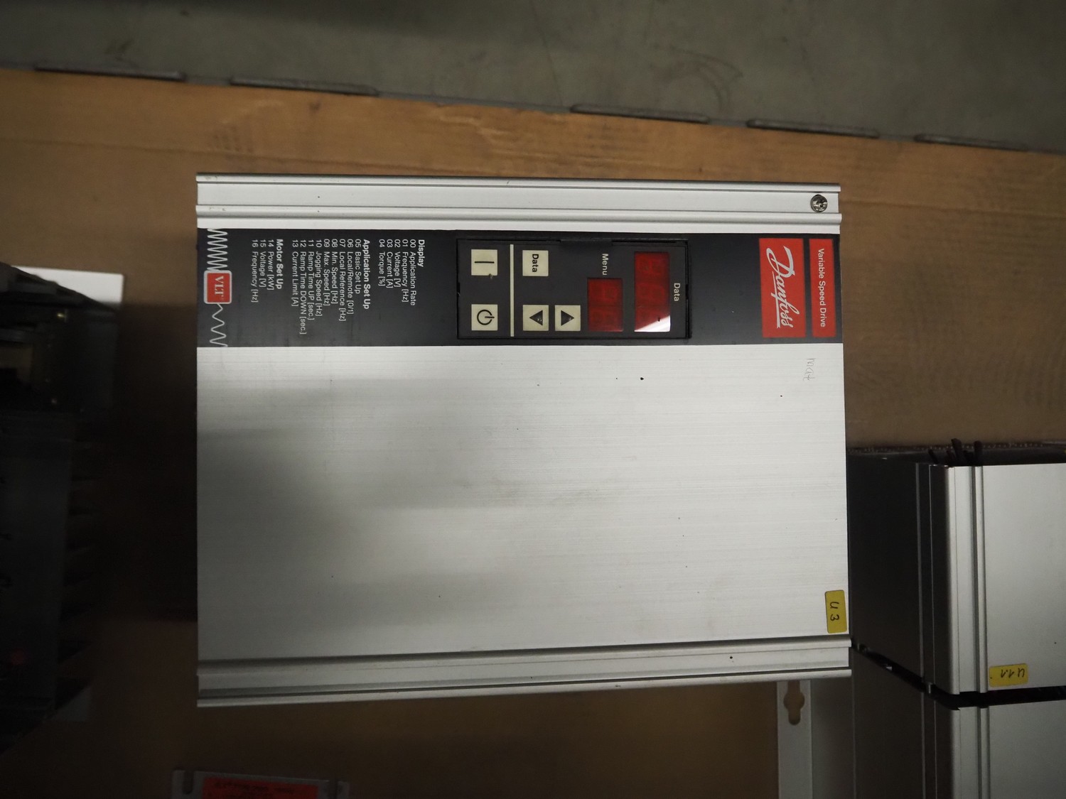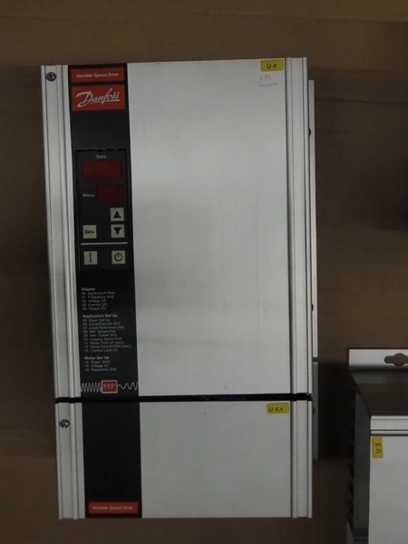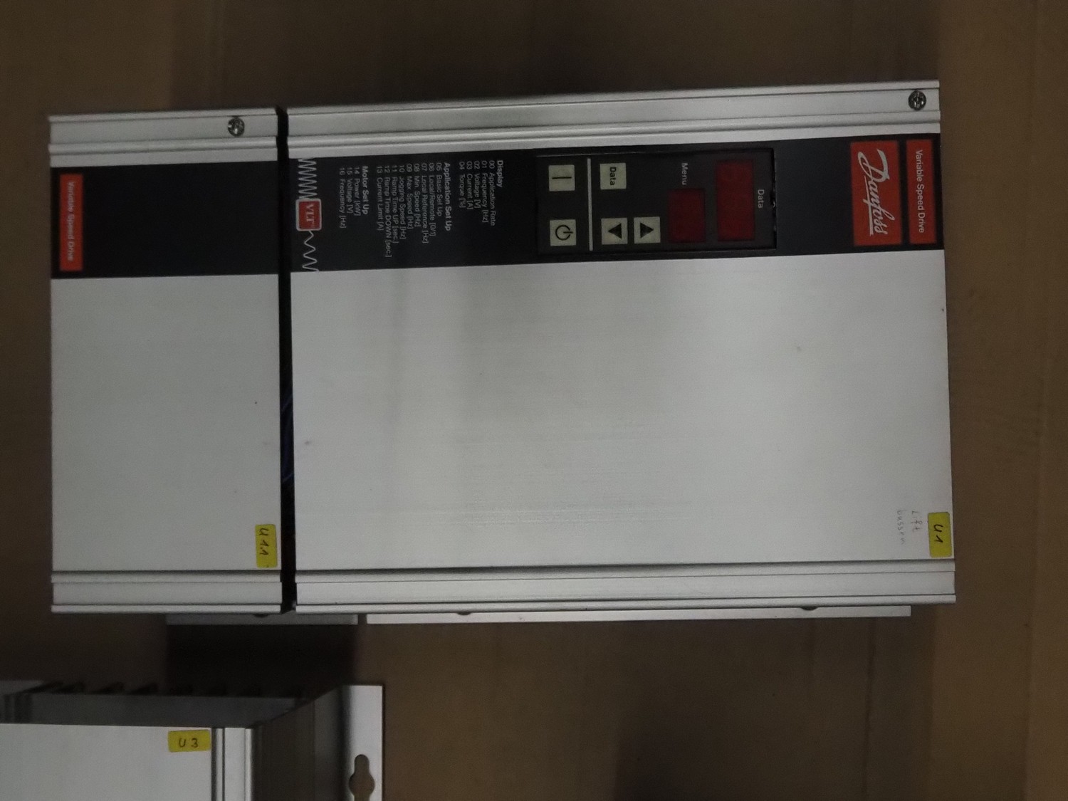 7 Danfoss frequency converters, (1x) type: 3002, 380-415 V, dimensions: 280 mm x 300 mm x 180 mm, (1x) type: 3003, 380-415 V, 280 mm x 300 mm x 180 mm, (1x) type: 3003, 380-415 V, dimensions: 280 mm x 420 mm x 180 mm,(4x) type: 2020, 220/230/240 V, 50/60 Hz, 10 A, dimensions: (4x) 110 mm x 260 mm x 180 mm.