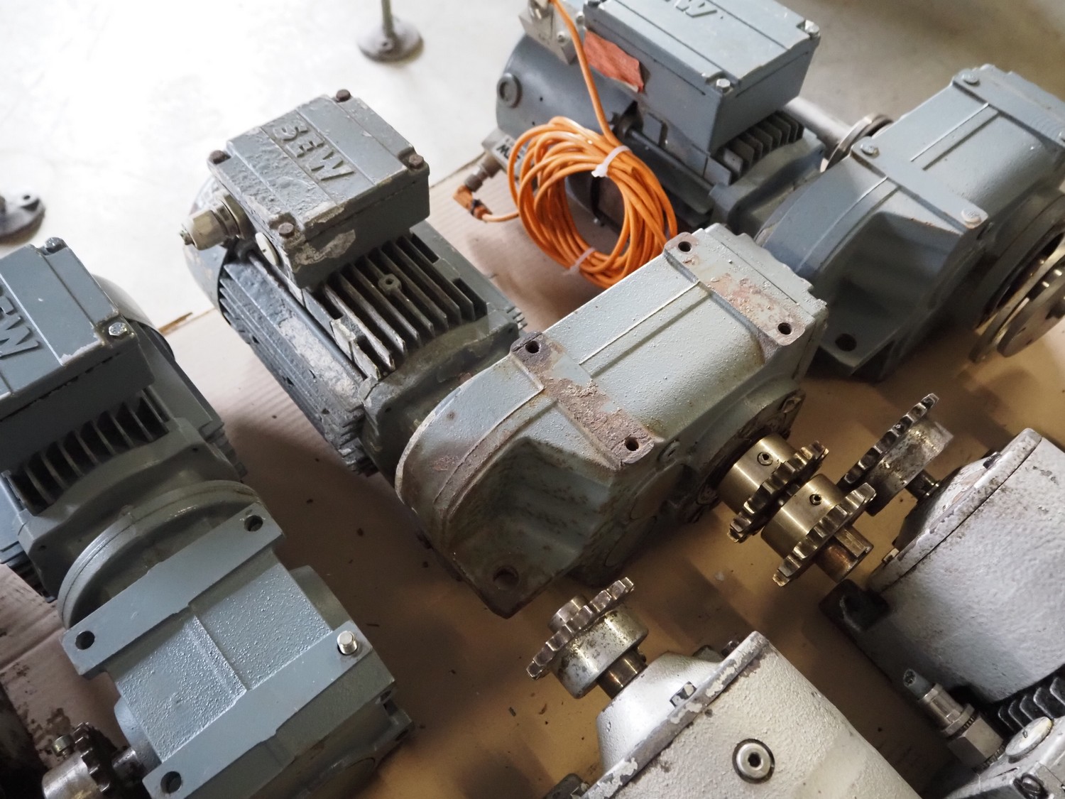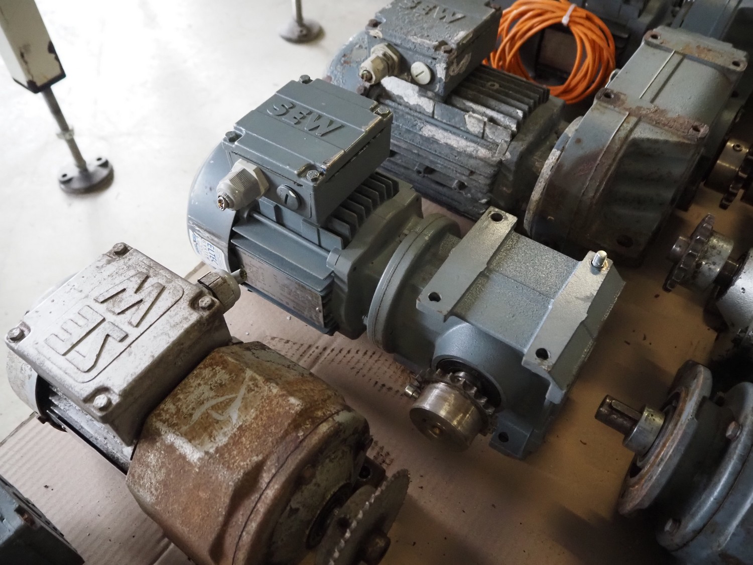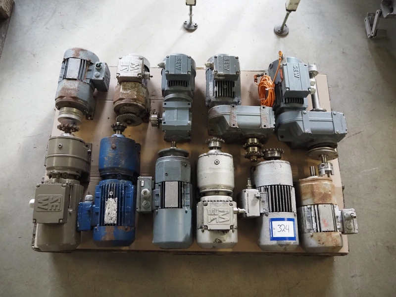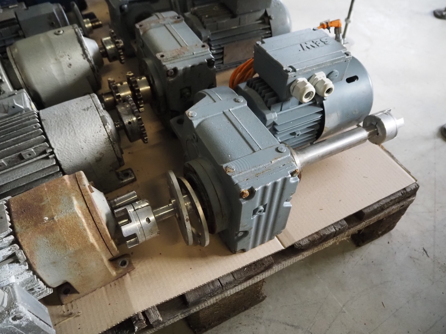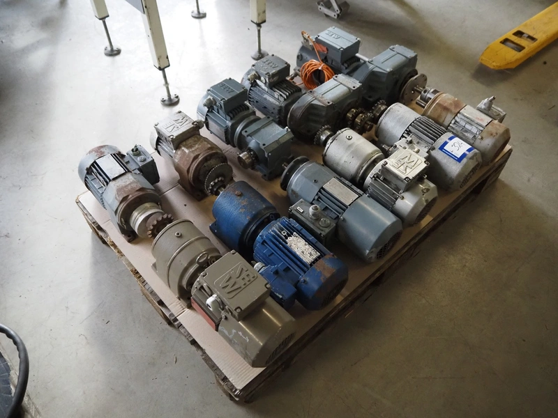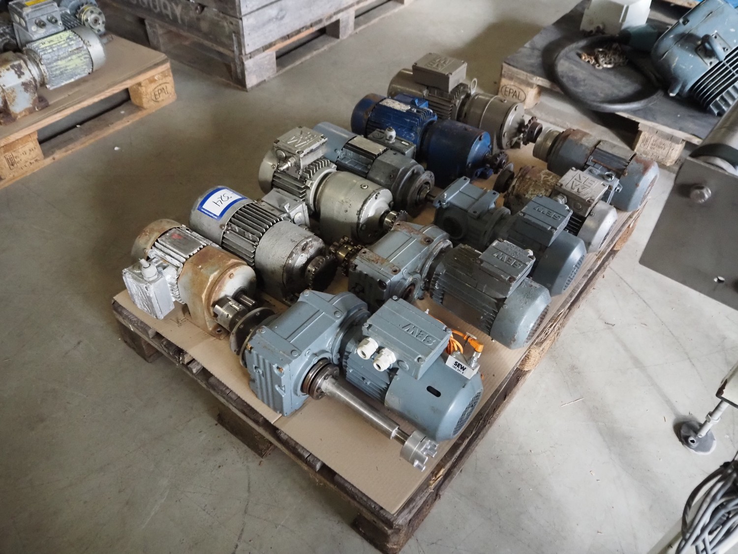Pallet with 11 SEW Eurodrive motors, dimensions: 1200 mm x 800 mm x 380 mm.