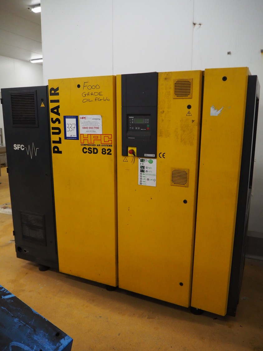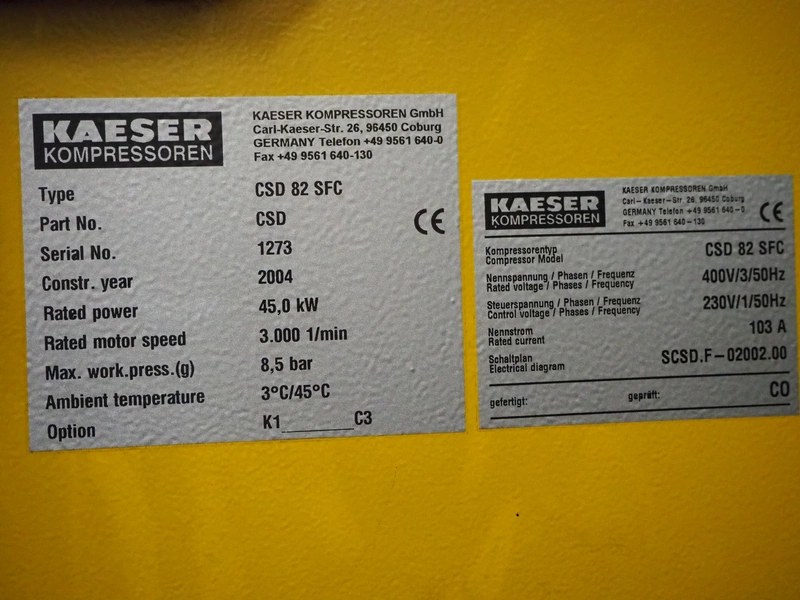 Kaeser screw air compressor, model: CSD 82 SFC, serial number: 1273, year of construction: 2004, 400 V, 3 Ph, 50 Hz, 103 A, 45.0 kW, dimensions: 2200 mm x 1050 mm x 1860 mm.