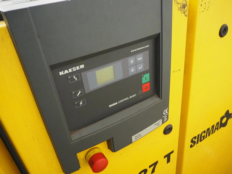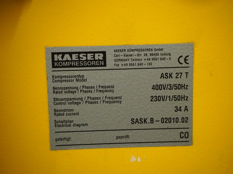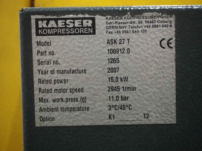 Kaeser screw air compressor, model: ASK 27 T, serial number: 1265, year of construction: 2007, 400 V, 3 Ph, 50 Hz, 34 A, 15.0 kW, dimensions: 1500 mm x 800 mm x 1250 mm.