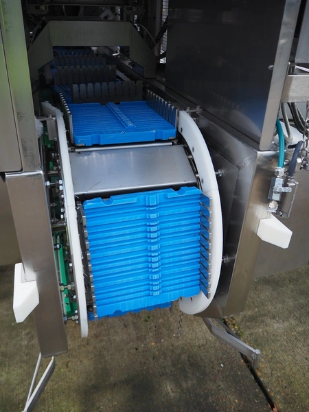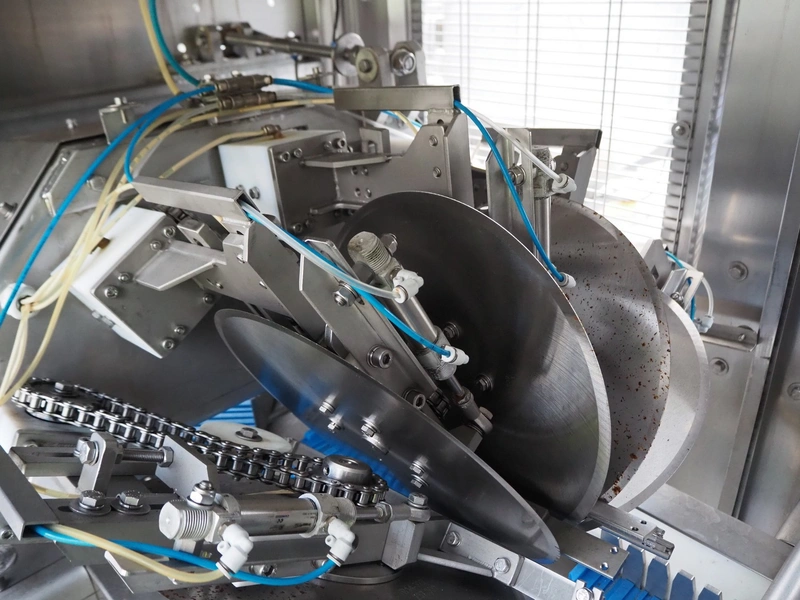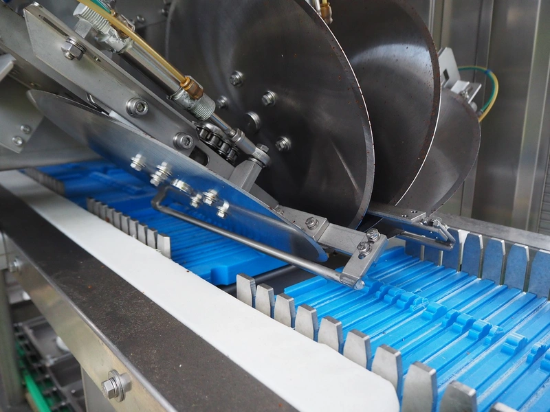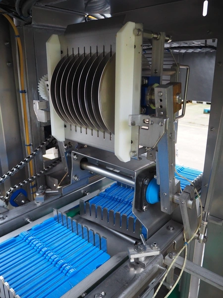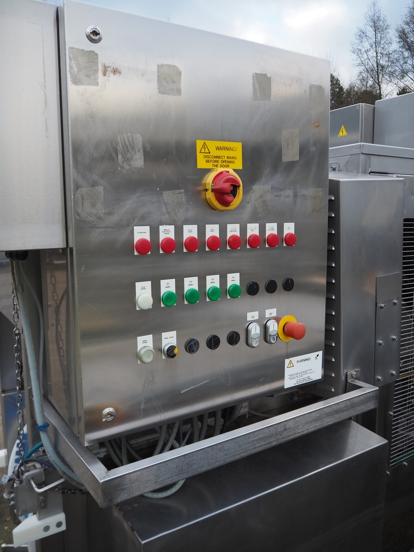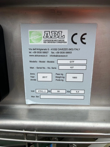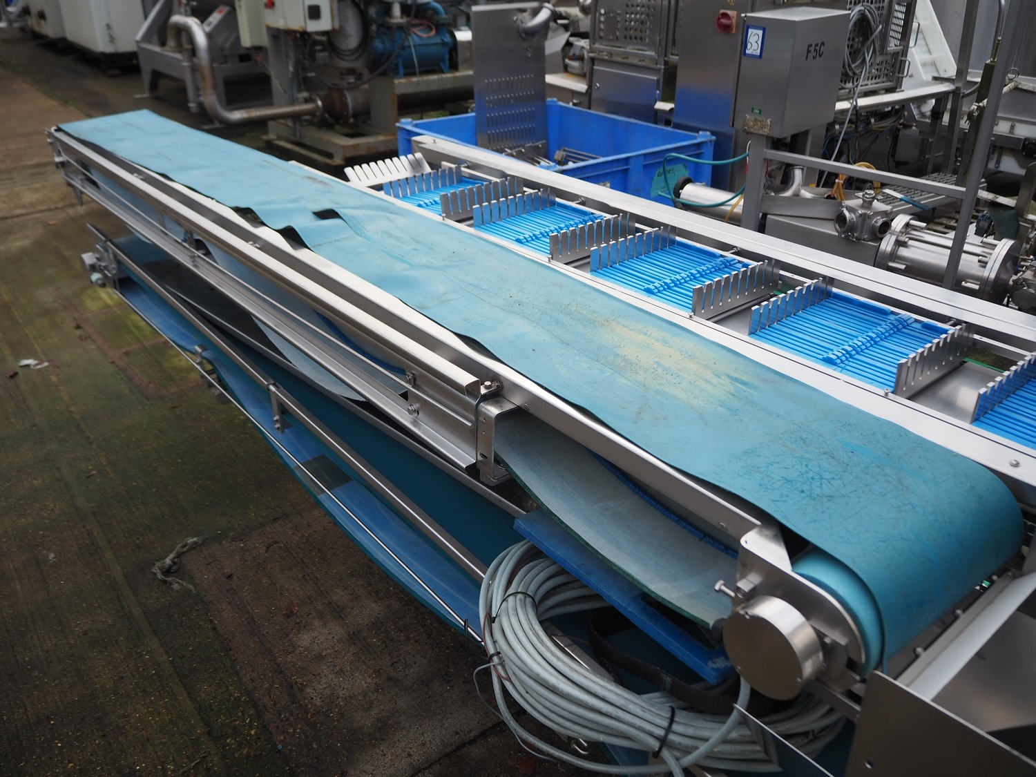 ABL vegetable slicer/chunker for pineapple, melon and papaya, model: GTF, serial number: 107, year of construction: 2017, 415 V, 50 Hz, 5.3 kW, weight: 1800 kg, working width: 255 mm x 260 mm, plastic belt, belt width: 300 mm, total dimensions: 7000 mm x 1350 mm x 2050 mm.