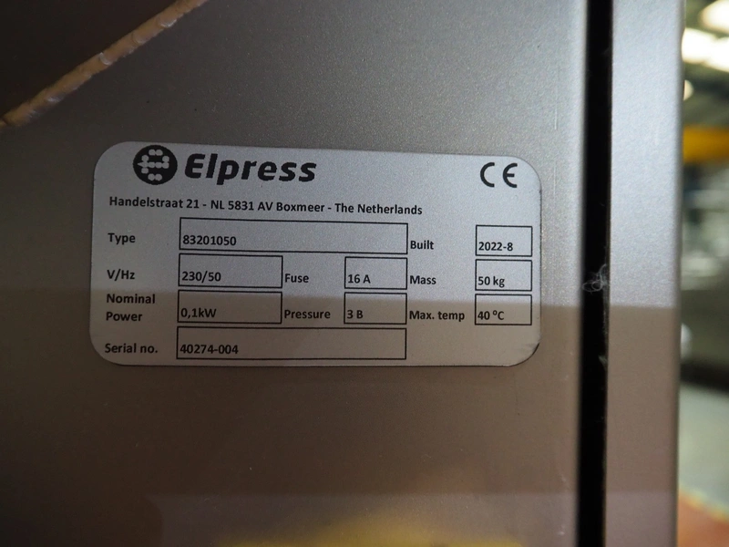 Elpress tourniquet with hand disinfection unit, type: 83201050, serial number: 40274-004, year of construction: 2022-08, 230 V, 50 Hz, 16 A, 0.1 kW, weight: 50 kg, dimensions: 1400 mm x 800 mm x 1200 mm.
