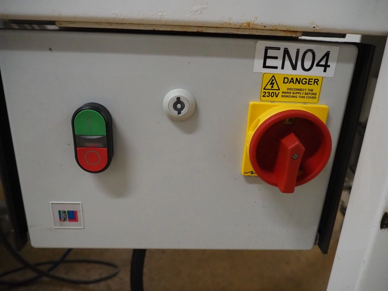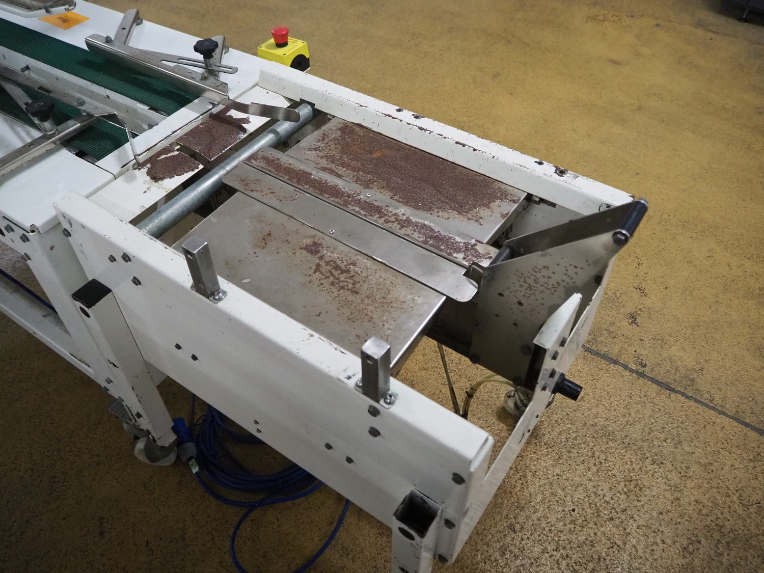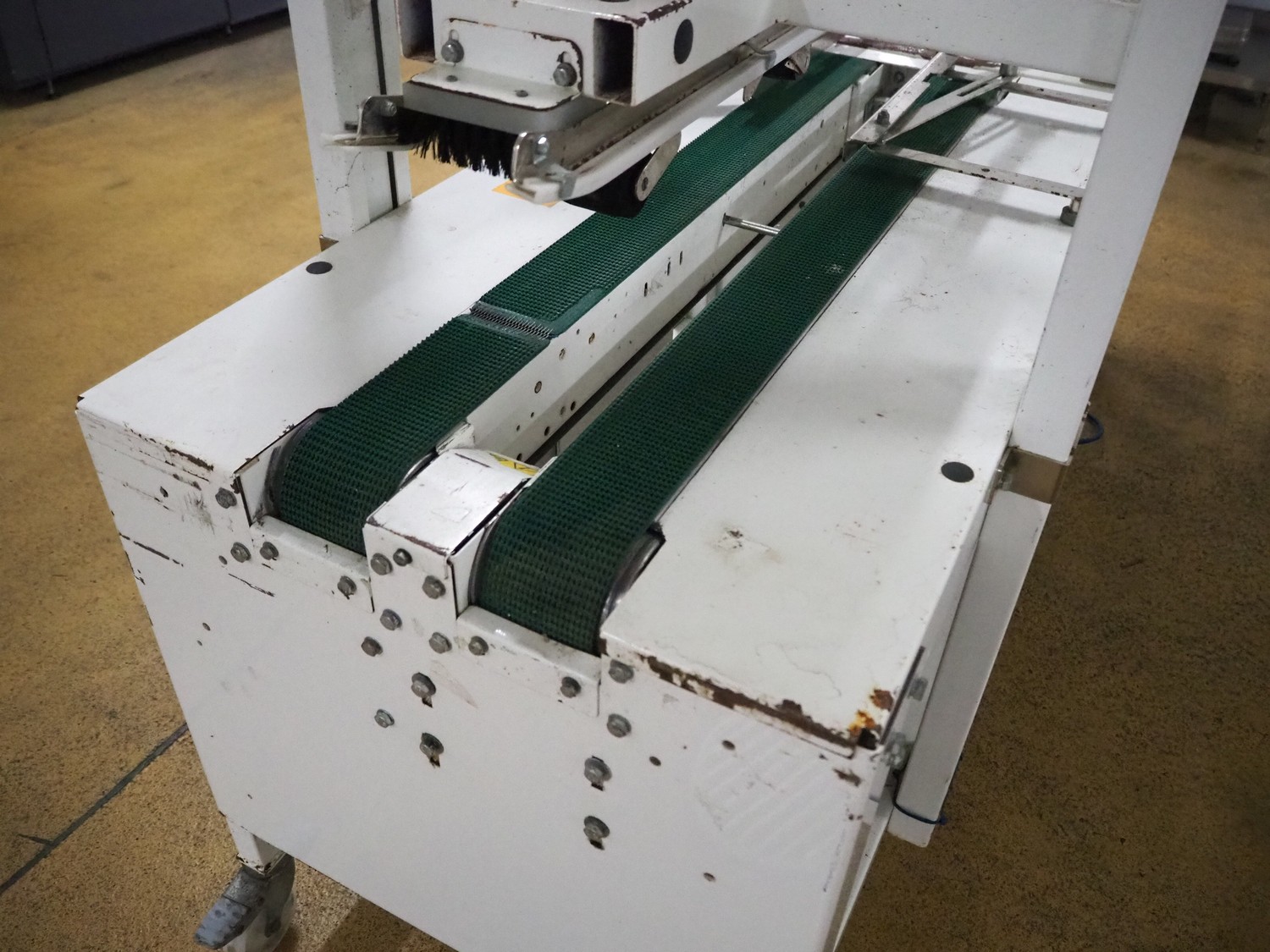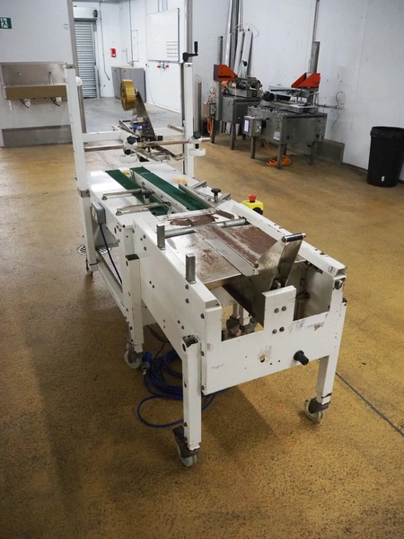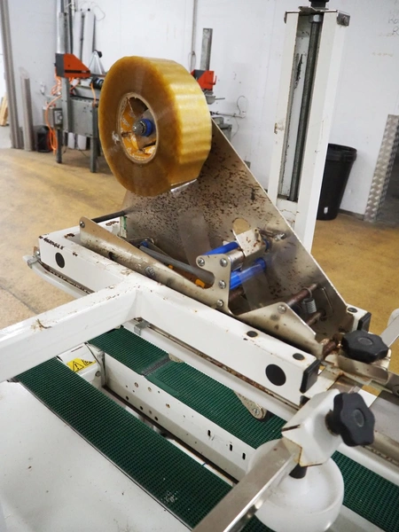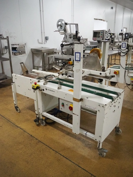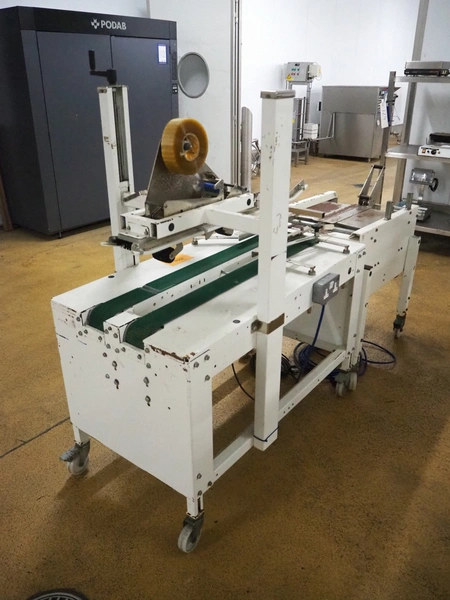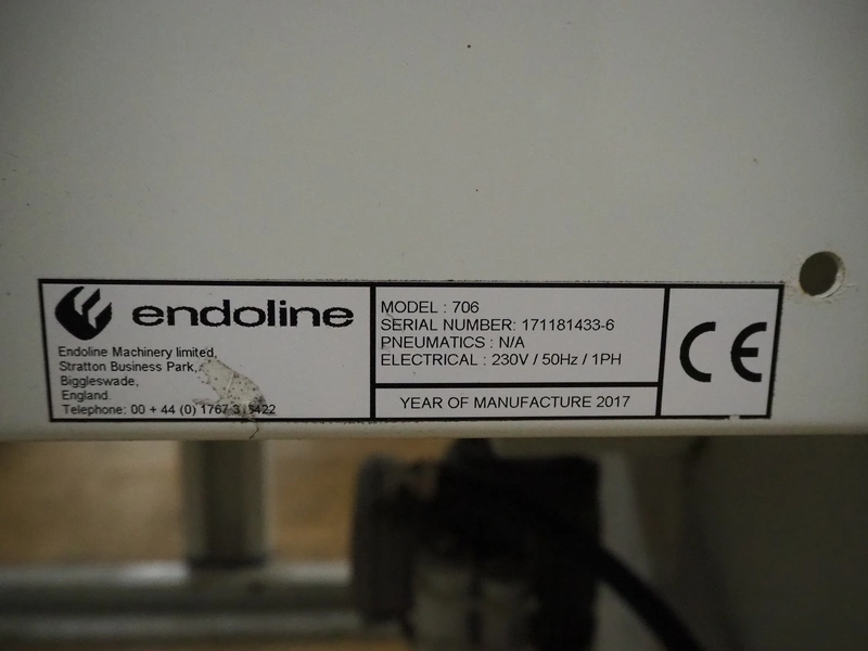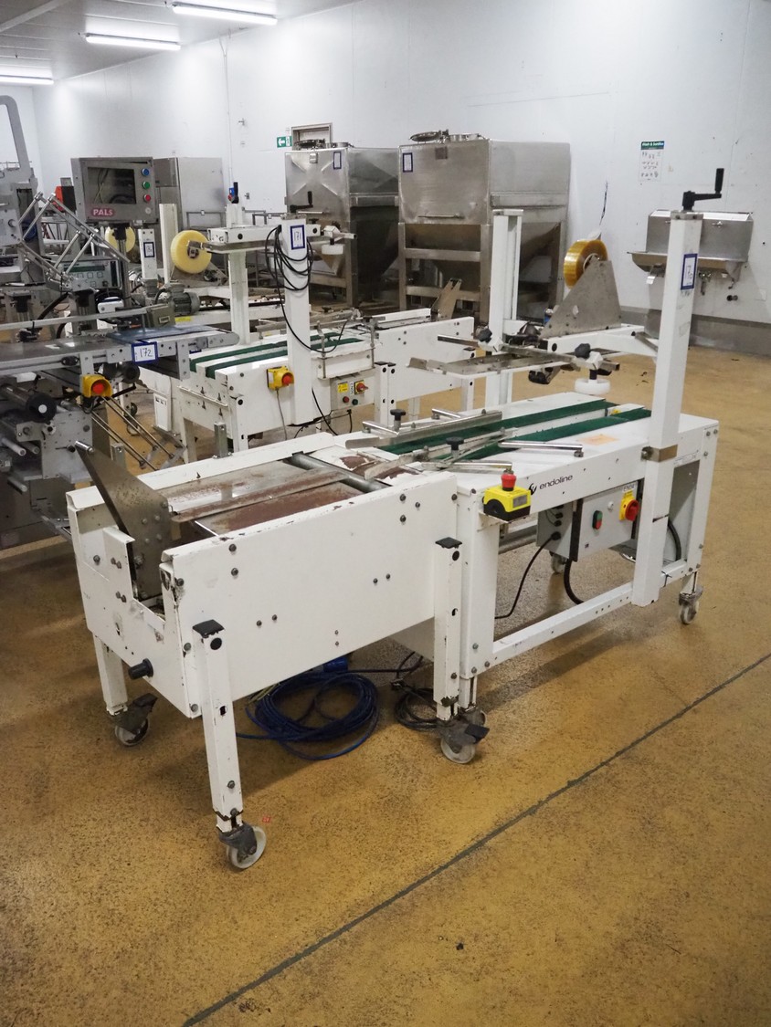 Endoline mobile box closing machine with infeed belt, model: 706, serial number: 171181433-6, year of construction: 2017, 230 V, 1 Ph, 50 Hz, belt width: 160 mm, tape width: 50 mm, total dimensions: 2020 mm x 800 mm x 1570 mm.