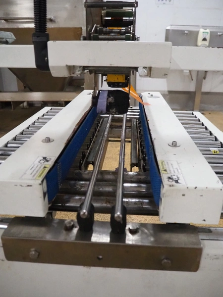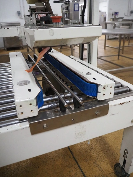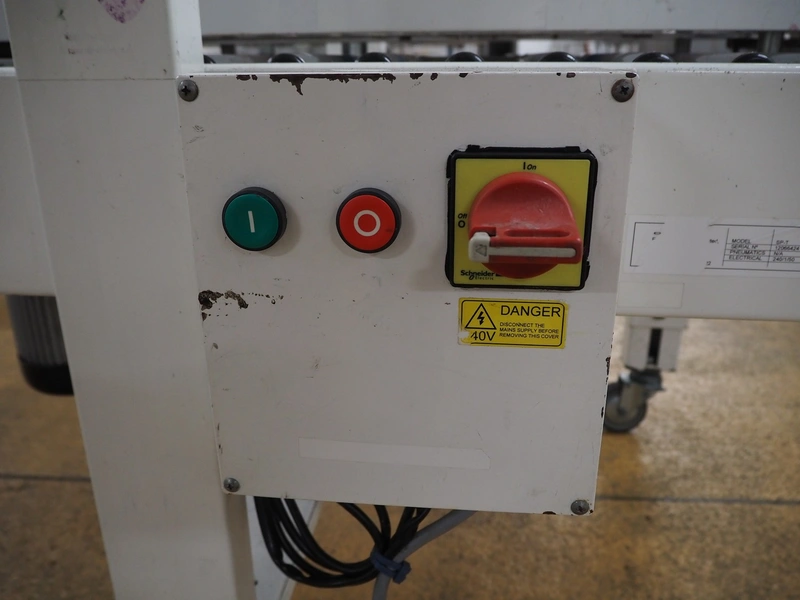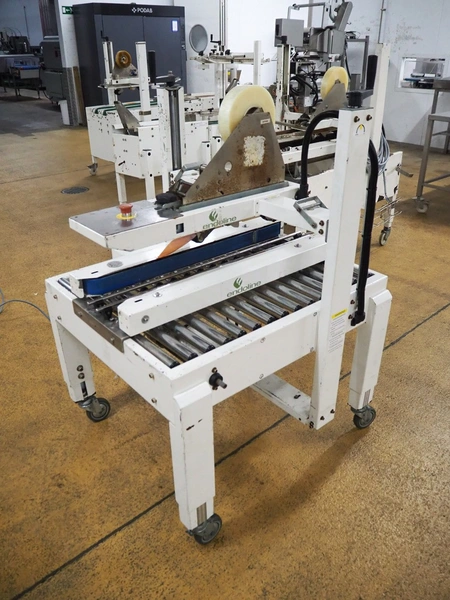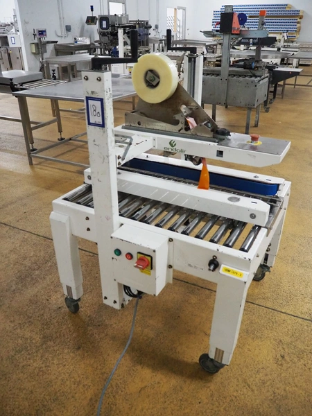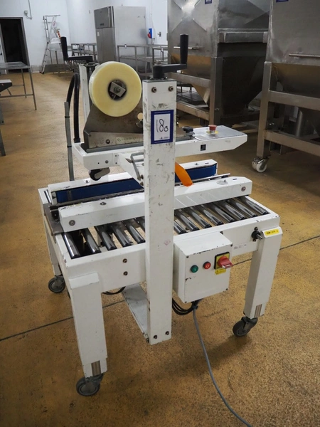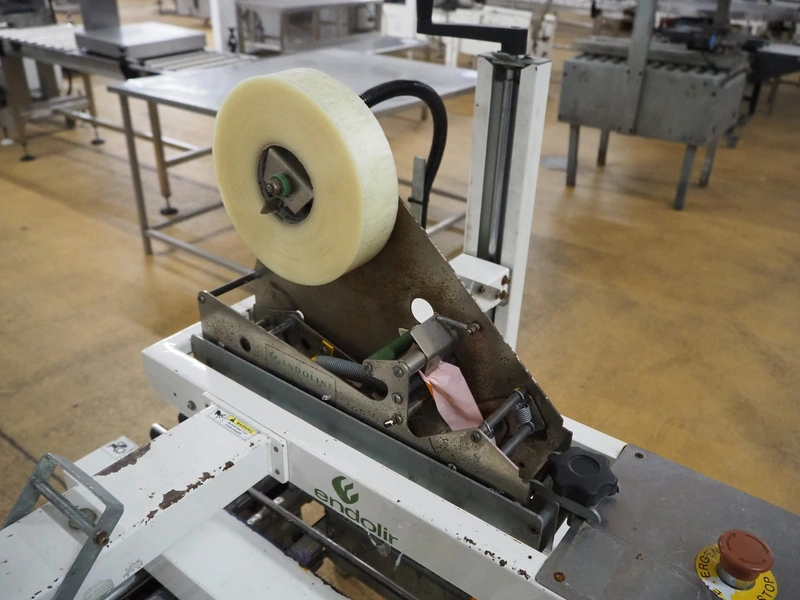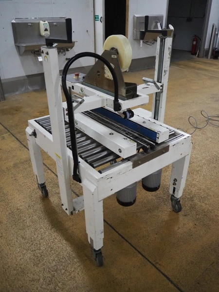 Endoline mobile box closing machine, model: SP-T, serial number: 12066424, 240 V, 1 Ph, 50 Hz, belt width: 170 mm, tape width: 50 mm, total dimensions: 1100 mm x 950 mm x 1540 mm.