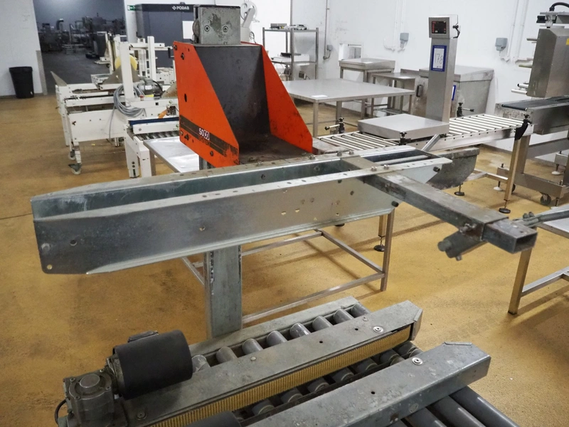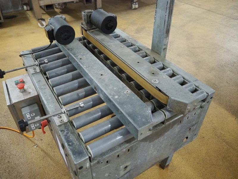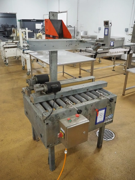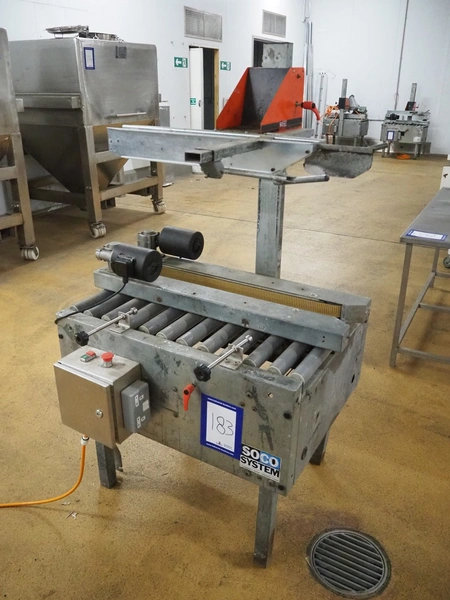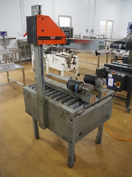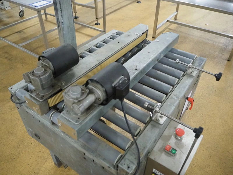 Soco System box closing machine, plastic rollers, roller width: 600 mm, belt width: 90 mm, total dimensions: 1000 mm x 950 mm x 1680 mm. Without taper.