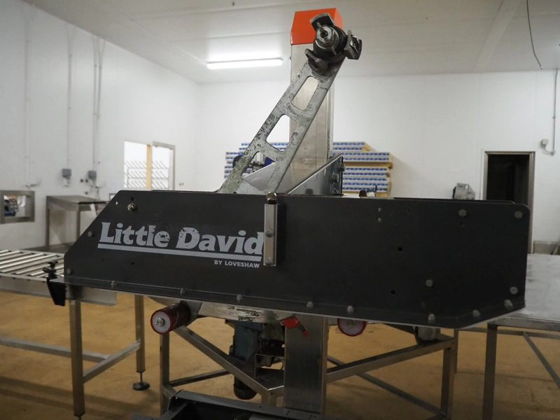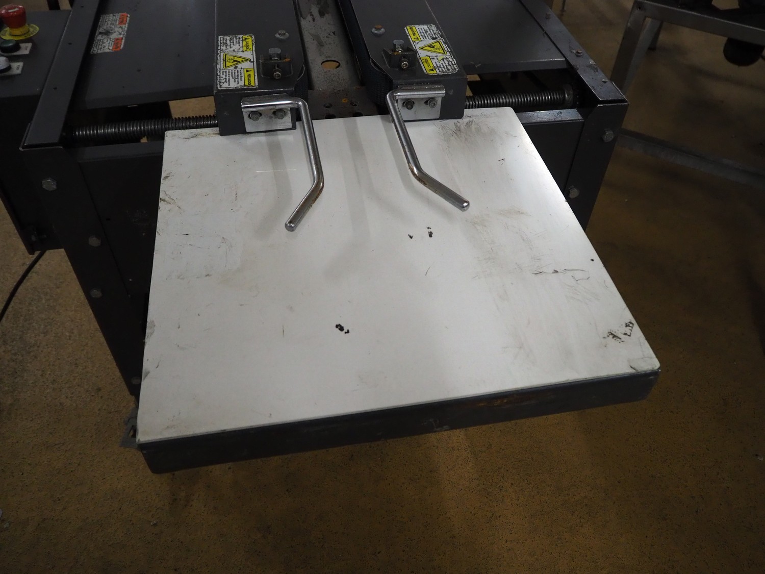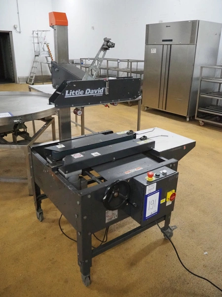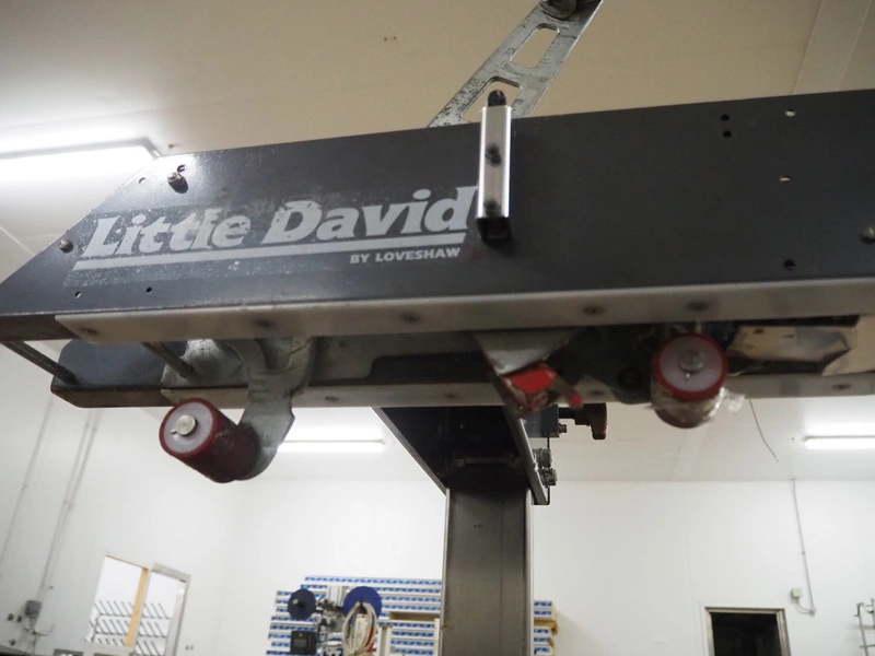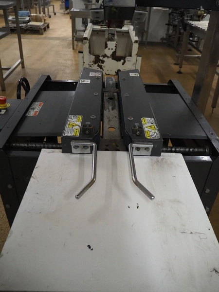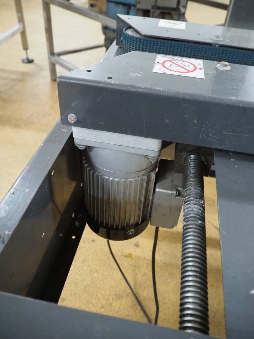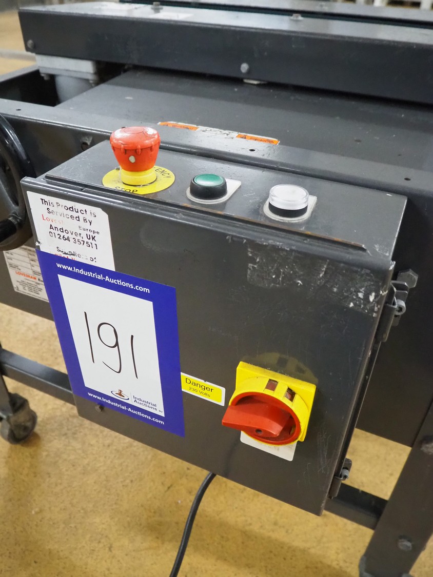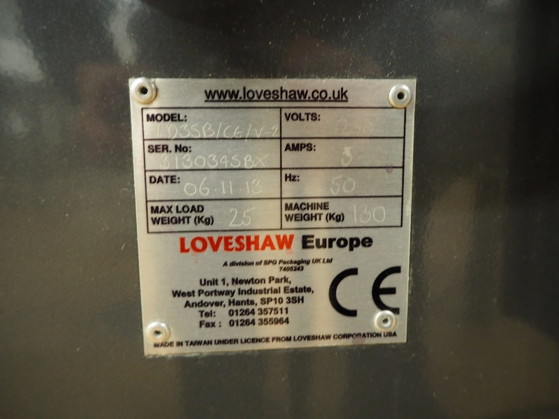 Loveshaw mobile box closing machine, model: LD35B/CG/V-2, serial number: 313034SBX, year of construction: 06-11-13, 230 V, 3 Ph, 50 Hz, machine weight: 130 kg, belt width: 85 mm, total dimensions: 1260 mm x 1050 mm x 1700 mm.