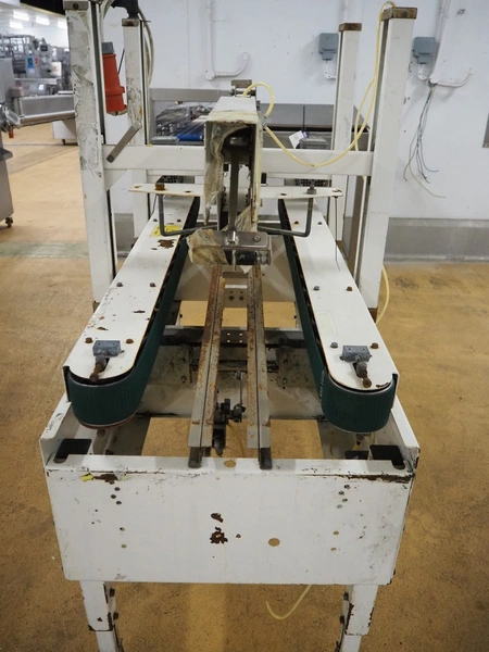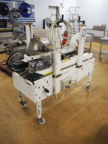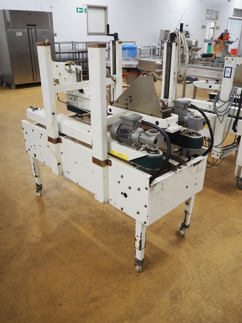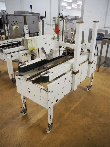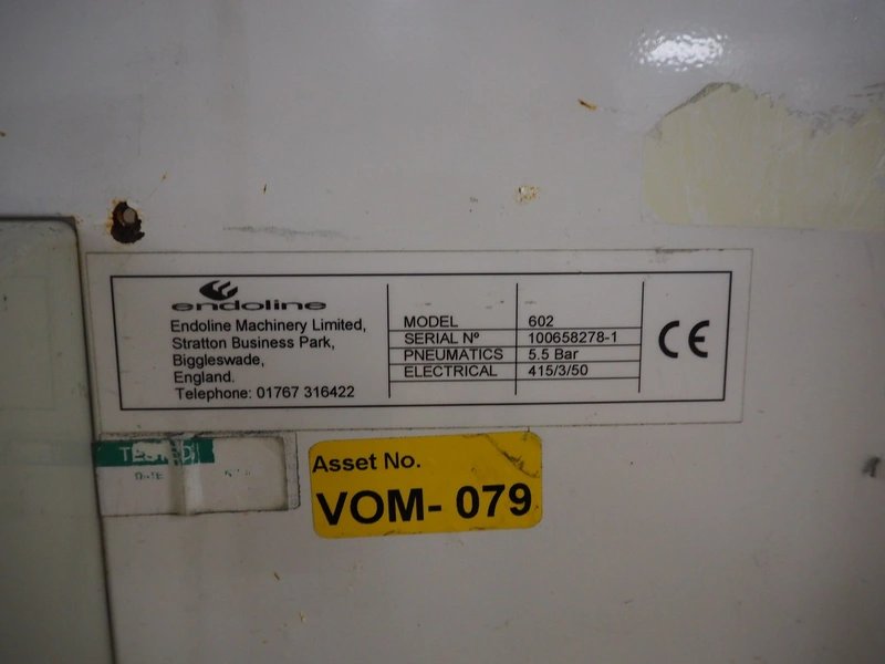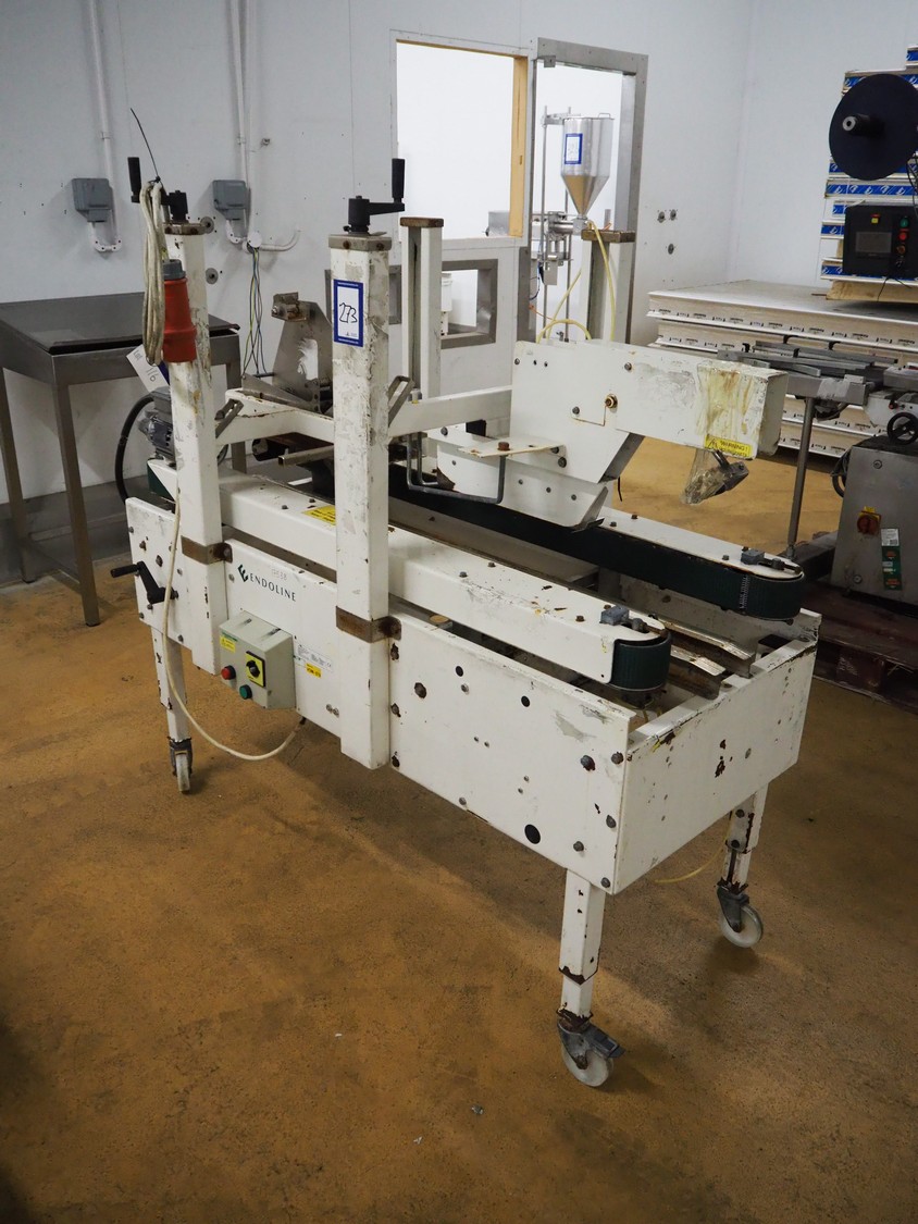 Endoline mobile box closing machine, model: 602, serial number: 100658278-1, 415 V, 3 Ph, 50 Hz, clearance: 300 mm x 150 mm, total dimensions: 1600 mm x 750 mm x 1500 mm.