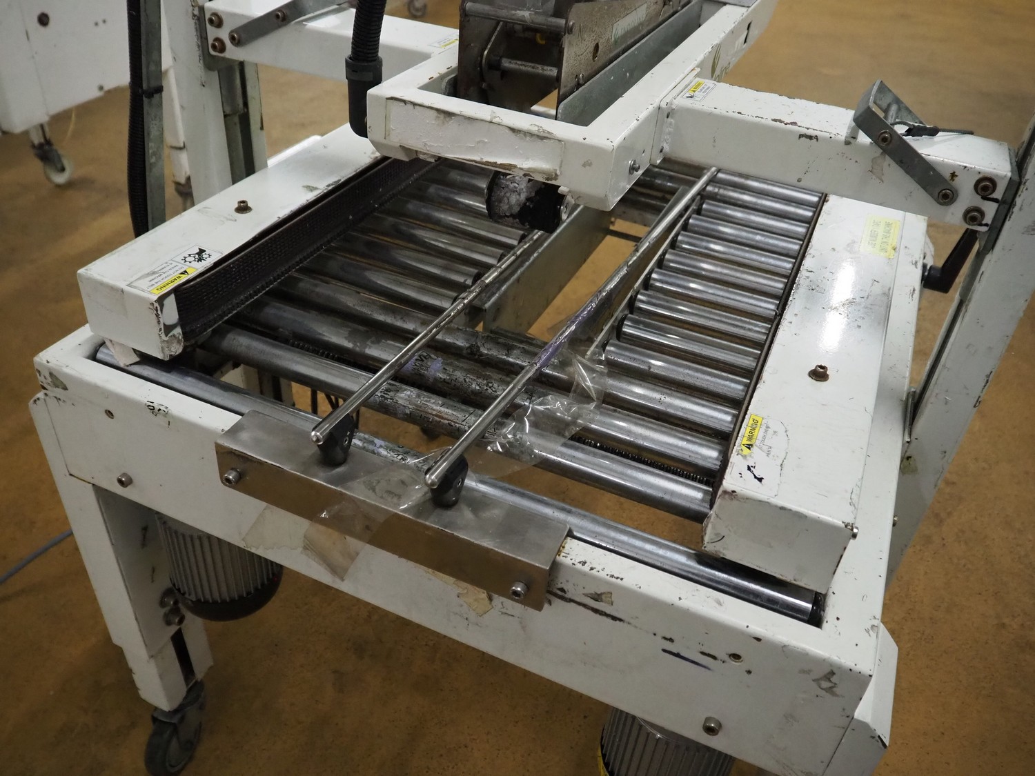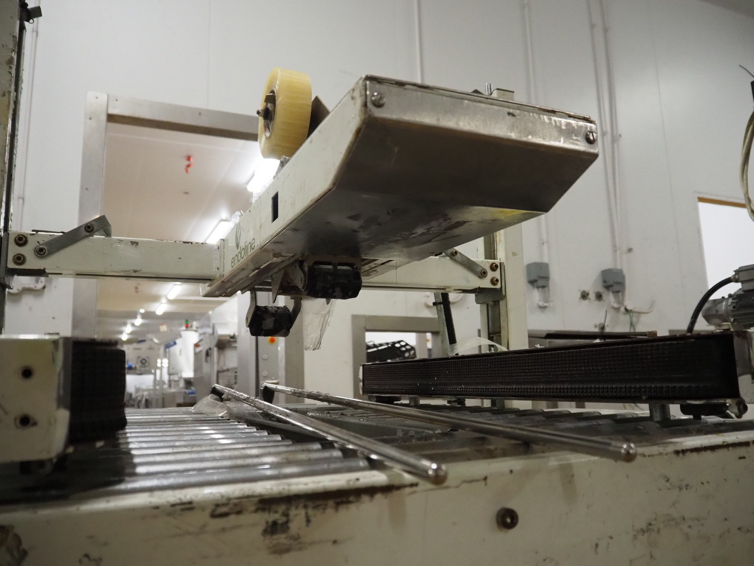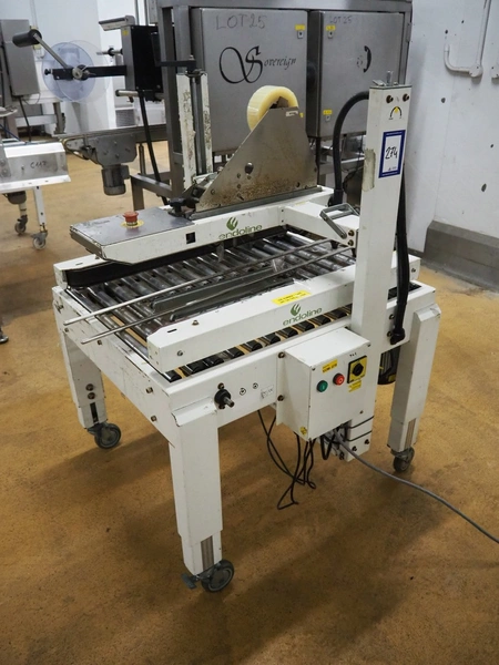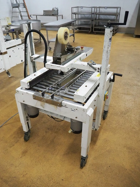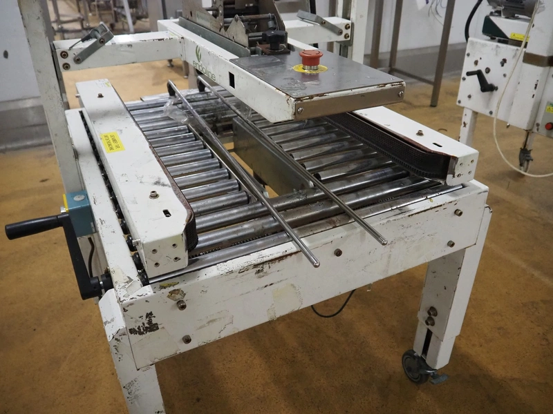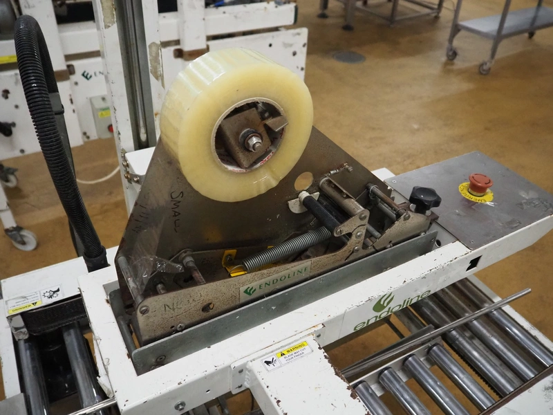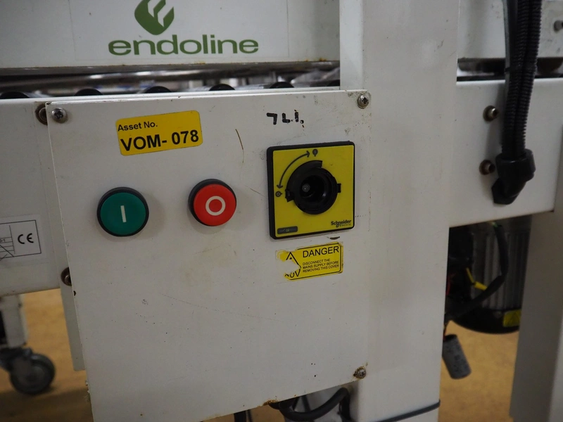 Endoline mobile box closing machine, clearance: 470 mm x 200 mm, total dimensions: 1000 mm x 900 mm x 1400 mm. Incomplete.