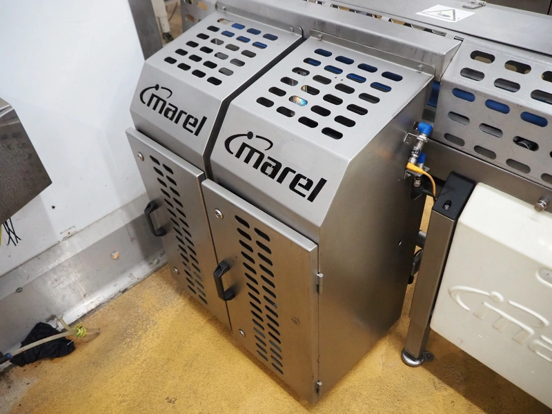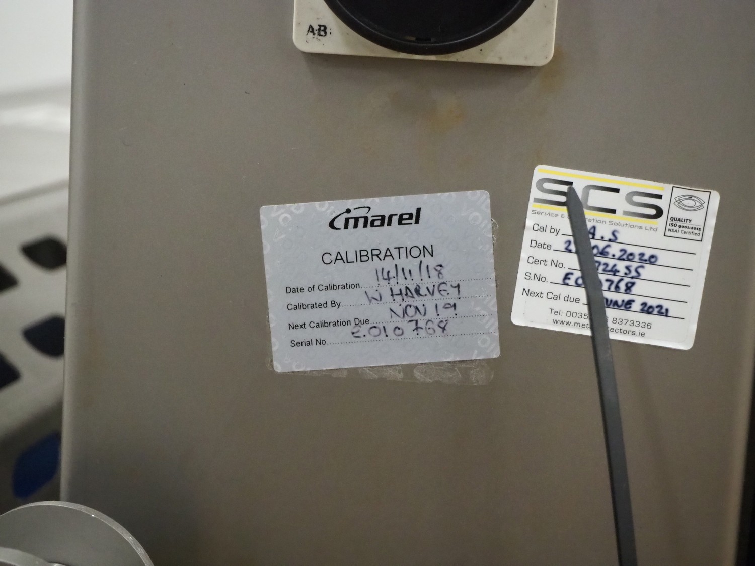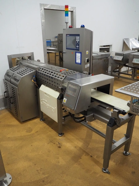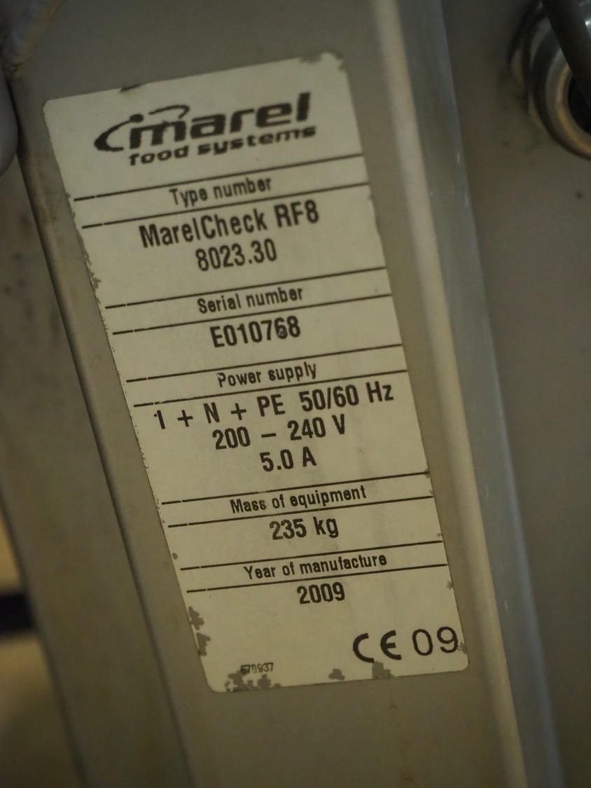 Thermo Fischer metal detector and Marel checkweigher with double rejector, type checkweigher: MarelCheck RF8 8023.30, serial number: E010768, year of construction: 2009, 200-240 V, 1 Ph, 50/60 Hz, 5.0 A, clearance metal detector: 350 mm x 120 mm, plastic belt, belt width: 230 mm, total dimensions: 2650 mm x 1150 mm x 2000 mm.