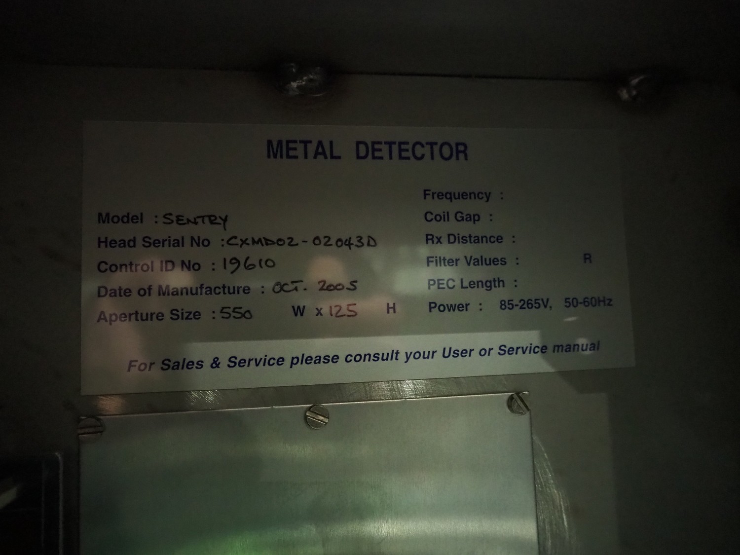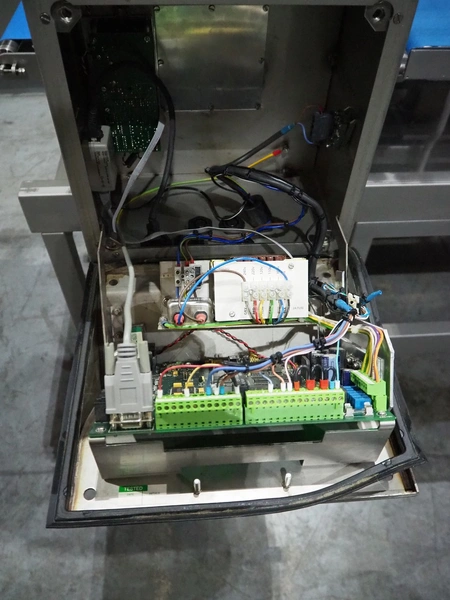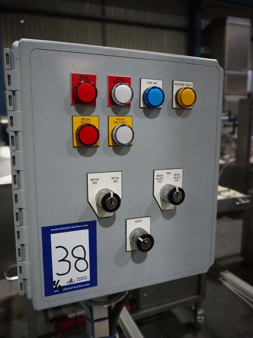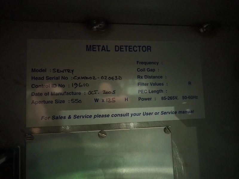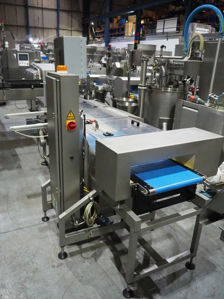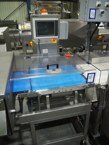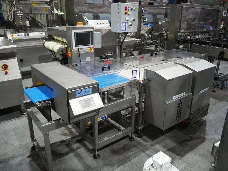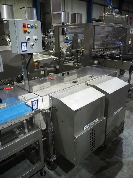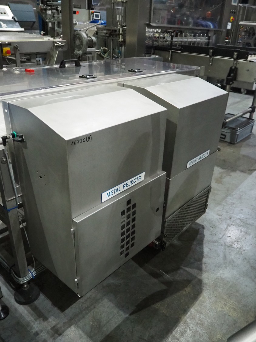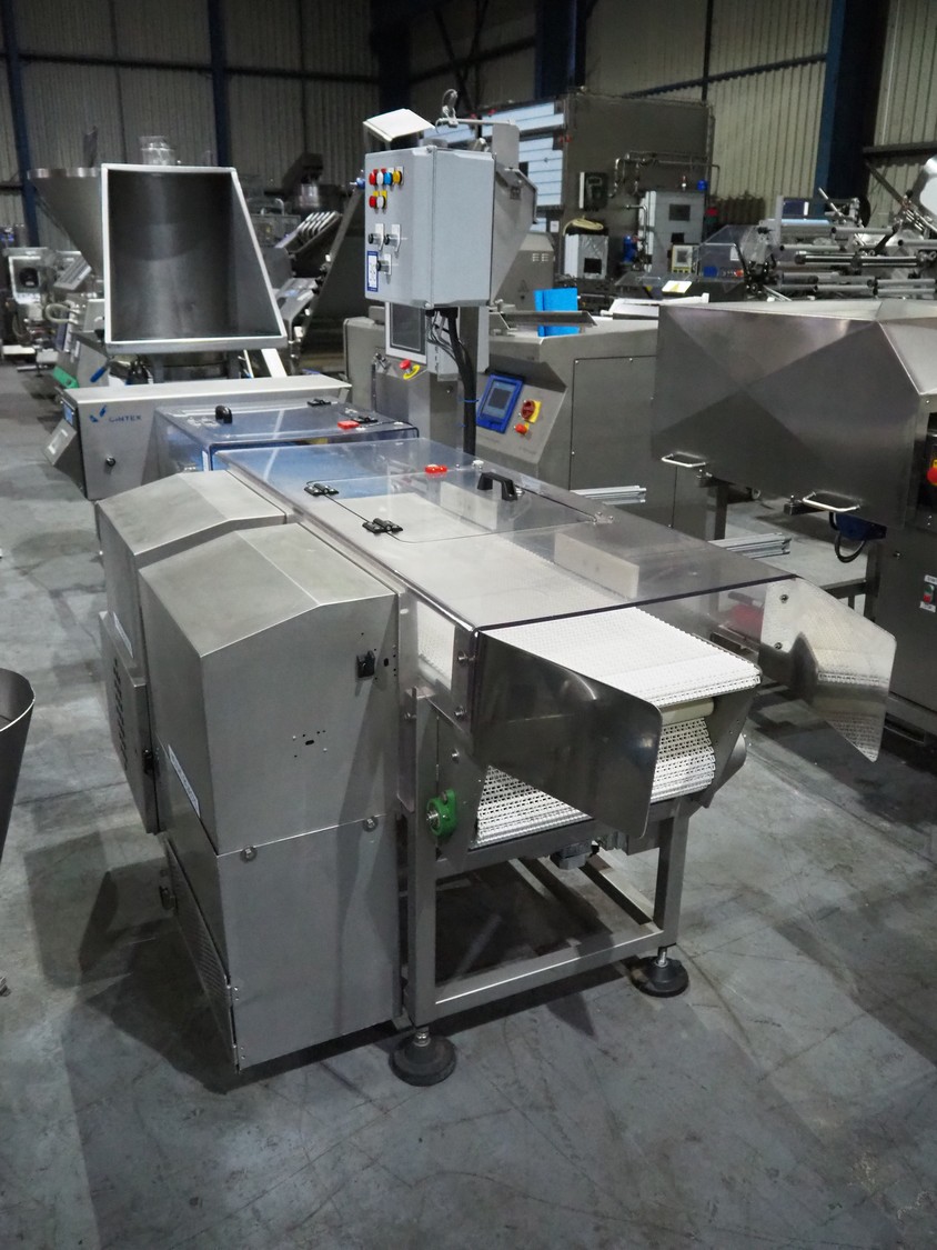 Cintex metal detector and checkweigher system, model metal detector: Sentry, serial number: CXMD02-02043D, year of construction: oct 2005, 85-265 V, 50-60 Hz, plastic belt, belt width: 390 mm, clearance: 550 mm x 110 mm, total dimensions: 1200 mm x 1360 mm x 1500 mm. With double rejector, plastic mesh belt, belt width: 490 mm, total dimensions: 1800 mm x 1490 mm x 1700 mm.