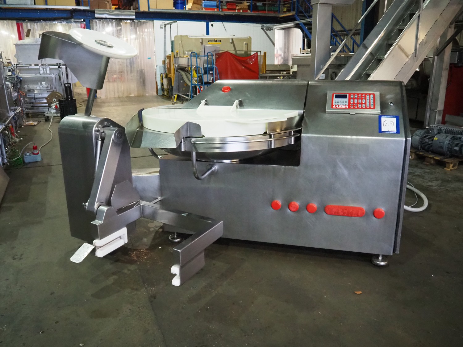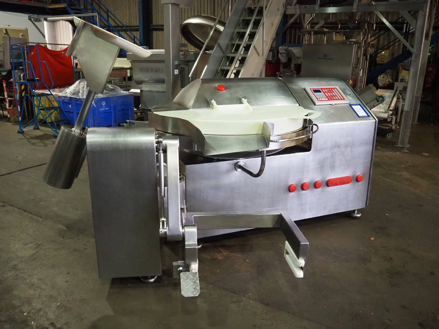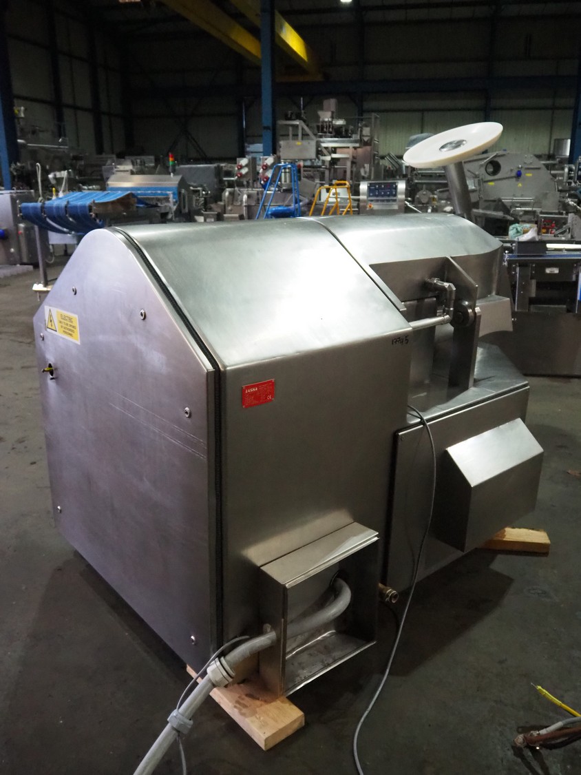 Laska bowl cutter with lifter for 200 liter meat bins and ejector, type: KCU 200, serial number: 6145, year of construction: 2001, 400 V, 3 Ph, 50 Hz, 239 A, 93 kW, dimensions: 3100 mm x 2400 mm x 1830 mm.