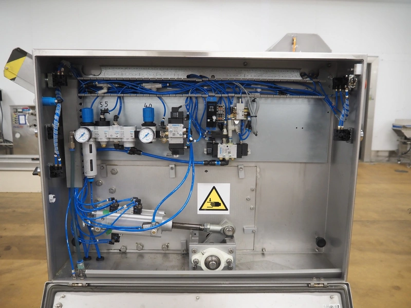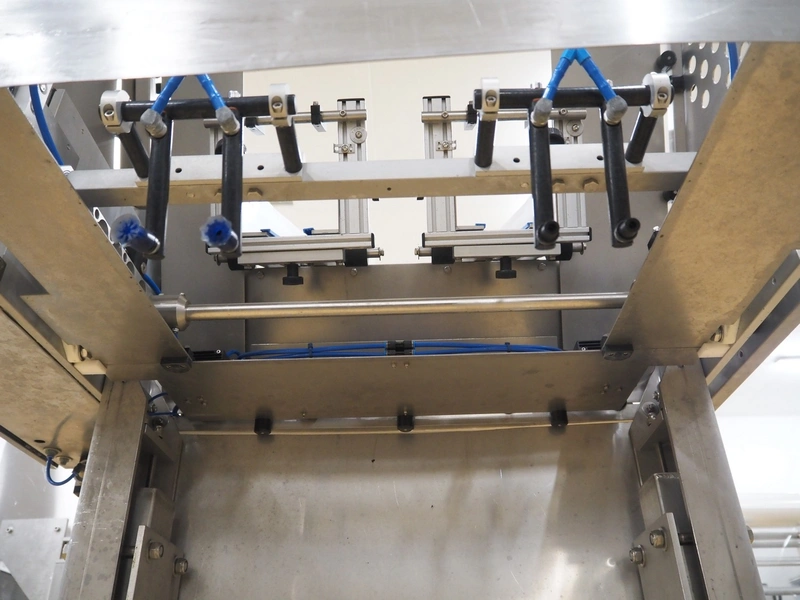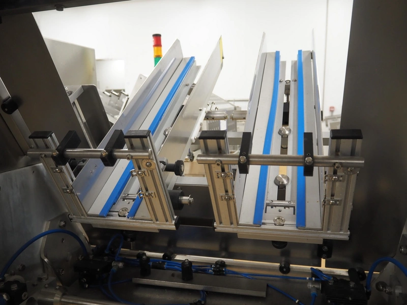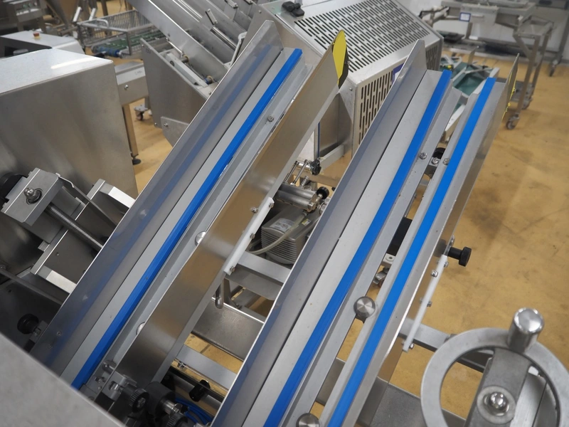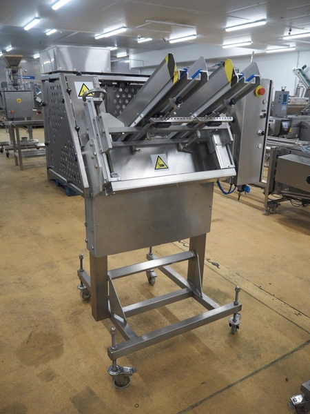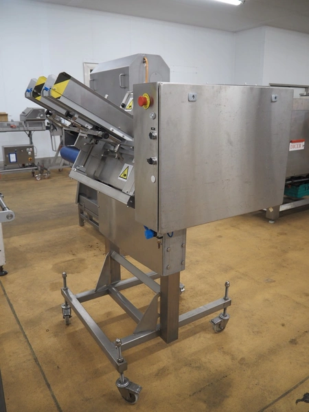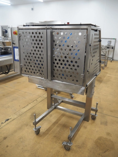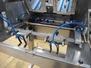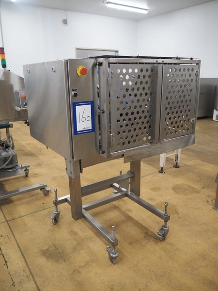 IXIA UK Ltd. mobile 2-lane denester, clearance: (2x) 130 mm x 160 mm, total dimensions: 1200 mm x 1100 mm x 1650 mm.