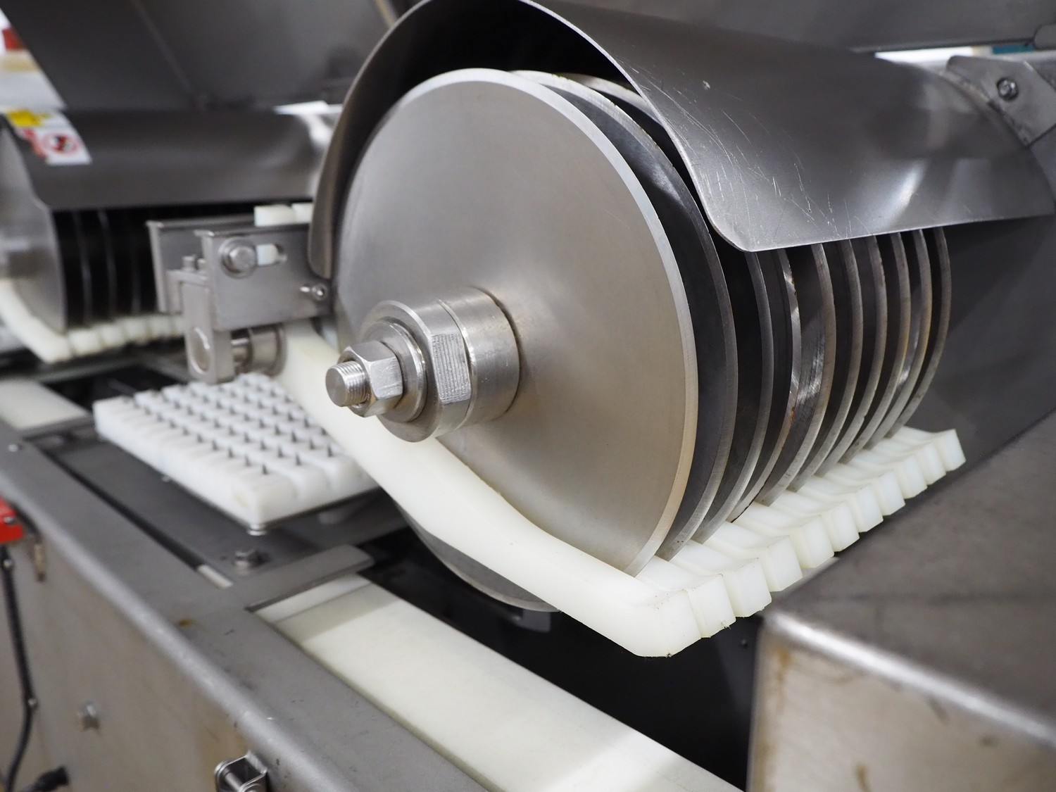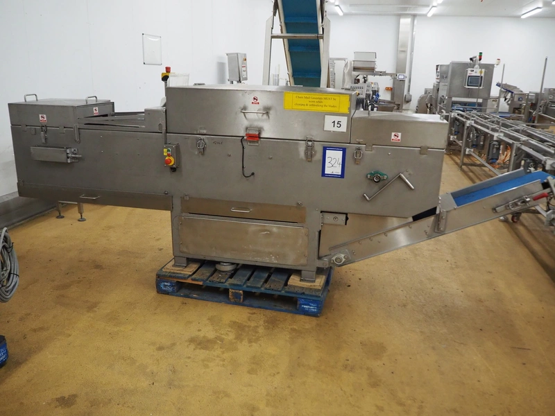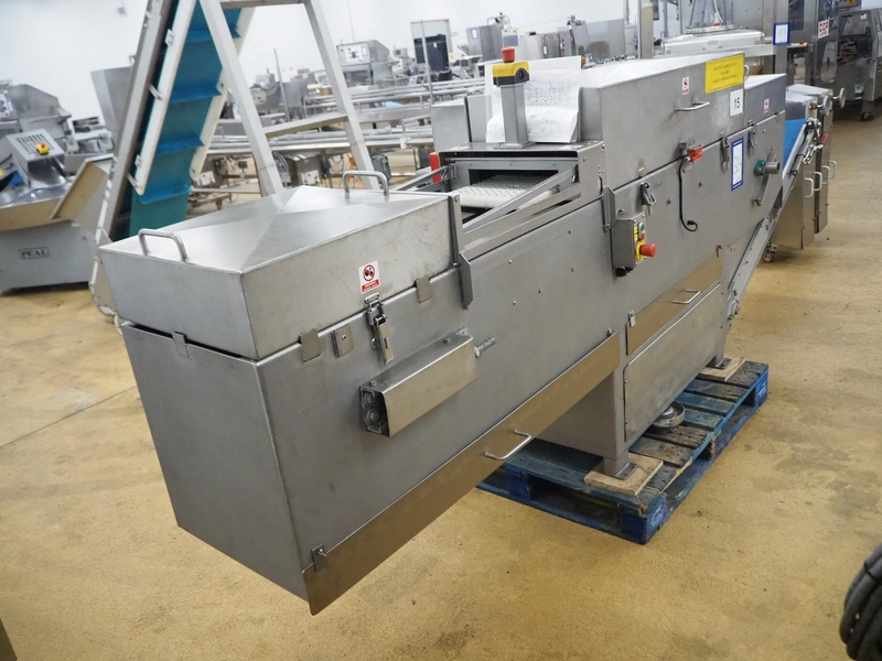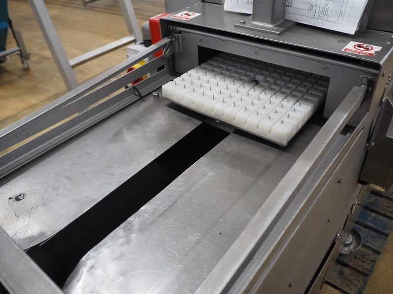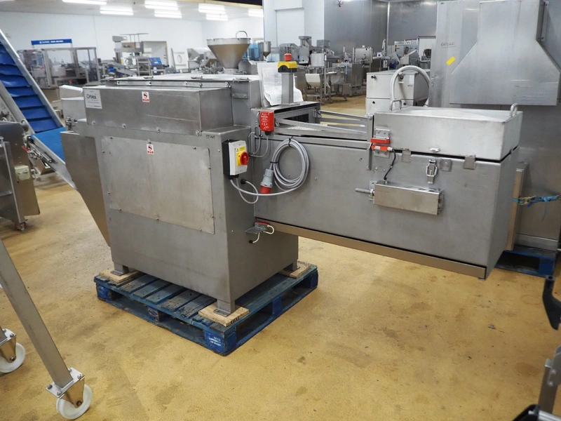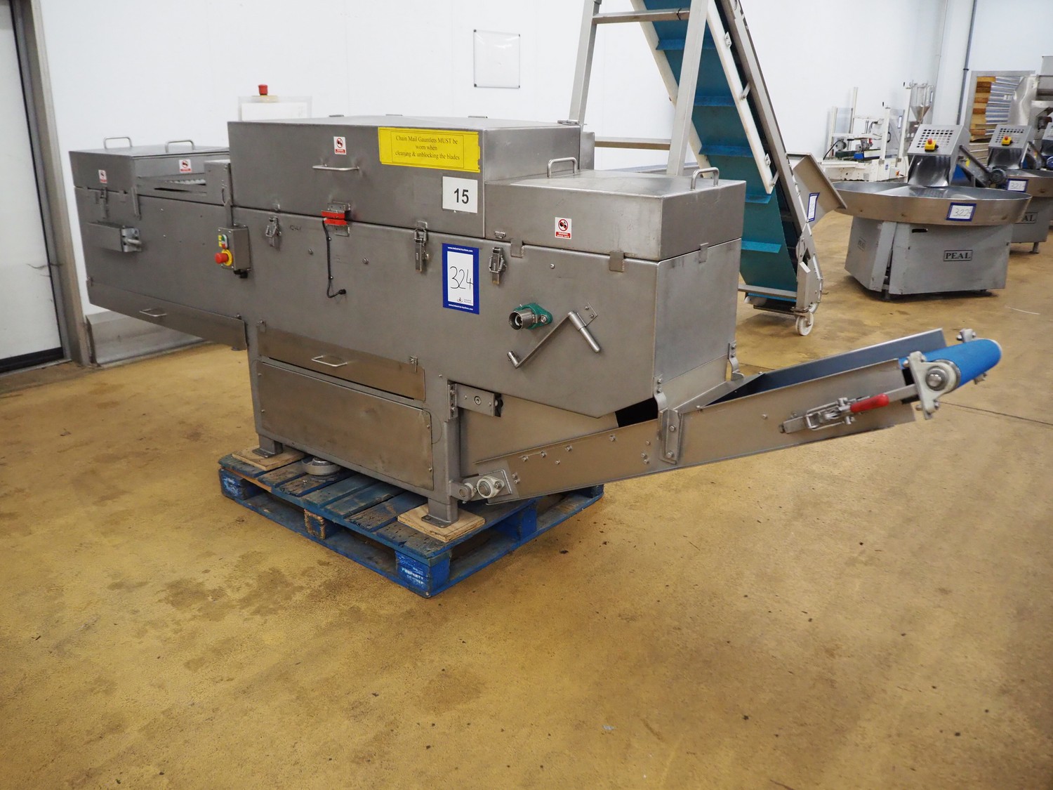 Genmac dicer, model: Cubeking 2700, dicing set: 20 mm x 20 mm or 25 mm x 25 mm, loading station width: 500 mm, plastic belt, belt width: 350 mm, capacity: approximately 500 kg/h, total dimensions: 3100 mm x 800 mm x 1450 mm.