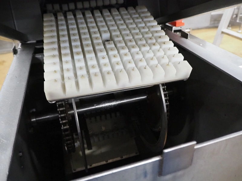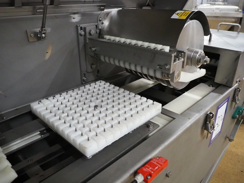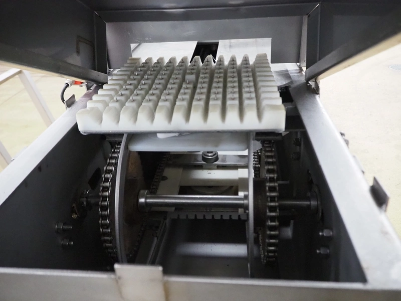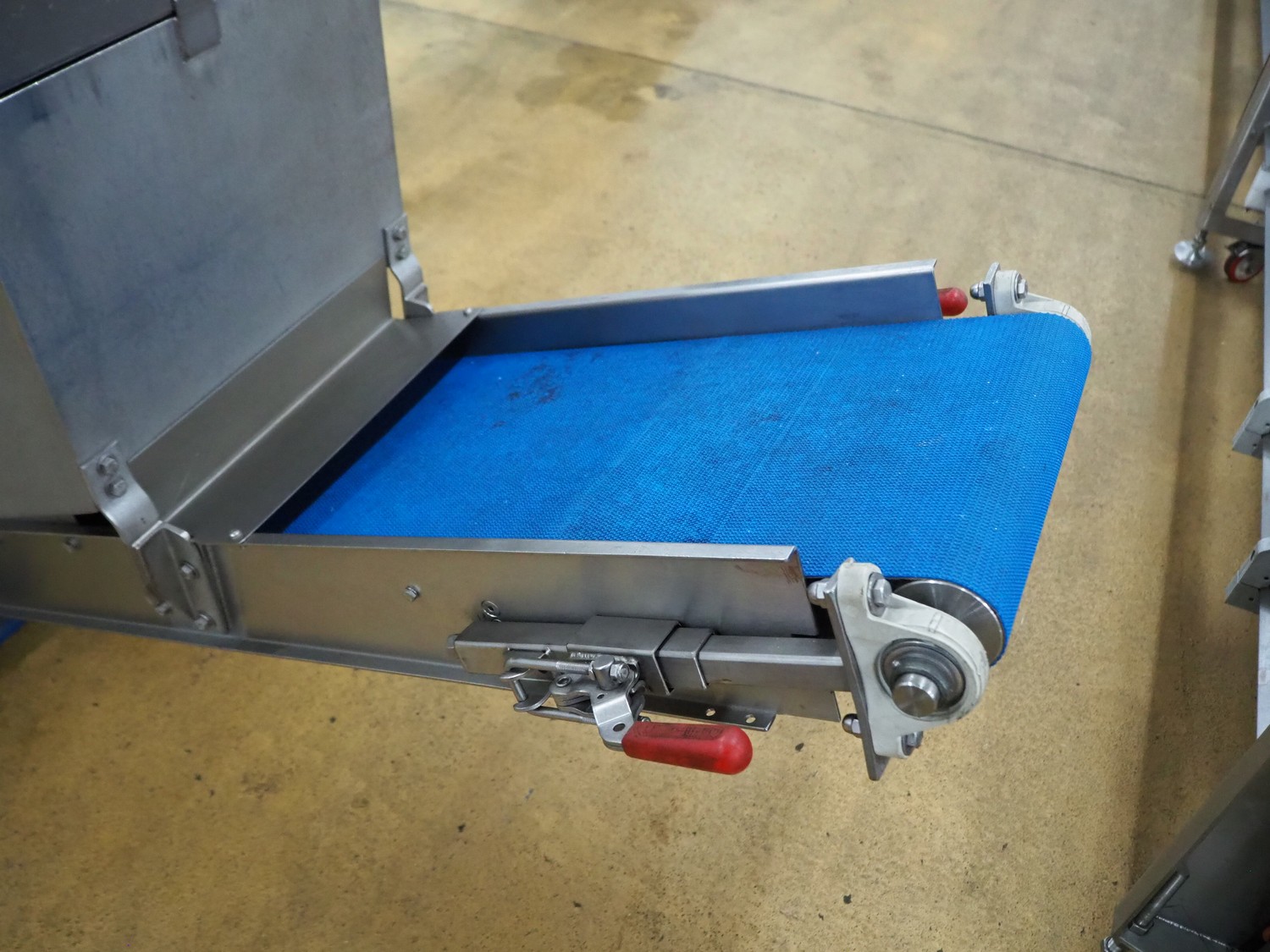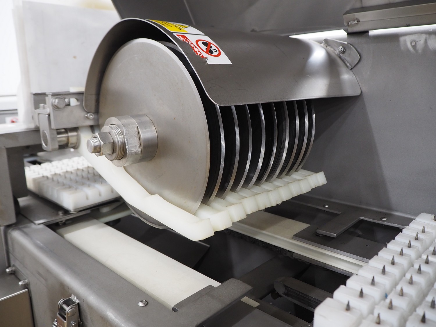 Genmac dicer, model: Cubeking 2700, dicing set: 20 mm x 20 mm or 25 mm x 25 mm, loading station width: 500 mm, plastic belt, belt width: 350 mm, capacity: approximately 500 kg/h, total dimensions: 3100 mm x 800 mm x 1450 mm.