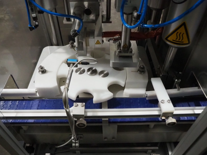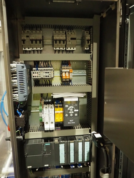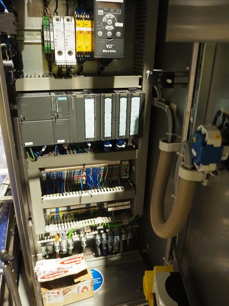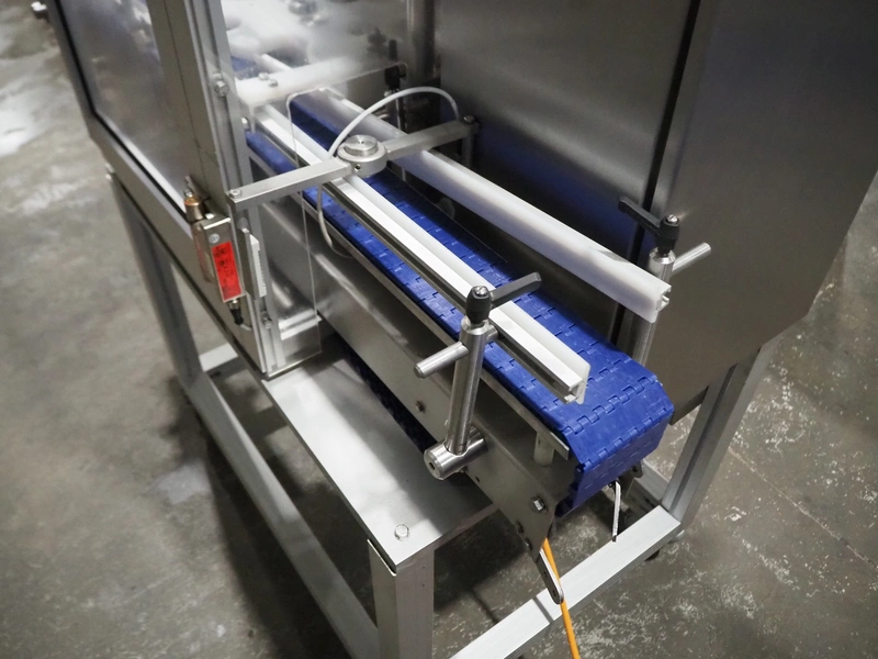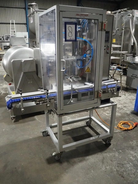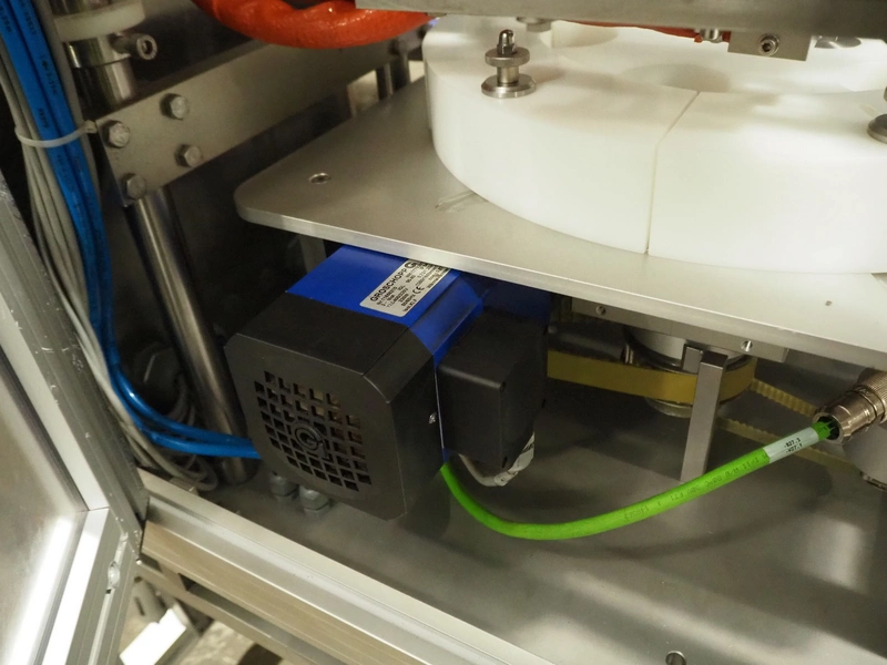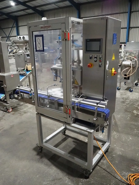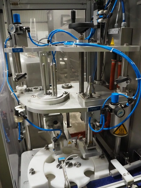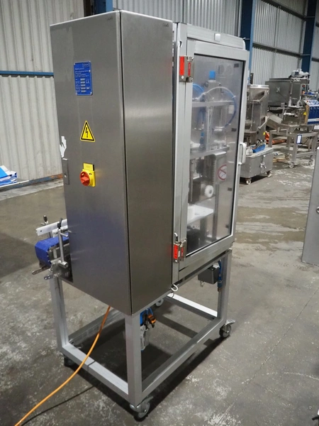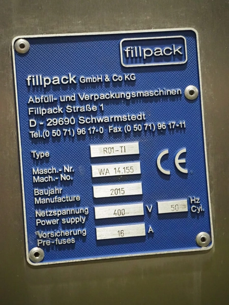 Fillpack mobile bottle/can filling machine, type: R01-TI, number: WA 14.155, year of construction: 2015, 400 V, 50 Hz, 16 A, plastic mesh belt, belt width: 100 mm, diameter bottle/can: 650 mm, total dimensions: 1600 mm x 720 mm x 1890 mm.