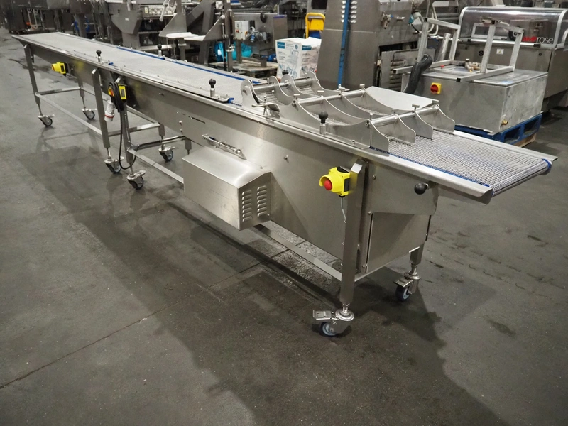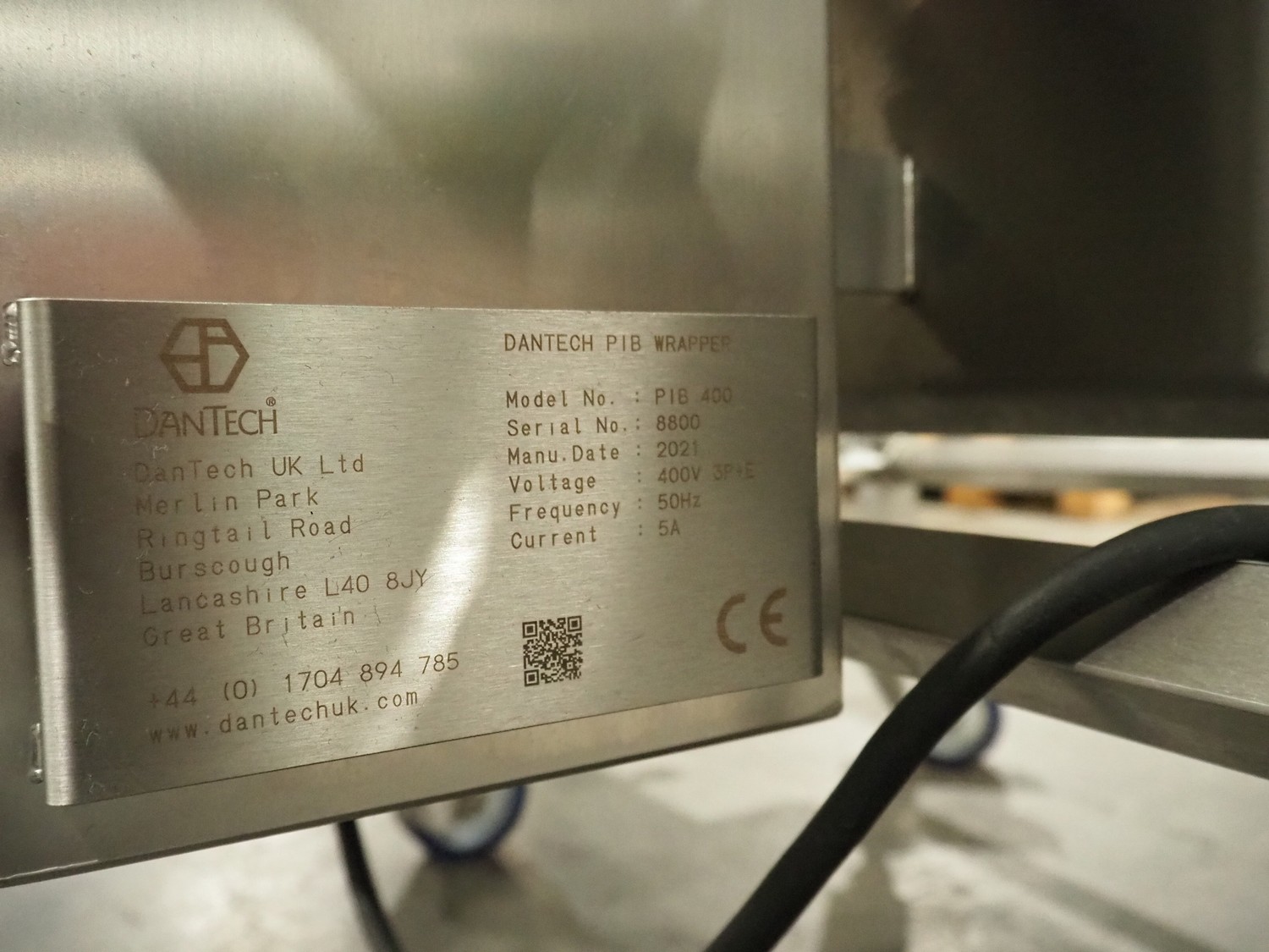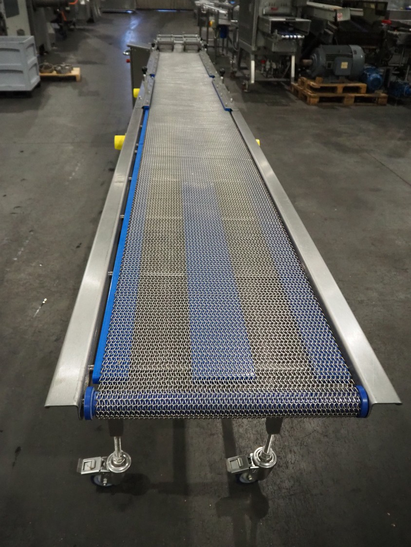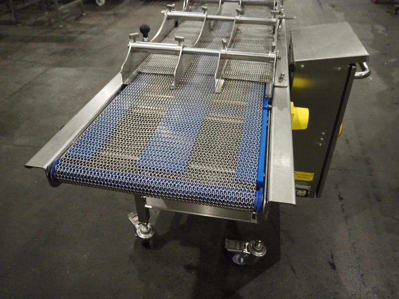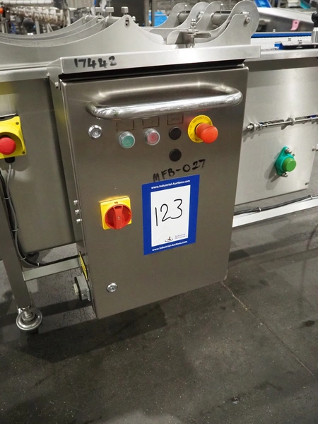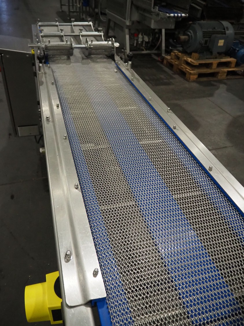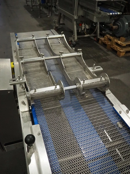 DanTech UK Ltd pig in a blanket wrapper, model: PIB 400, serial number: 8800, year of construction: 2021, 400 V, 3 Ph, 50 Hz, 5 A, s/s mesh belt, belt width: 400 mm, (3x) 150 mm, total dimensions: 5700 mm x 1000 mm x 1000 mm.
