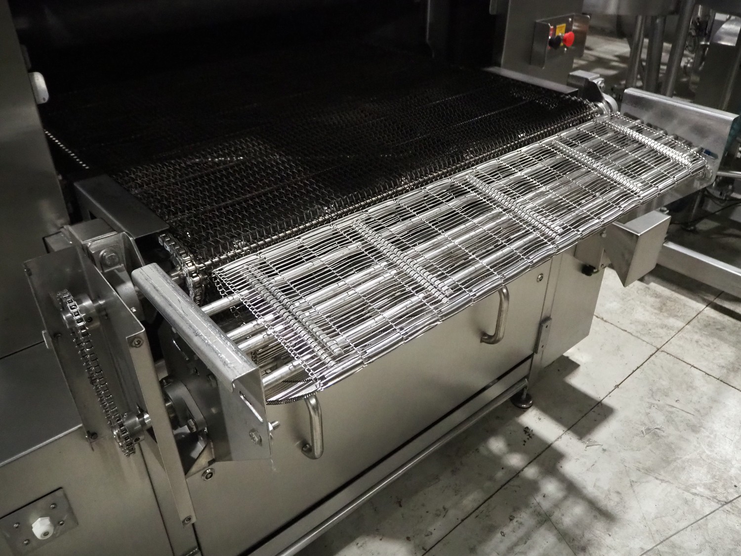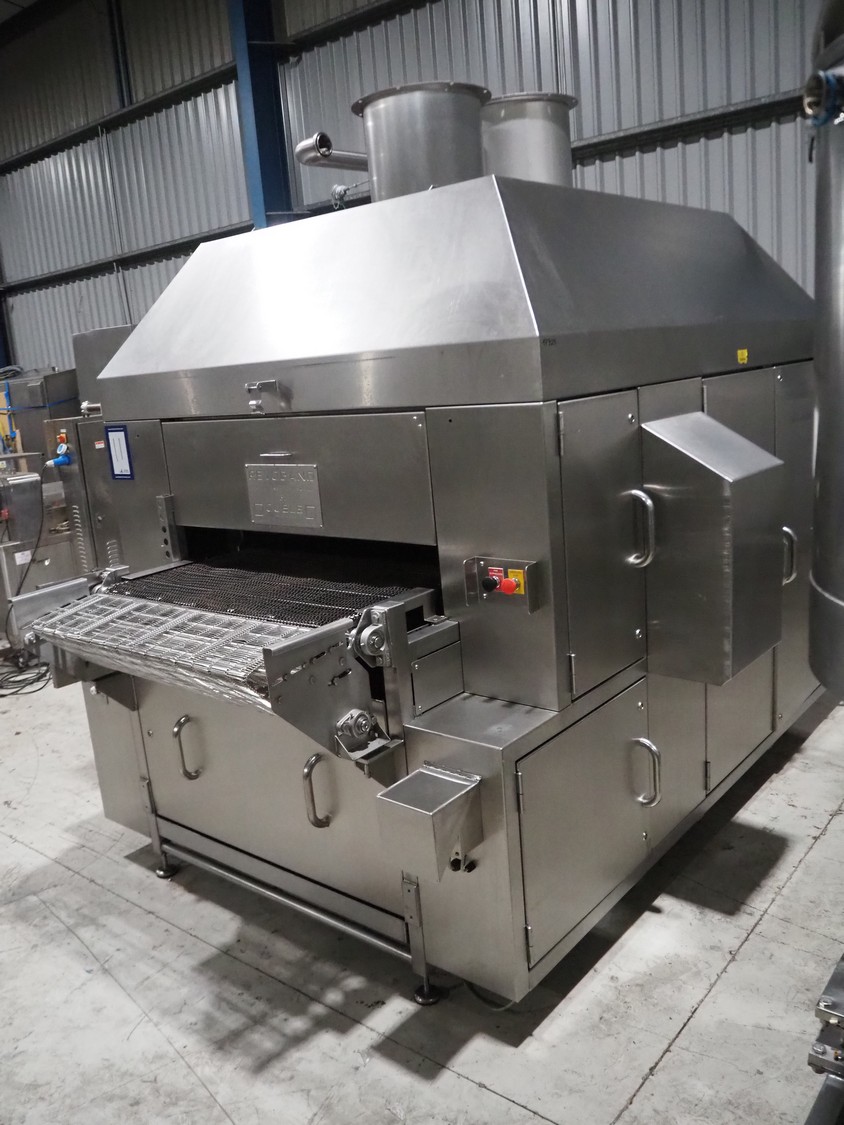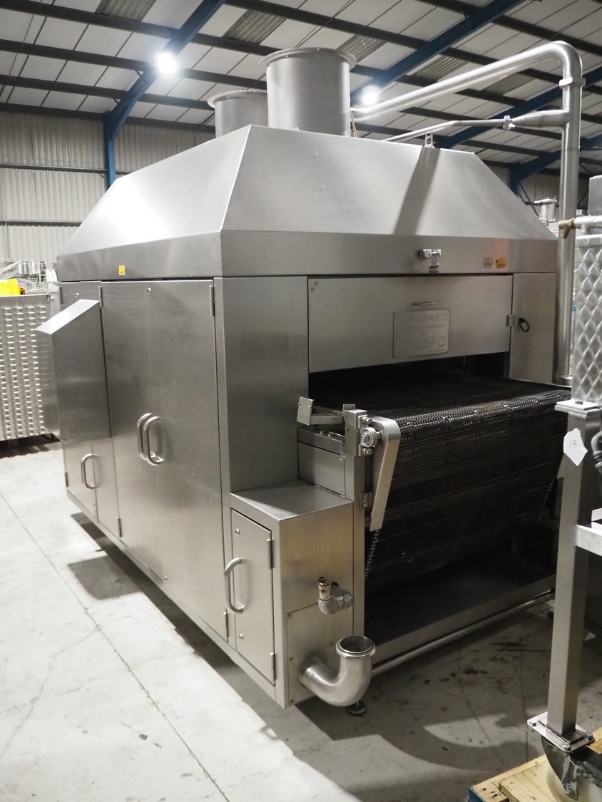 Revoband char grill, s/s mesh belt, belt width: 1000 mm, clearance: 1150 mm x 130 mm, total dimensions: 3300 mm x 2200 mm x 2650 mm.