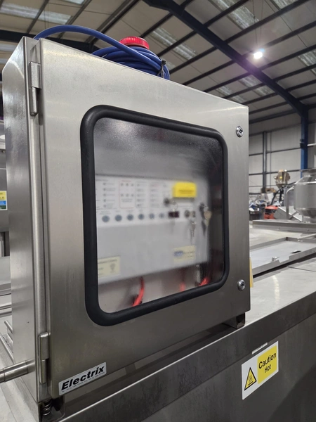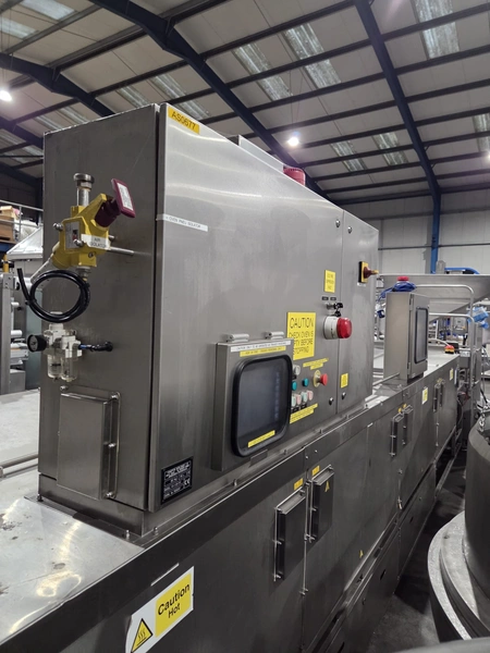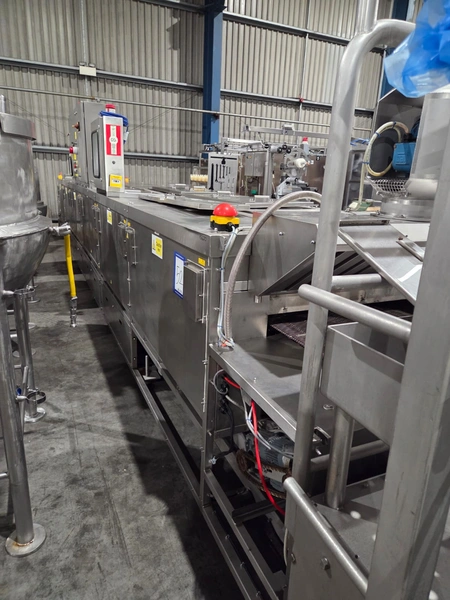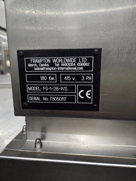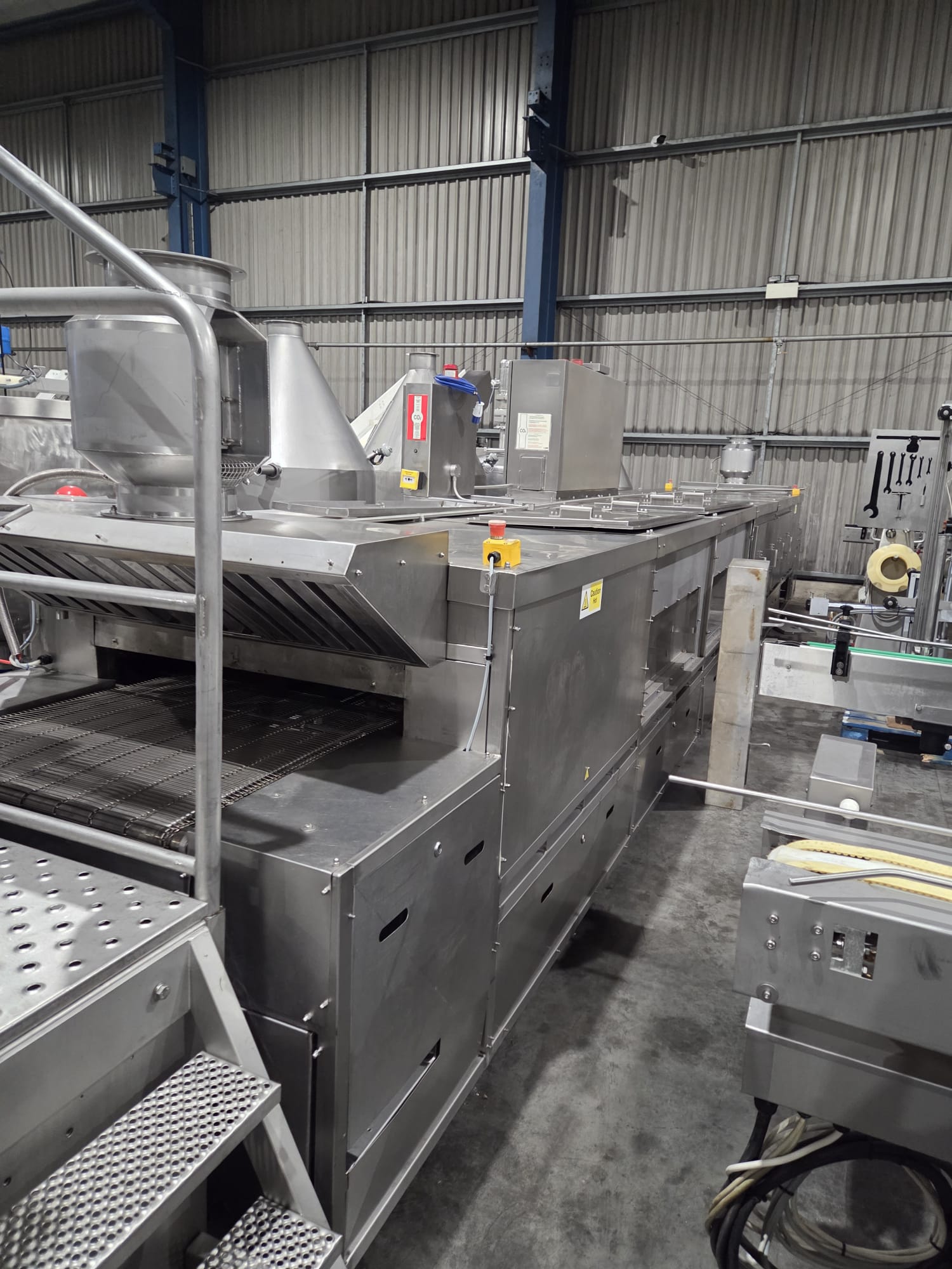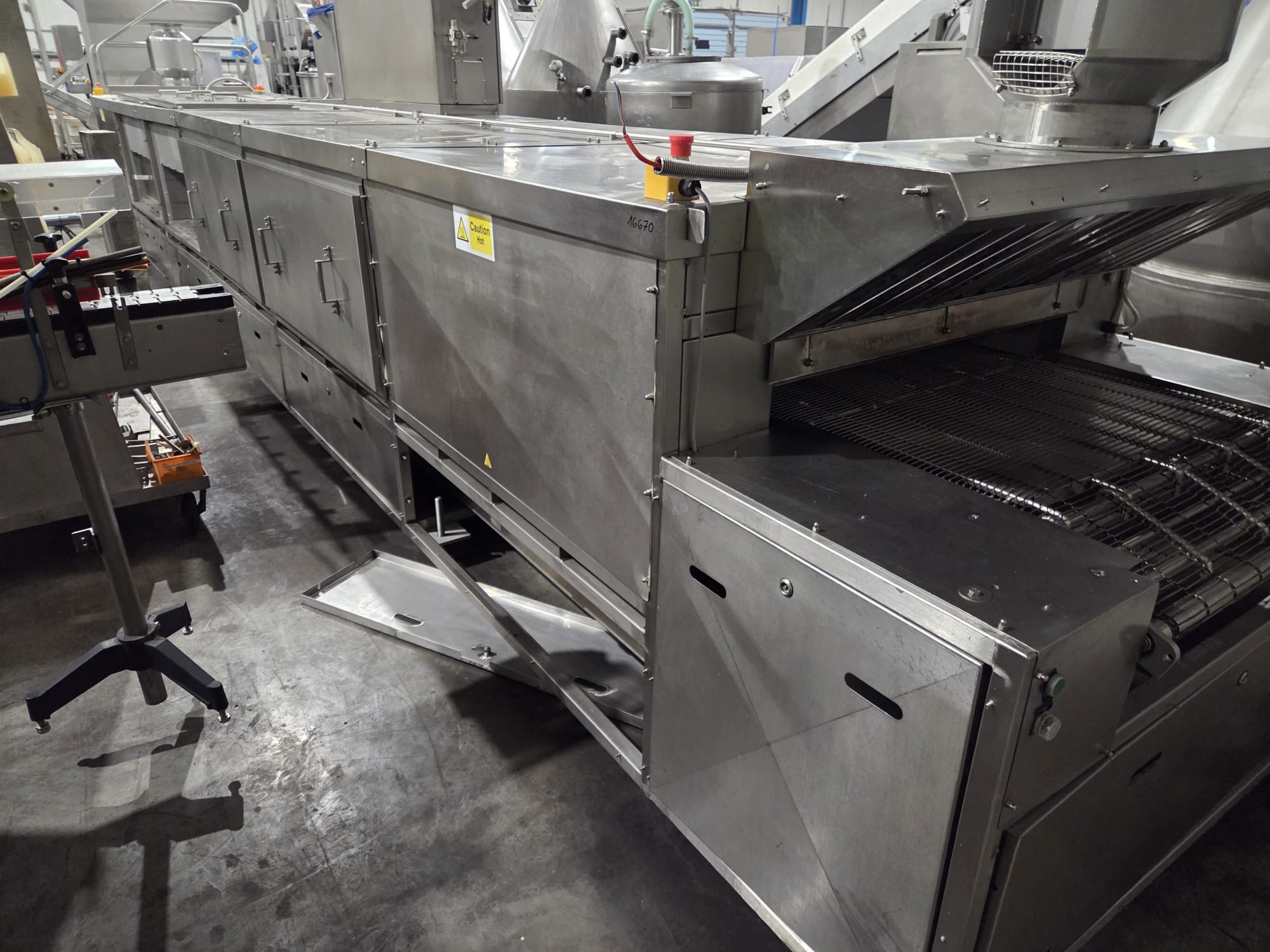 Frampton grill tunnel, model: FG-1-28-P/S, serial number: 78050117, 415 V, 3 Ph, 180 kW, s/s belt, belt width: 800 mm, belt length: 10000 mm, total dimensions: 10000 mm x 1600 mm, 2350 mm
