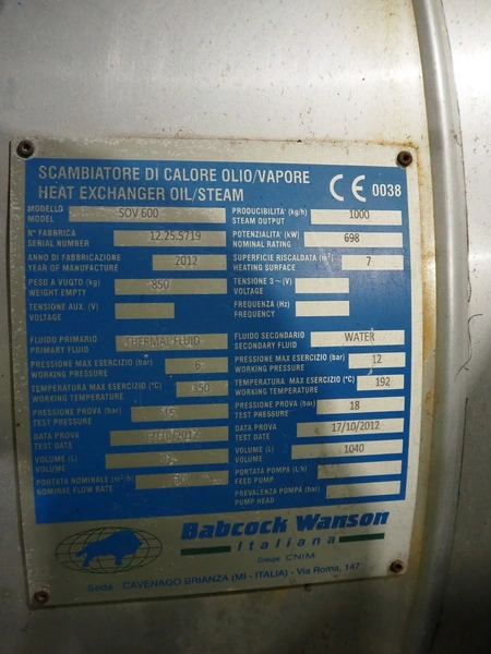 Babcock Wanson heat exchanger oil/steam, model: SOV600, serial number: 12.25.5719, year of construction: 2012, dimensions: 2500 mm x 1600 mm x 2200 mm.