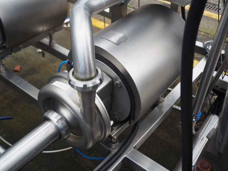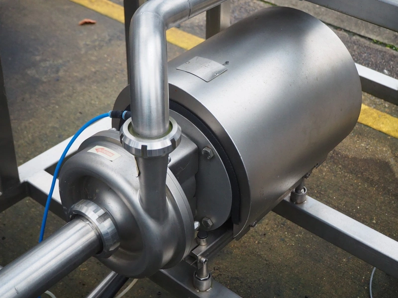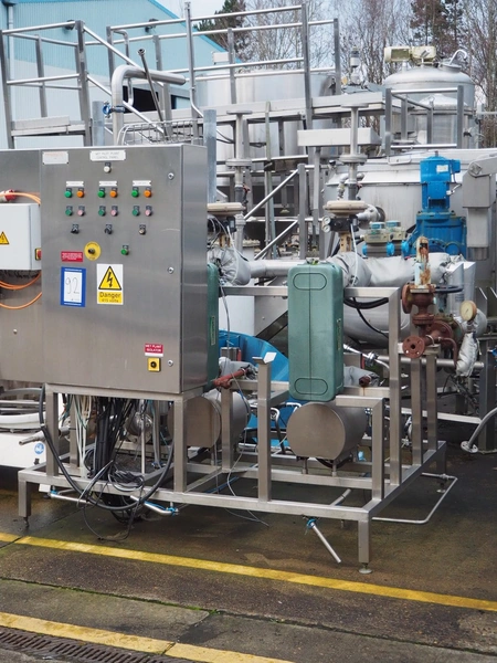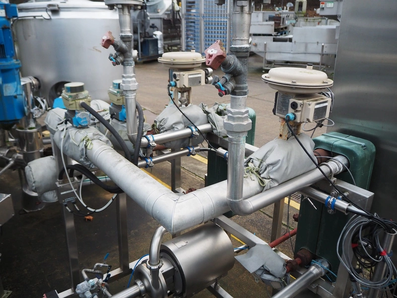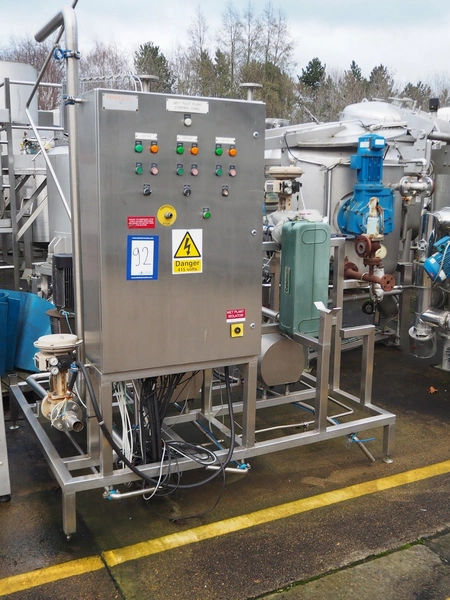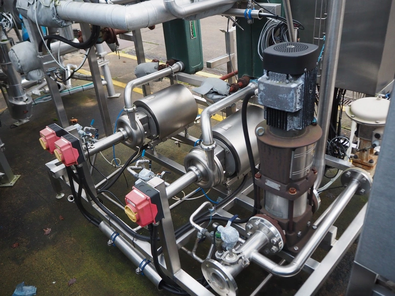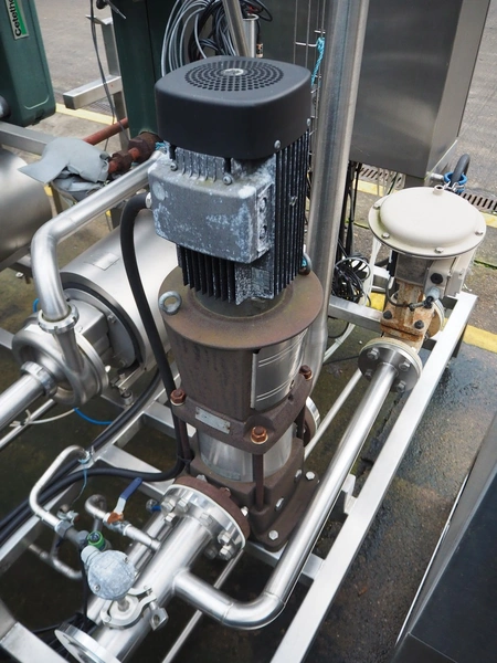 S/s skid with 2 Alfa Laval centrifugal pumps, type: (2x) LKH-20/153/FSS 3.0 KW, Grundfos circulation pump, valves and heat exchangers, dimensions: 2300 mm x 1550 mm x 2470 mm.