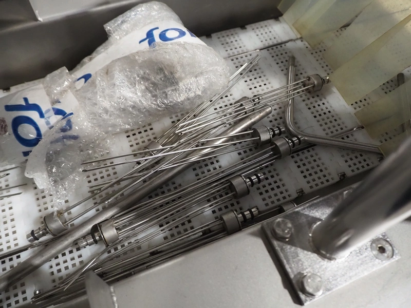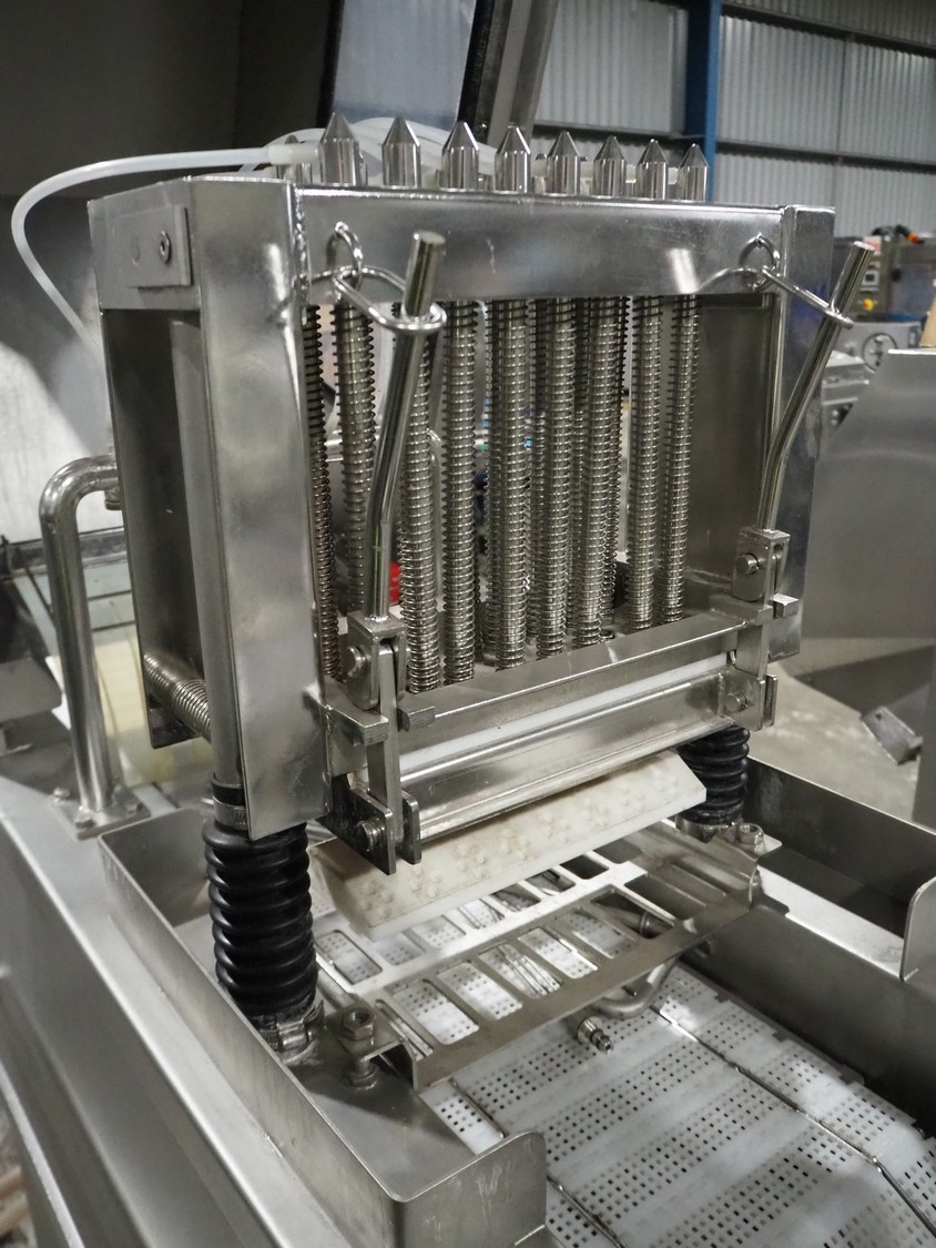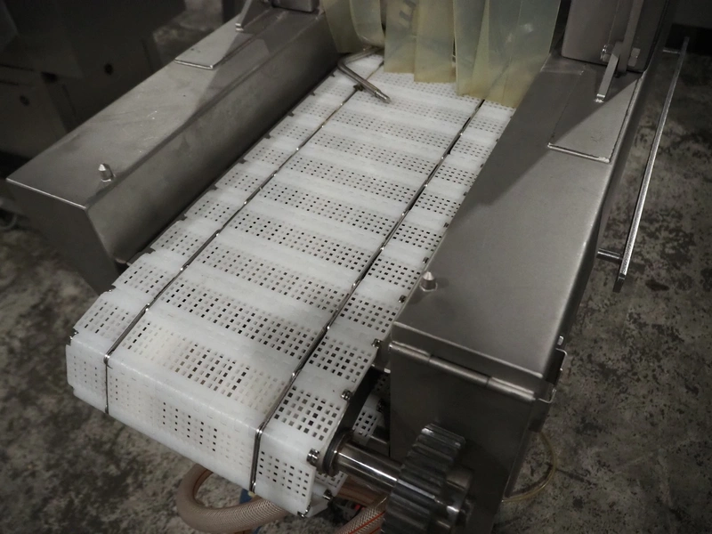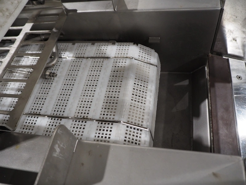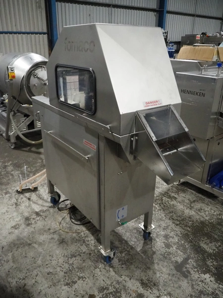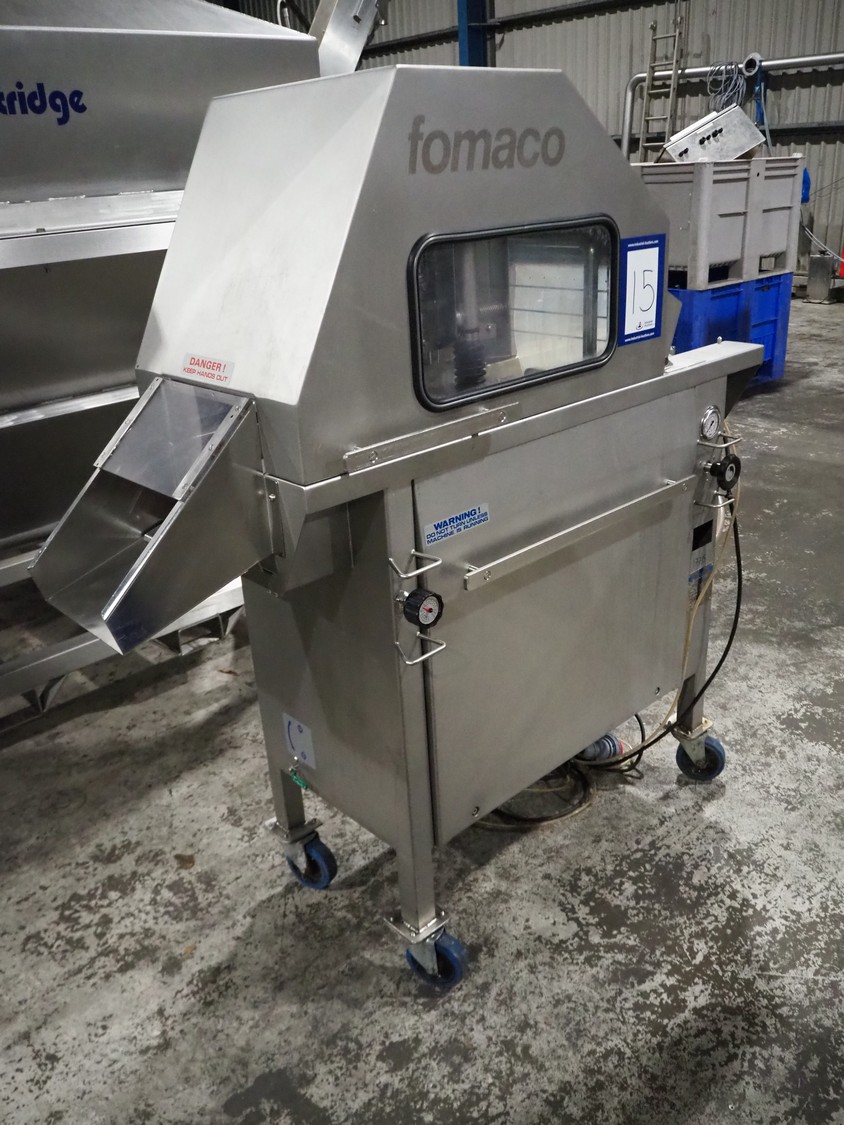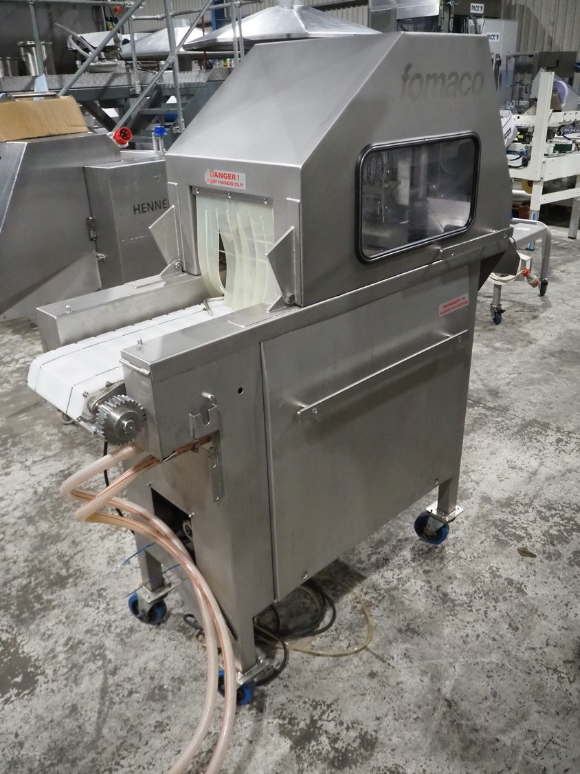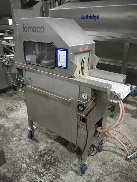 Fomaco mobile injector, model: FGM 16/64F, number: 10850-2006, 400 V, 3 Ph, 50 Hz, 2.8 A, plastic mesh belt, belt width: 240 mm, total dimensions: 1700 mm x 600 mm x 1670 mm.