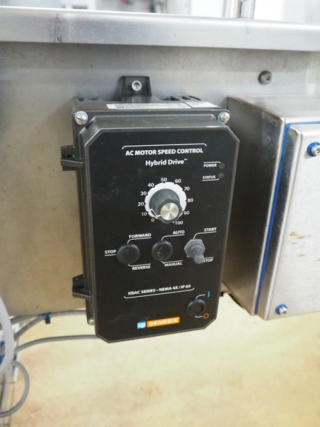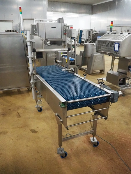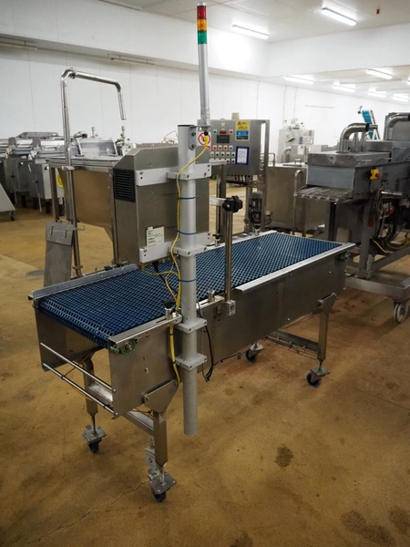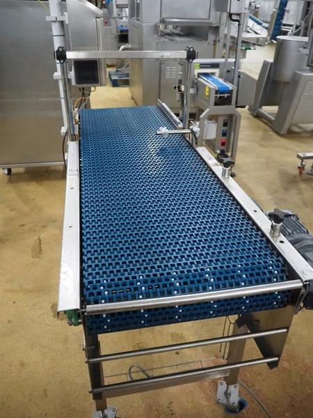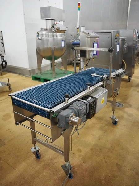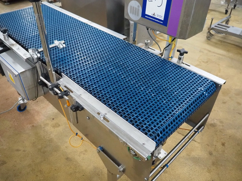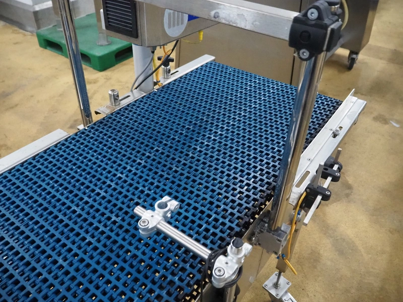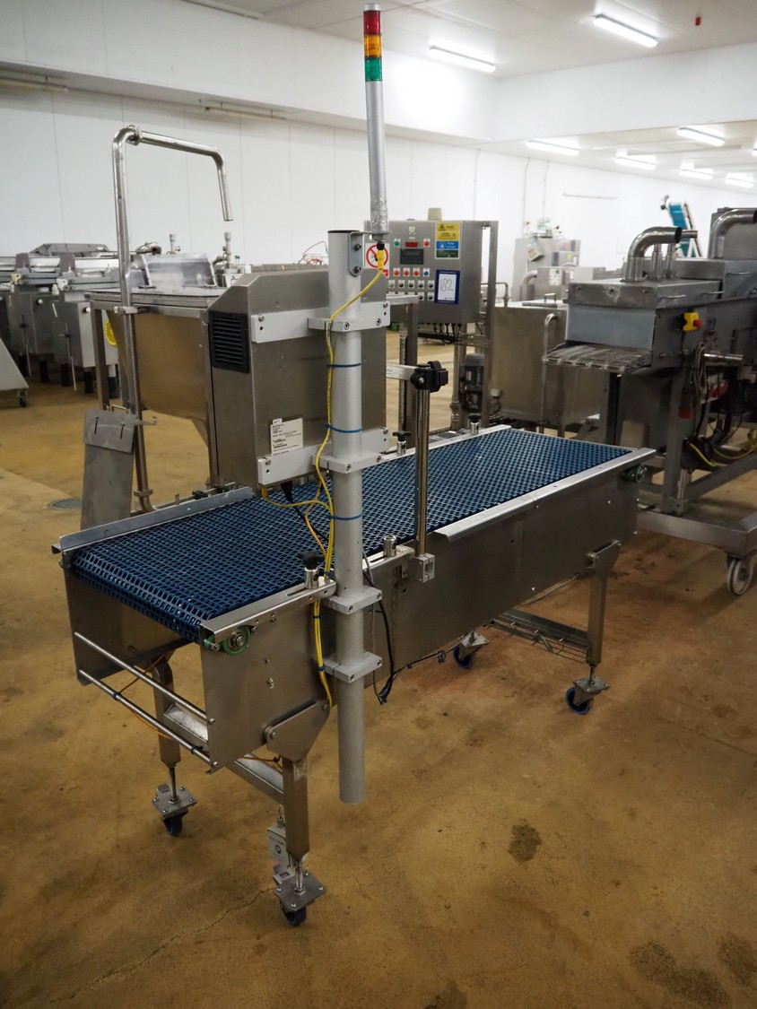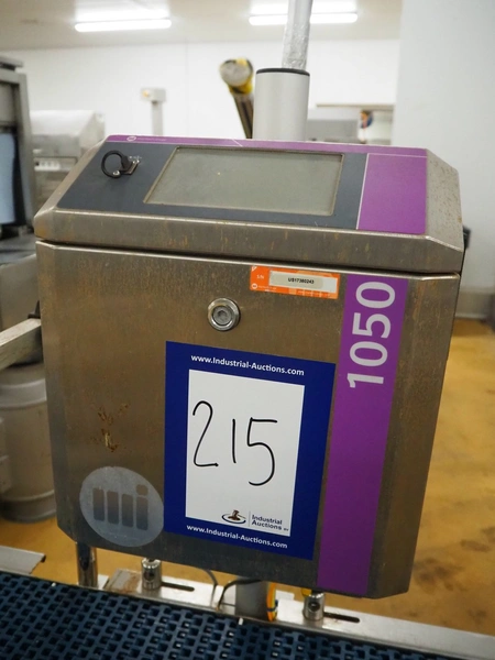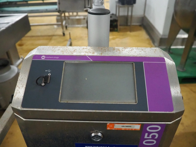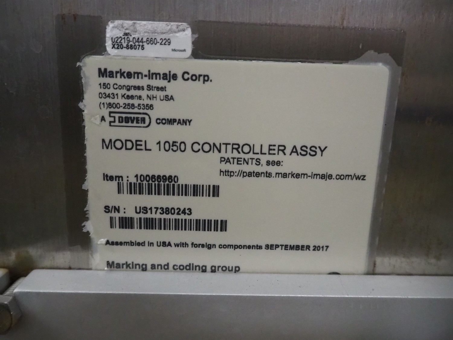 Markem-Imaje Corp. Inkjet printer with mobile transport belt, model: 1050 Controller ASSY, serial number: US17380243, plastic mesh belt, belt width: 500 mm, total dimensions: 1830 mm x 800 mm x 1980 mm.